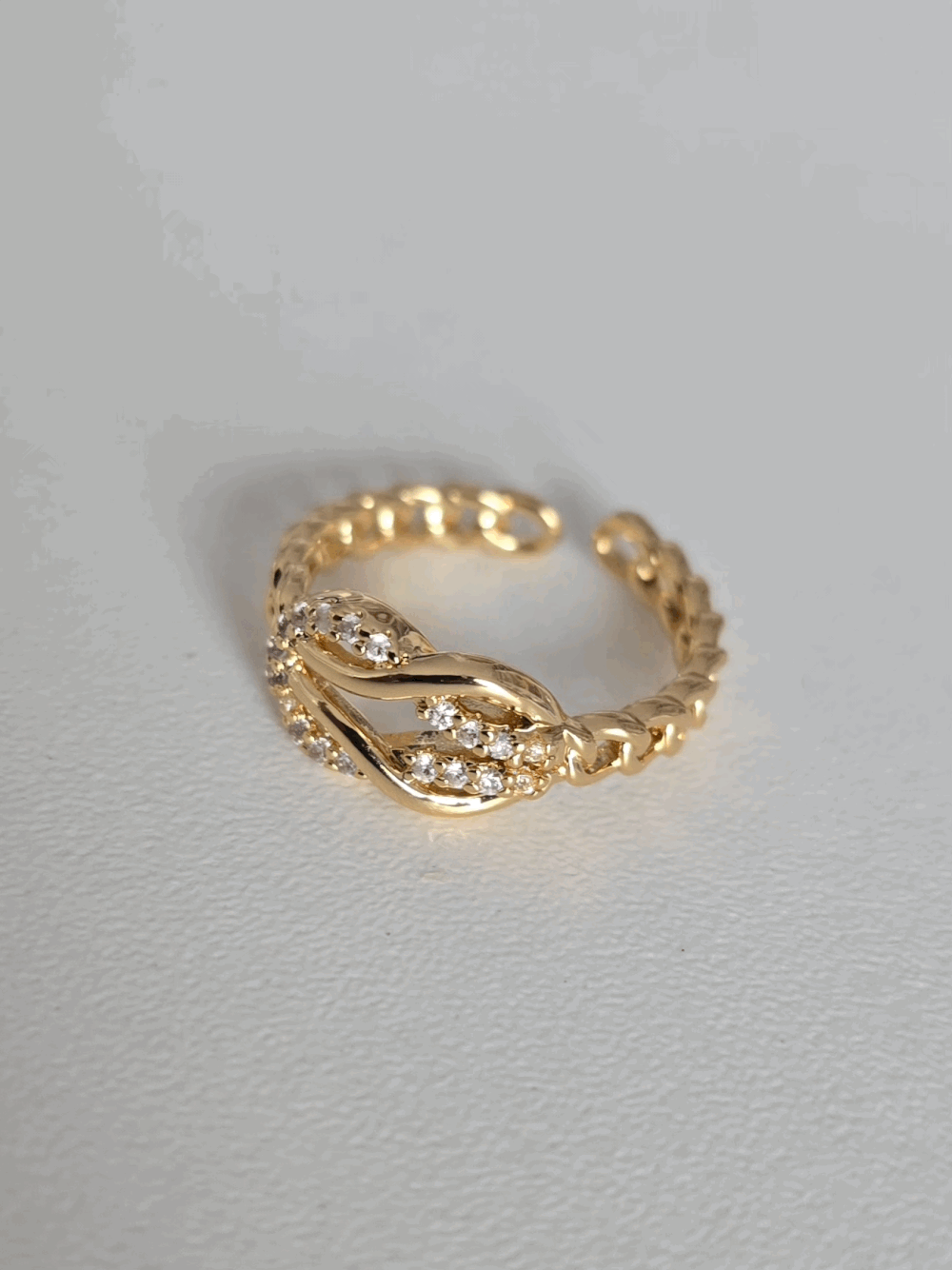 Le centre de la bague, large de 0,8 cm, est orné d’un motif doré finement travaillé, représentant deux courbes entrelacées dans un équilibre parfait. Chaque ligne en métal doré épouse les strass scintillants qui ornent délicatement la pièce, captant la lumière à chaque mouvement. Le résultat : un éclat subtil mais présent, qui attire le regard sans jamais en faire trop.