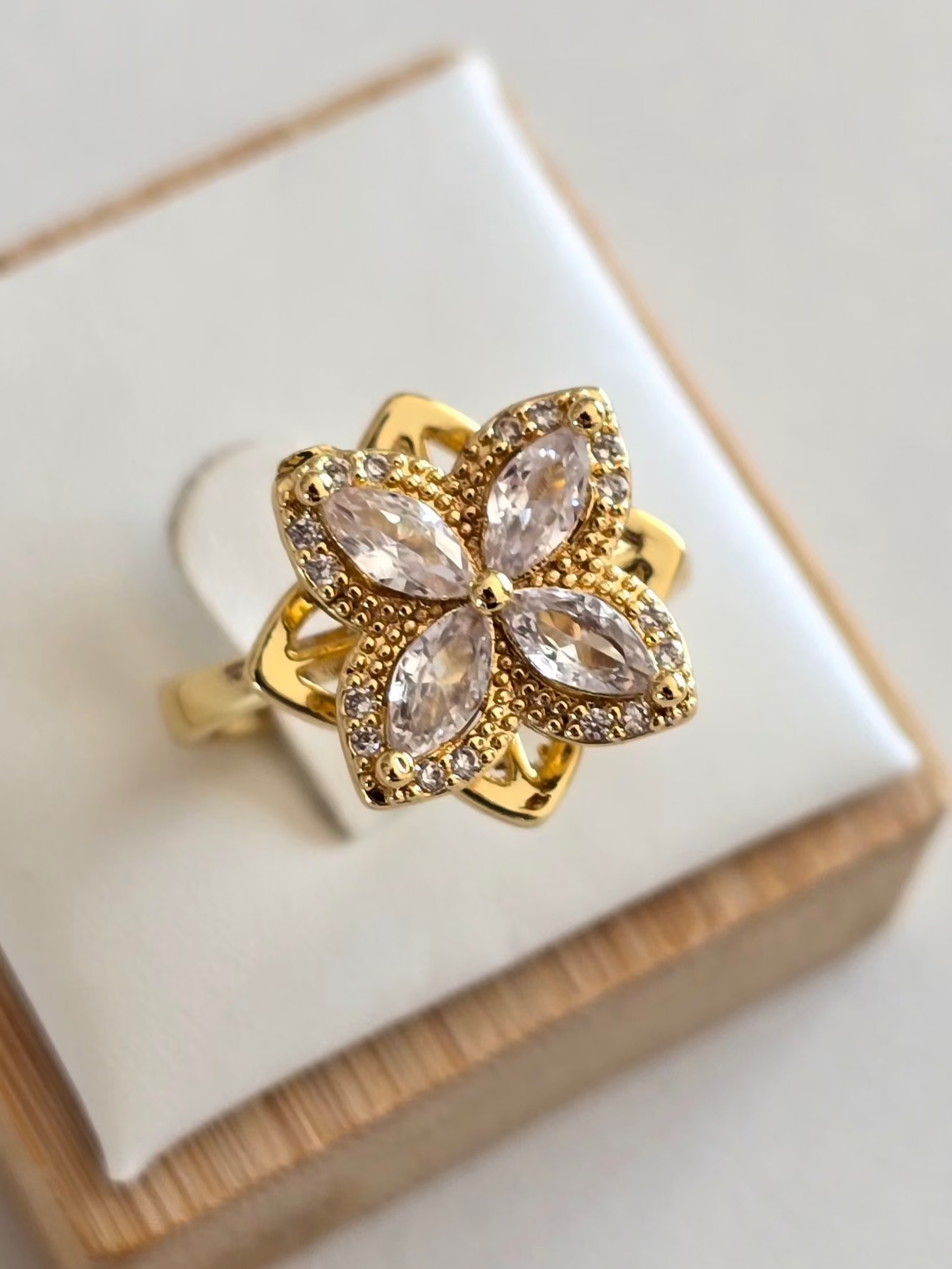 La bague Elyna associe élégance et originalité avec son design floral raffiné. Sa particularité ? Sa fleur centrale de 17 mm tourne comme un hand spinner, ajoutant une touche ludique et unique à ce bijou scintillant.