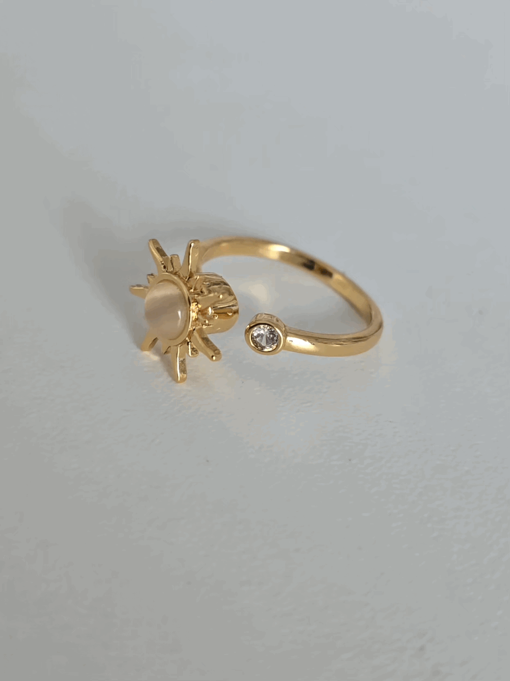 Le centre de la bague représente un soleil doré de 1,3 cm de diamètre, monté sur un axe discret qui lui permet de tourner librement. Comme un mini hand spinner intégré à votre bijou, il offre une expérience à la fois visuelle et sensorielle, parfaite pour les moments de stress ou simplement pour s’amuser discrètement.