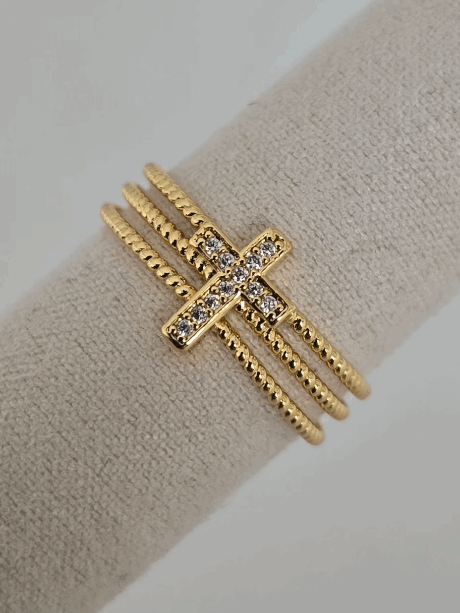 Composée de trois anneaux dorés parallèles, cette bague évoque l’harmonie et l’équilibre. Son nom, Trinité, fait écho à cette structure unique, représentant l’union parfaite entre style, force et douceur. La croix centrale, incrustée de strass scintillants, attire immédiatement le regard sans jamais en faire trop. Elle incarne à la fois la foi, la protection et l’élégance.
