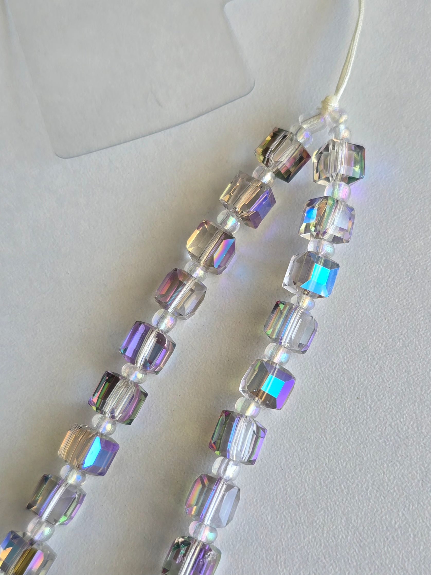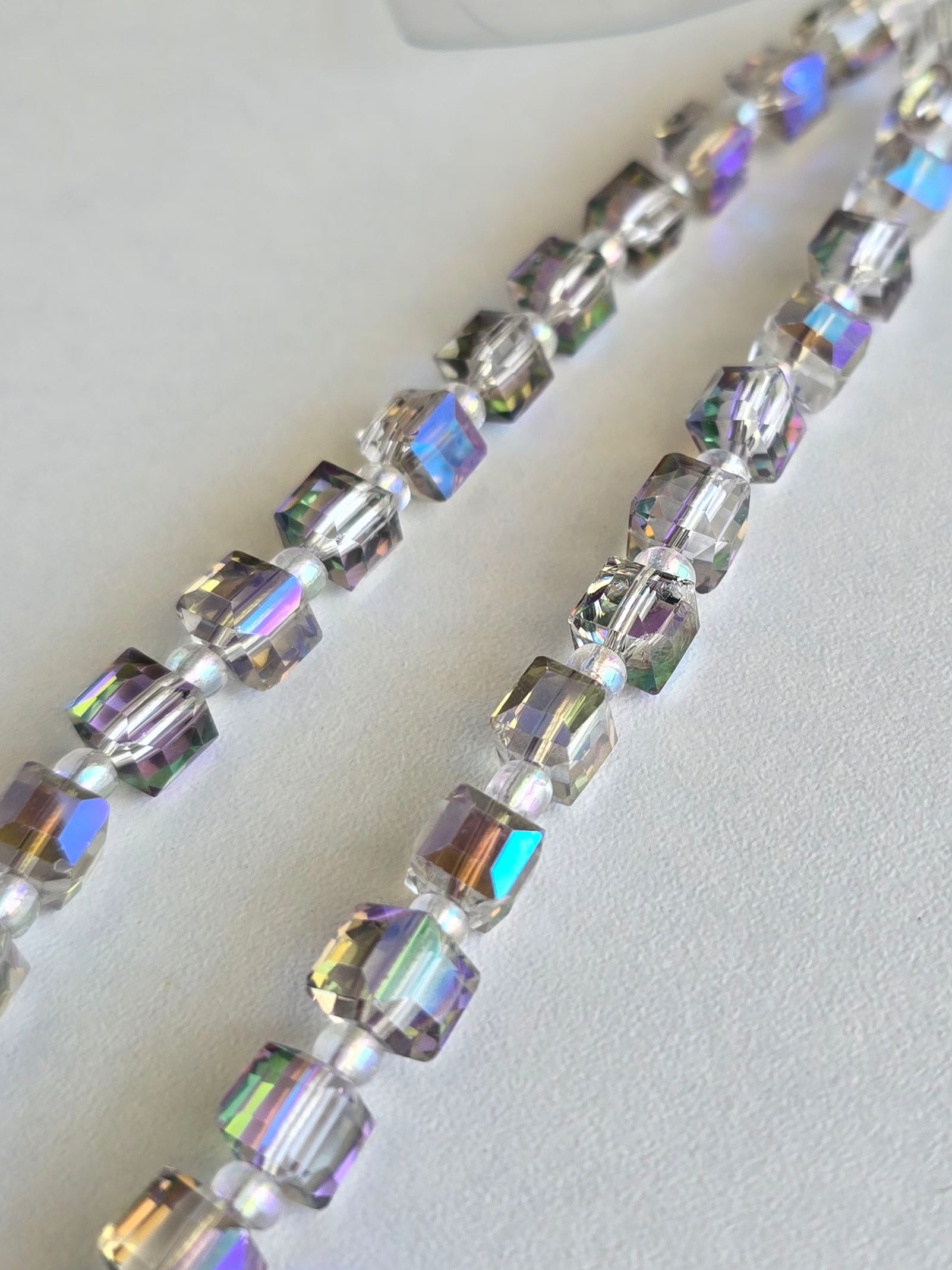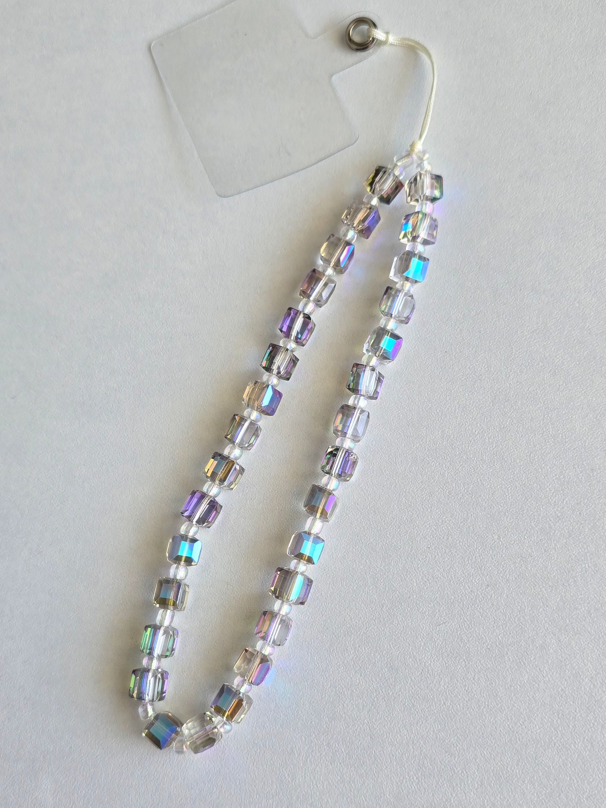 Brillez de mille feux avec le bijou de téléphone Prismia, un accessoire élégant et éclatant qui transforme votre smartphone en véritable bijou. Ce modèle est composé de perles cubiques translucides aux reflets multicolores prismatiques, séparées par de petites perles. Chaque mouvement relève de nouvelles nuances irisées, donnant à ce bijou une allure sophistiquée et moderne.