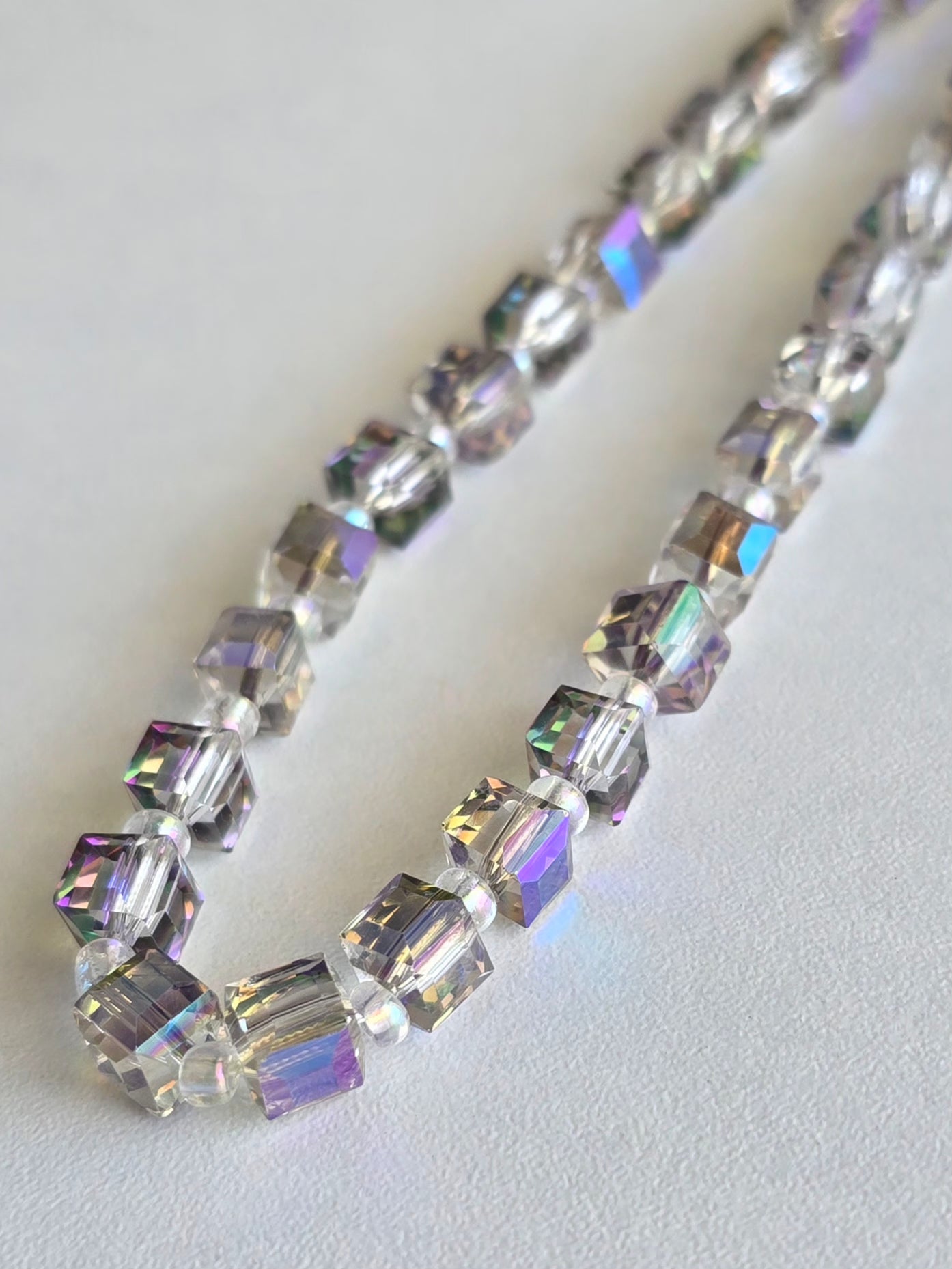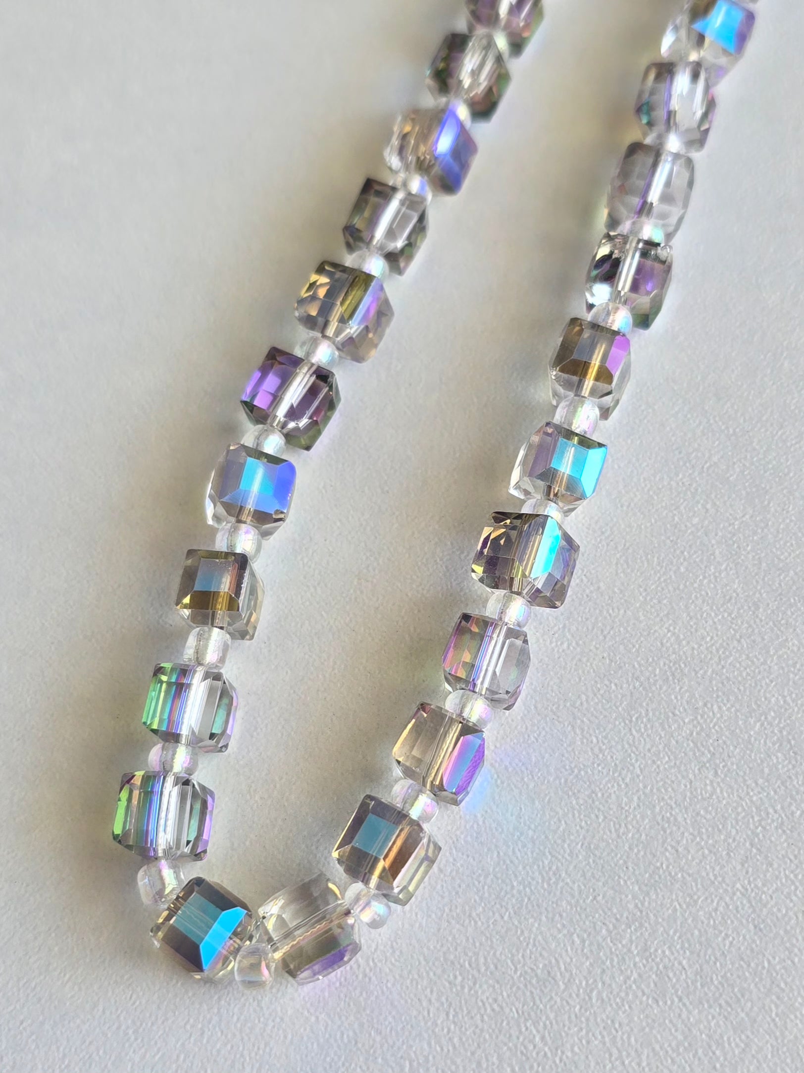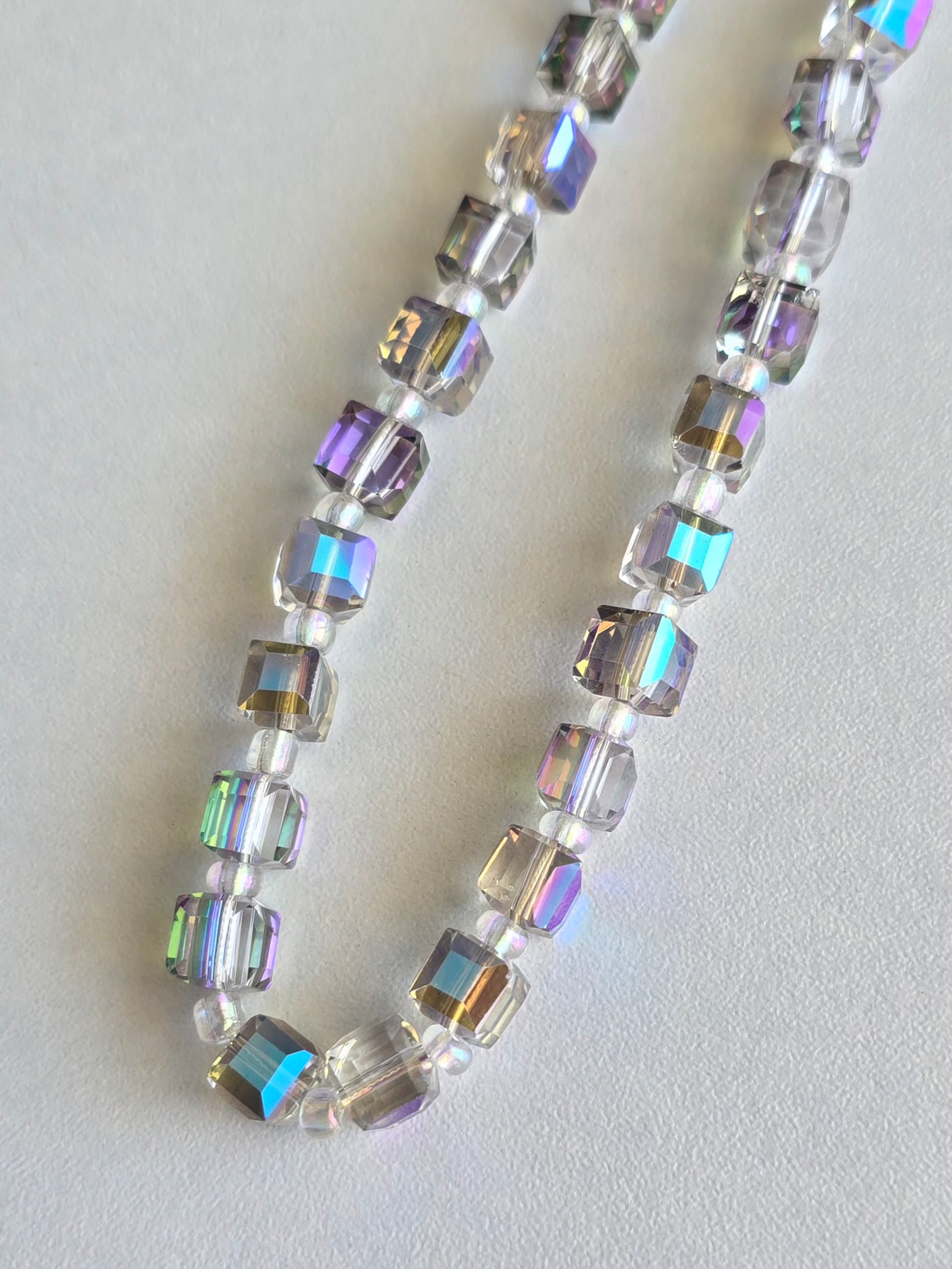 Brillez de mille feux avec le bijou de téléphone Prismia, un accessoire élégant et éclatant qui transforme votre smartphone en véritable bijou. Ce modèle est composé de perles cubiques translucides aux reflets multicolores prismatiques, séparées par de petites perles. Chaque mouvement relève de nouvelles nuances irisées, donnant à ce bijou une allure sophistiquée et moderne.