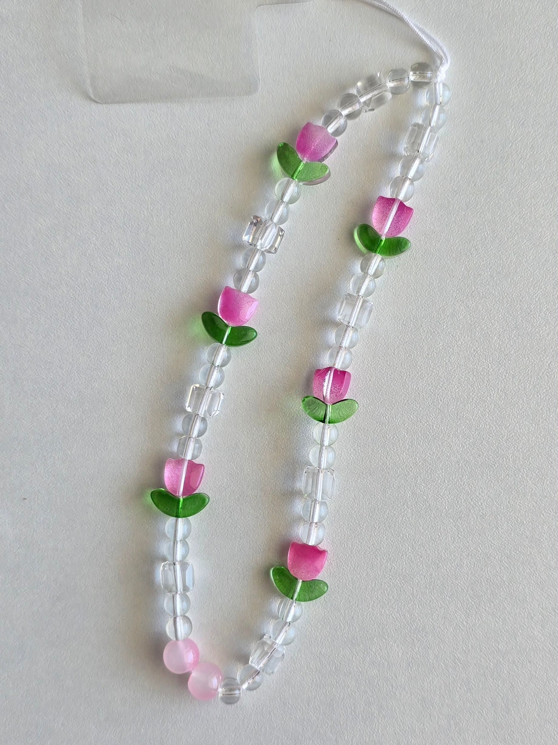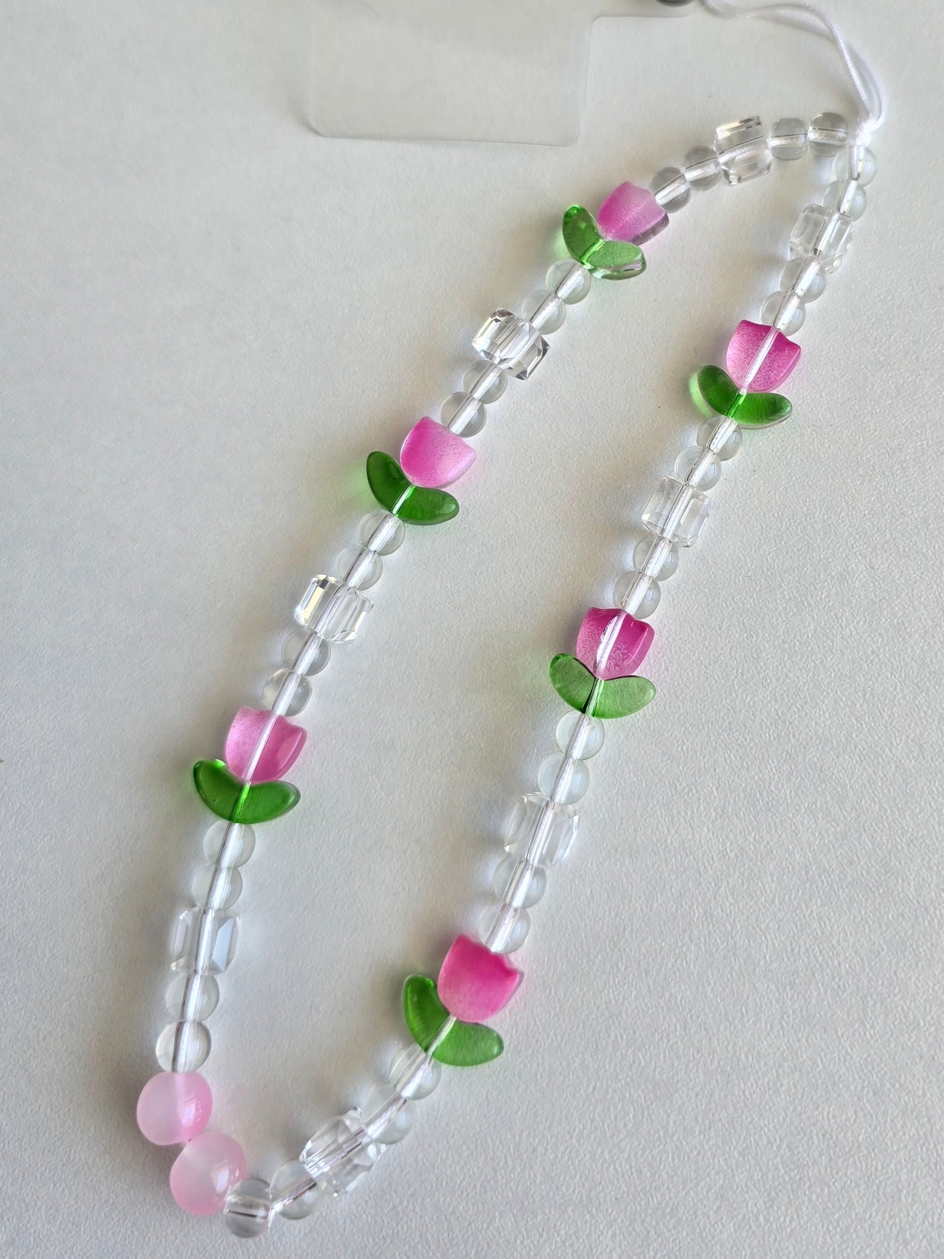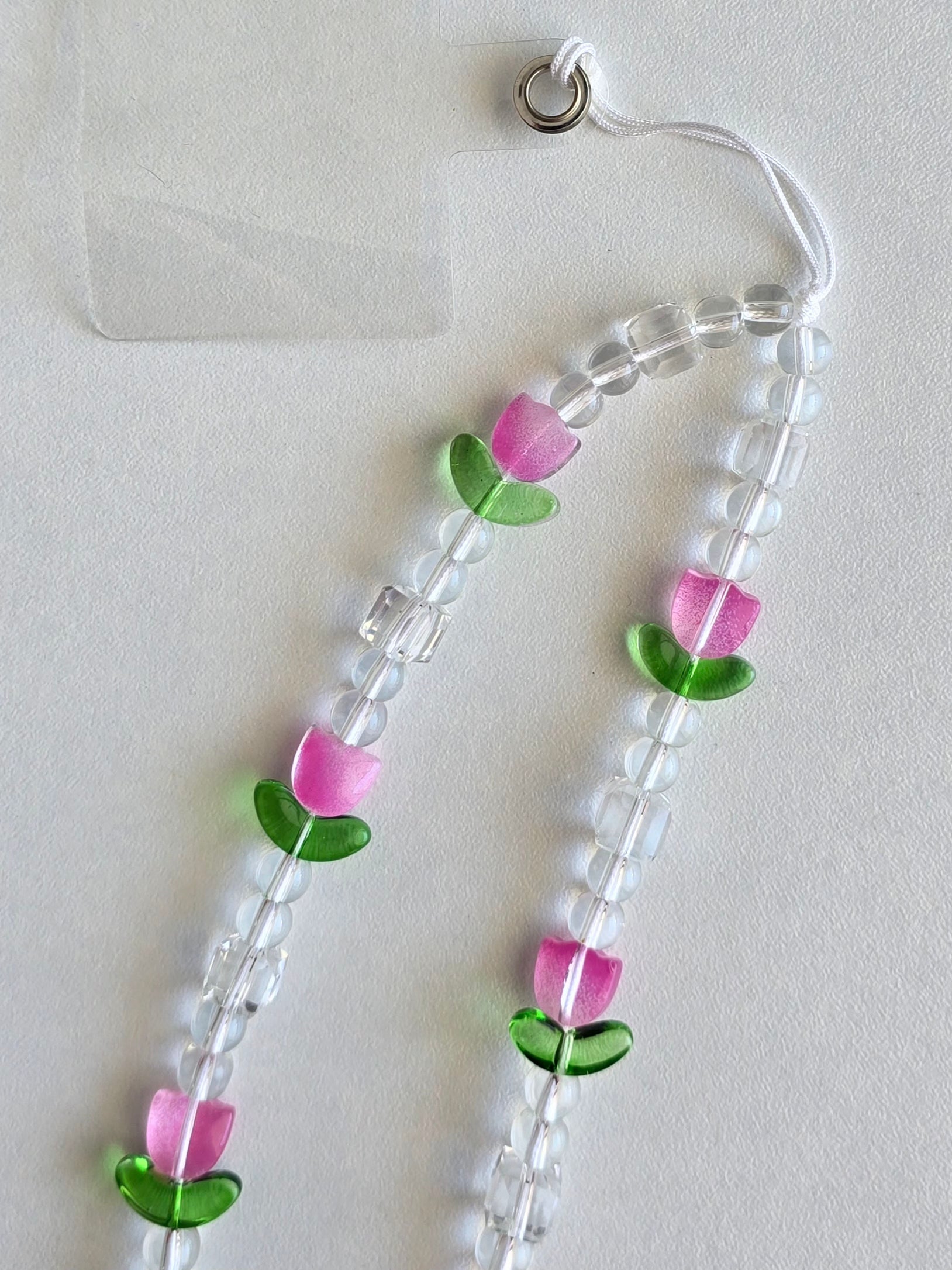 Apportez une touche fraîche et florale à votre smartphone avec le bijou de téléphone Tulipia, un accessoire élégant et original. Ce modèle est composé de perles transparentes et de jolies perles en forme de tulipes roses avec leurs feuilles vertes, séparées par des perles claires scintillantes. Un design printanier et raffiné qui respire la douceur et la féminité.