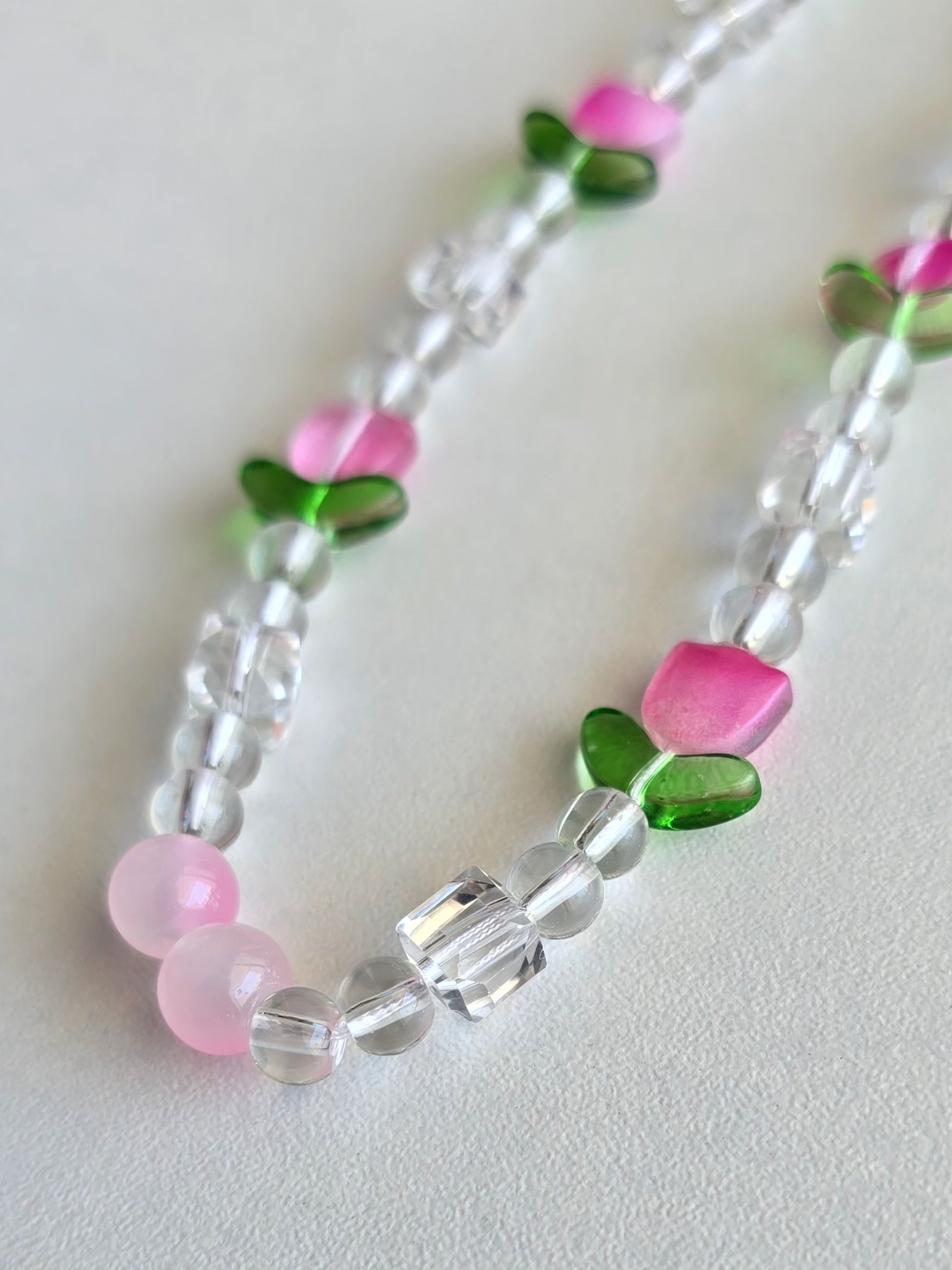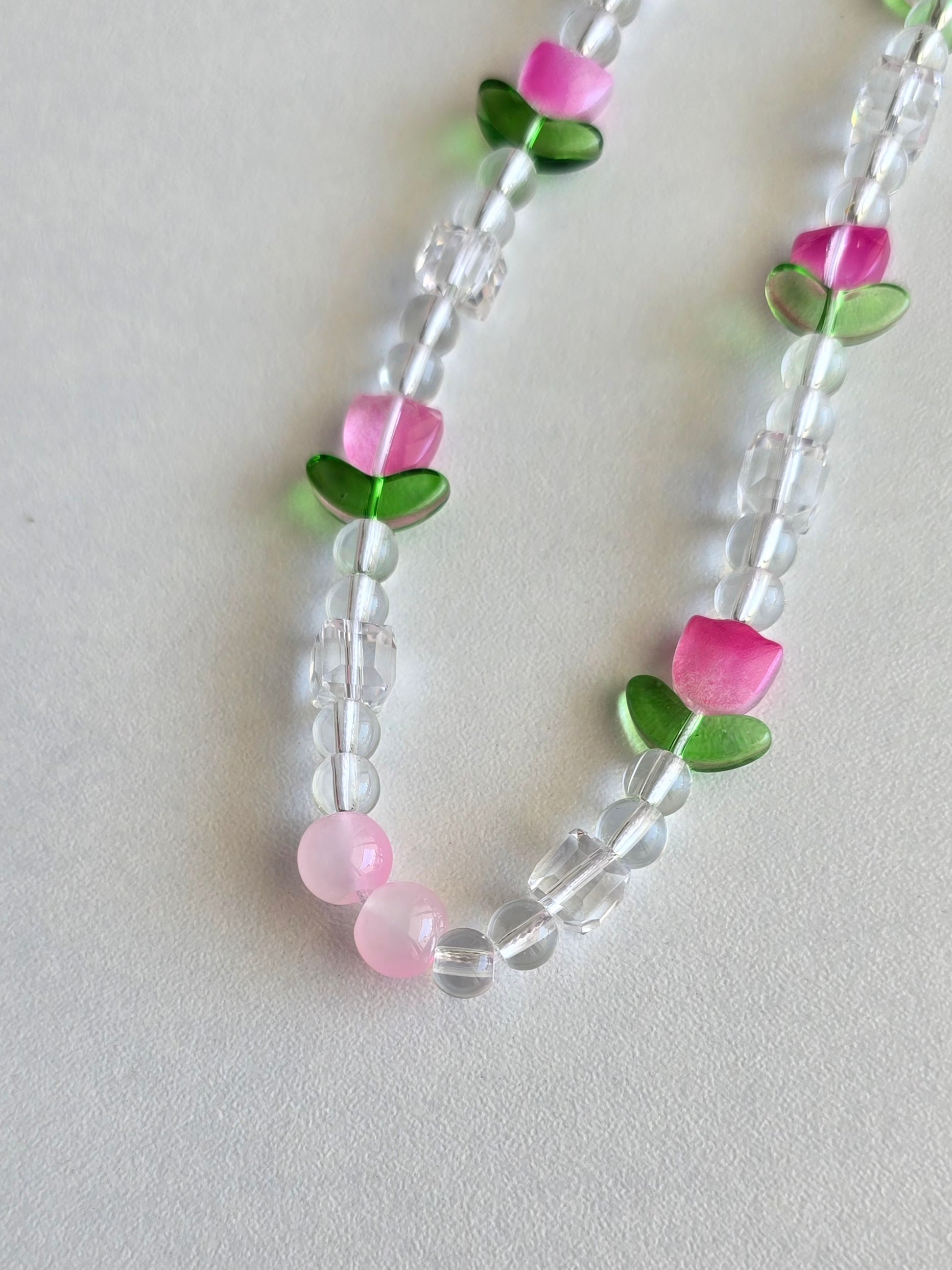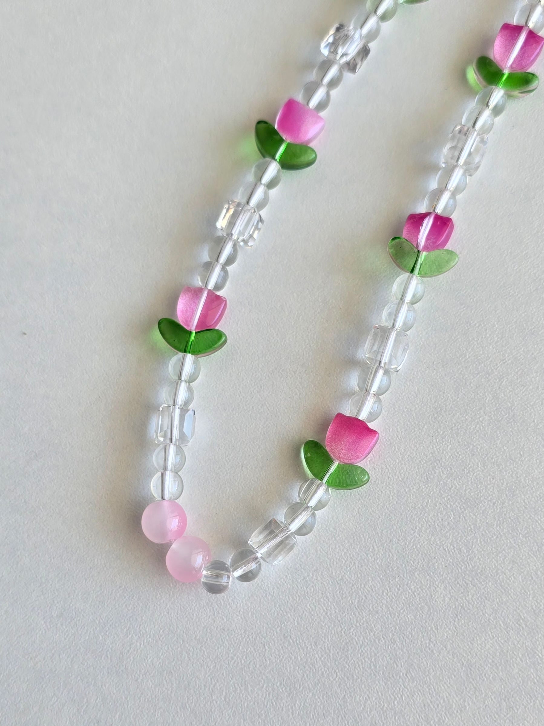 Apportez une touche fraîche et florale à votre smartphone avec le bijou de téléphone Tulipia, un accessoire élégant et original. Ce modèle est composé de perles transparentes et de jolies perles en forme de tulipes roses avec leurs feuilles vertes, séparées par des perles claires scintillantes. Un design printanier et raffiné qui respire la douceur et la féminité.