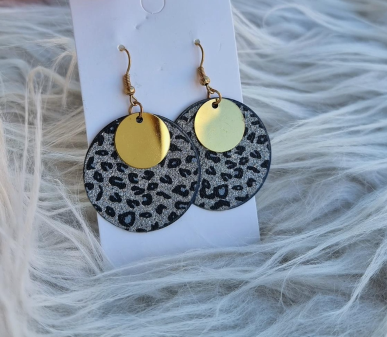 Trop jolie paire de boucles d'oreilles avec des motifs léopard noir et argenté pailleté. Avec cette petite touche doré qui fait tout son charme !