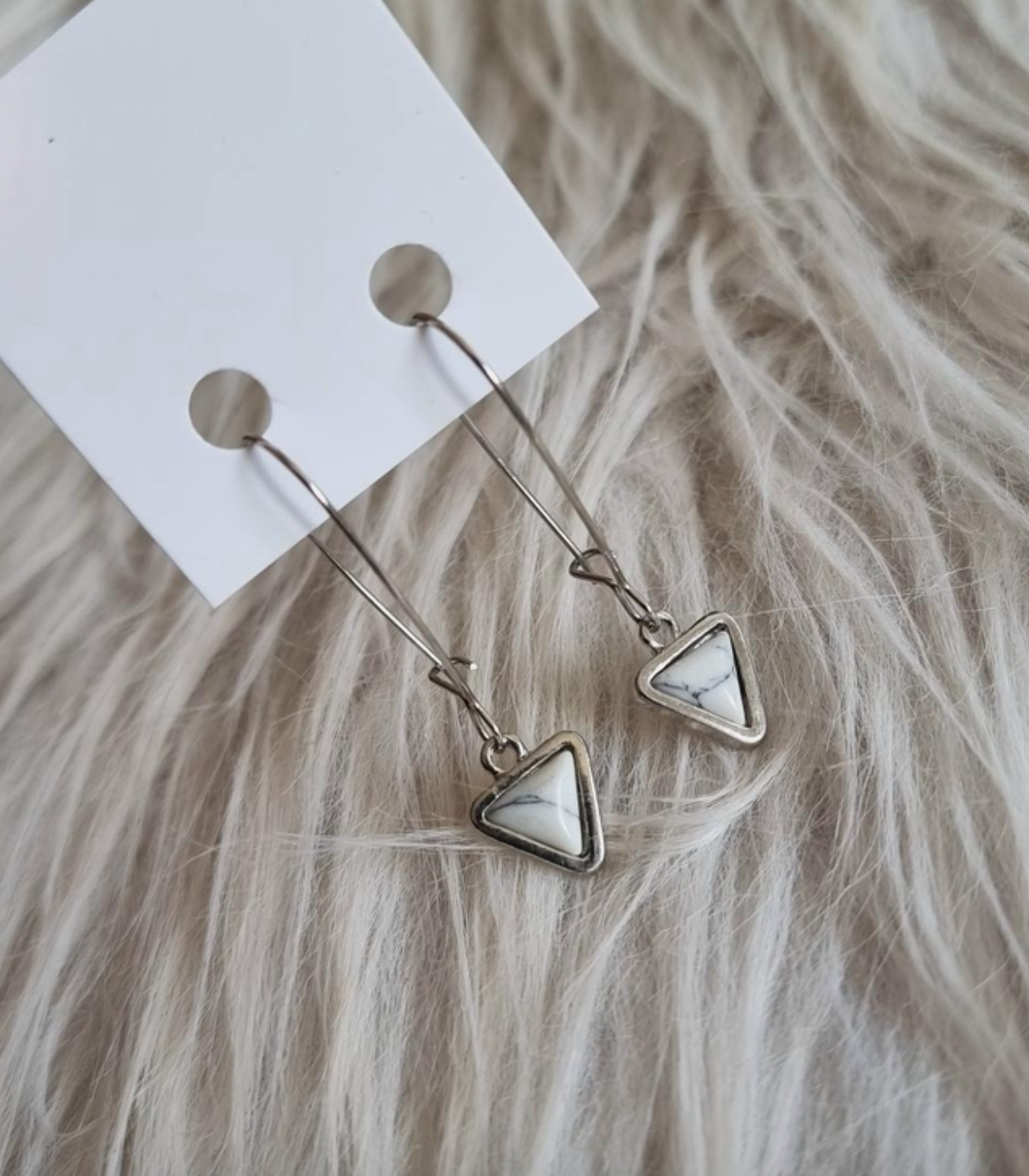 Jolie paire de boucles d'oreilles simple et chic, de couleur argenté avec le petit triangle marbré blanc/gris qui fait environ 1,10 cm. Longueur total 4,5 cm.
