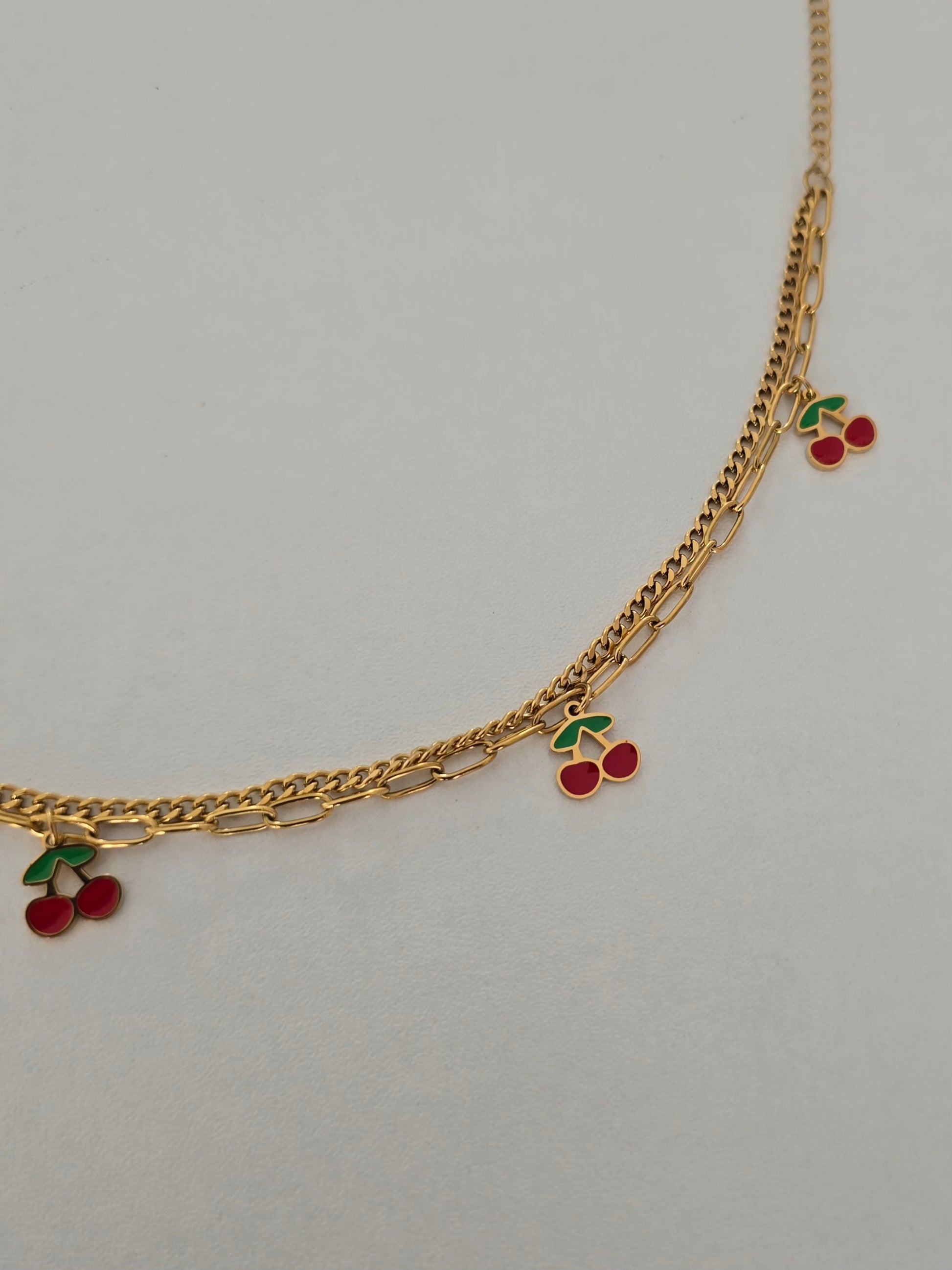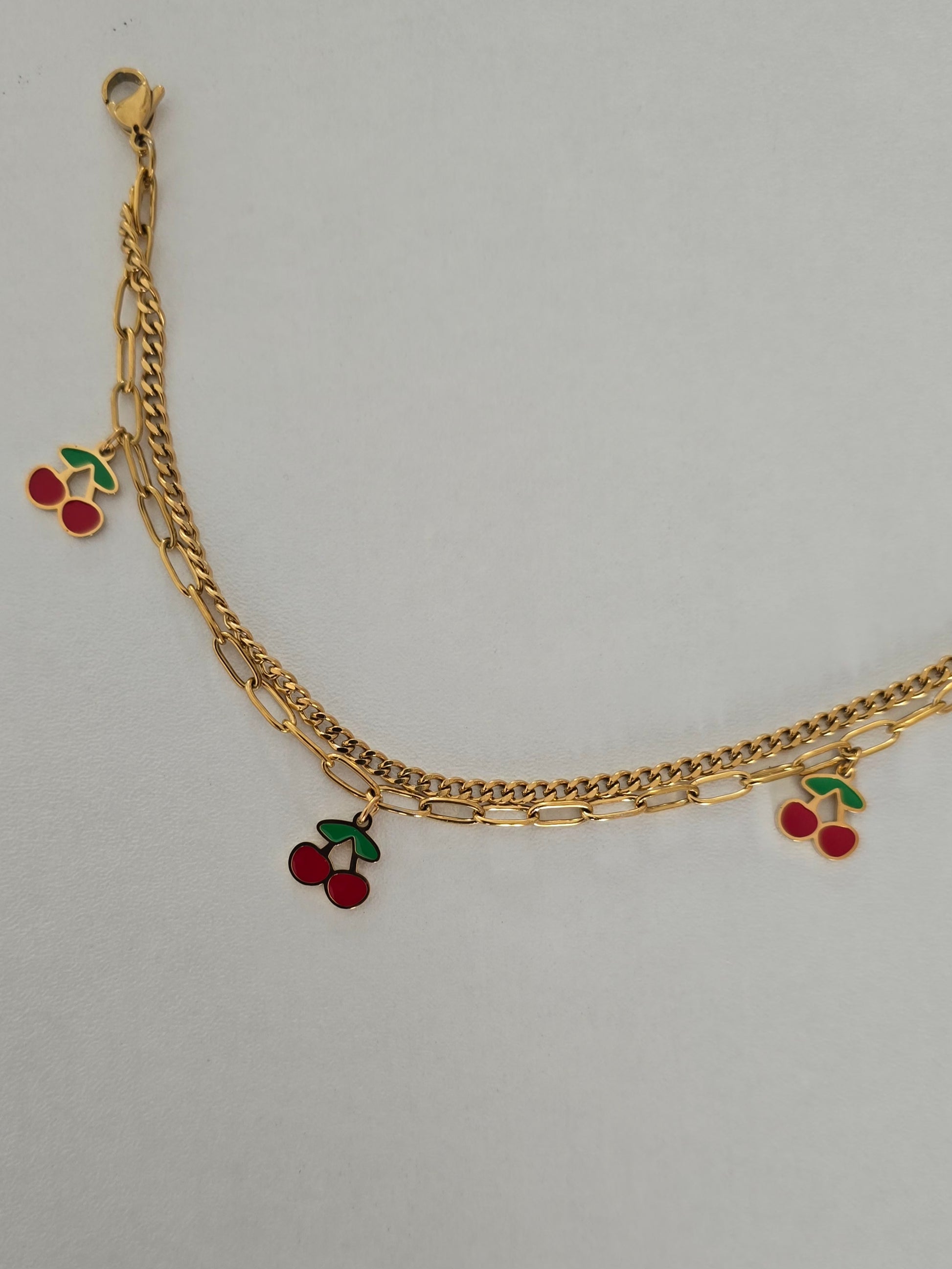 Le bracelet Cerisia est l'allié parfait des tenues estivales et décontractées, mais il sait aussi sublimer une tenue plus habillée grâce à son éclat doré et ses détails fruités.