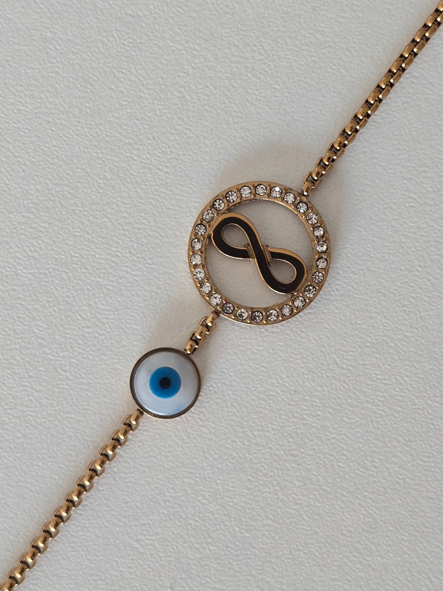 Le signe infini, incrusté de strass scintillants, représente l'éternité, l'amour et les liens indestructibles. Associé au traditionnel oeil bleu protecteur, il devient un talisman porte-bonheur à la fois tendance et symbolique.