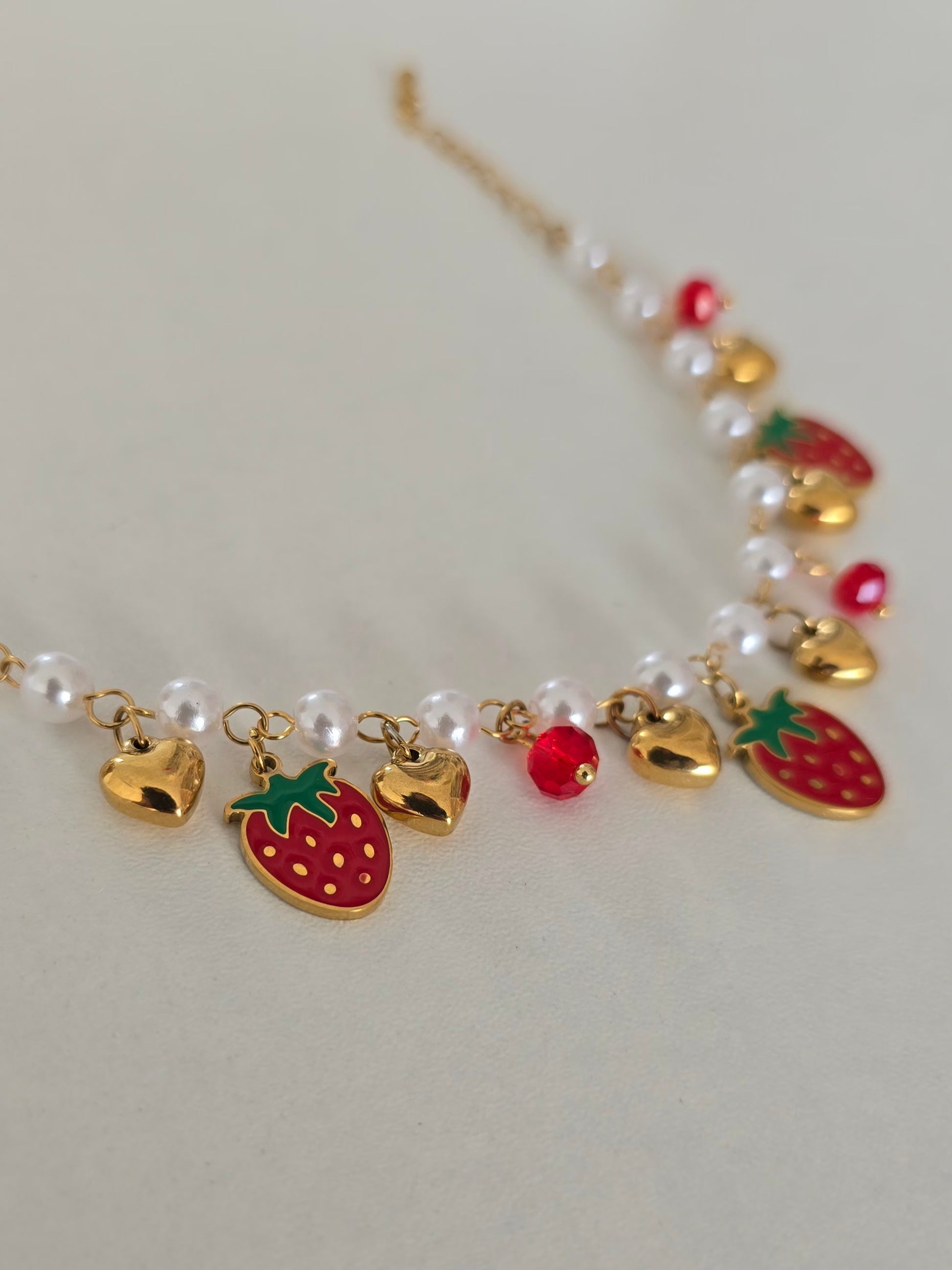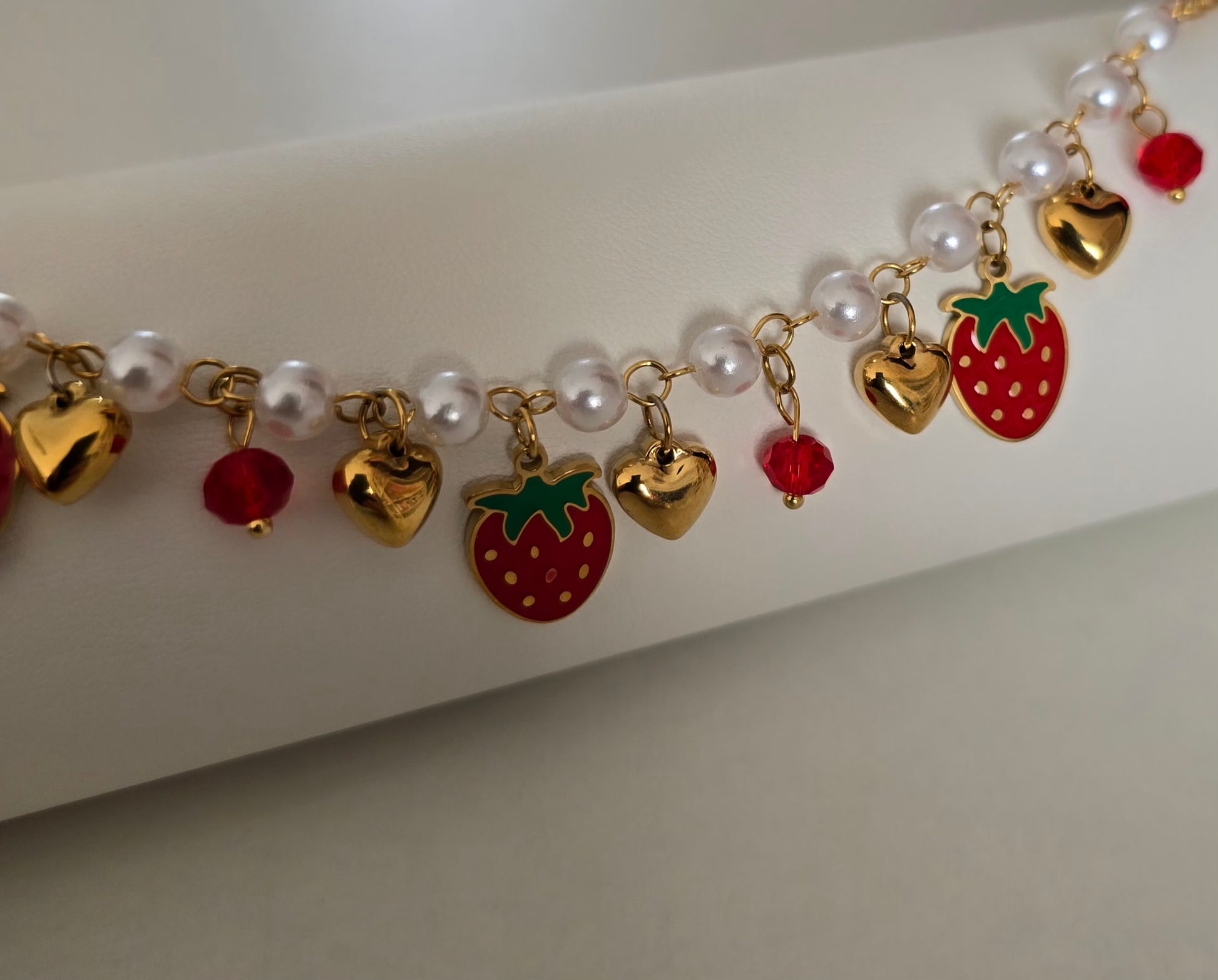 Design : une alternance harmonieuse de fraises, coeurs et perles qui crée un bijou à la fois chic, coloré et pétillant