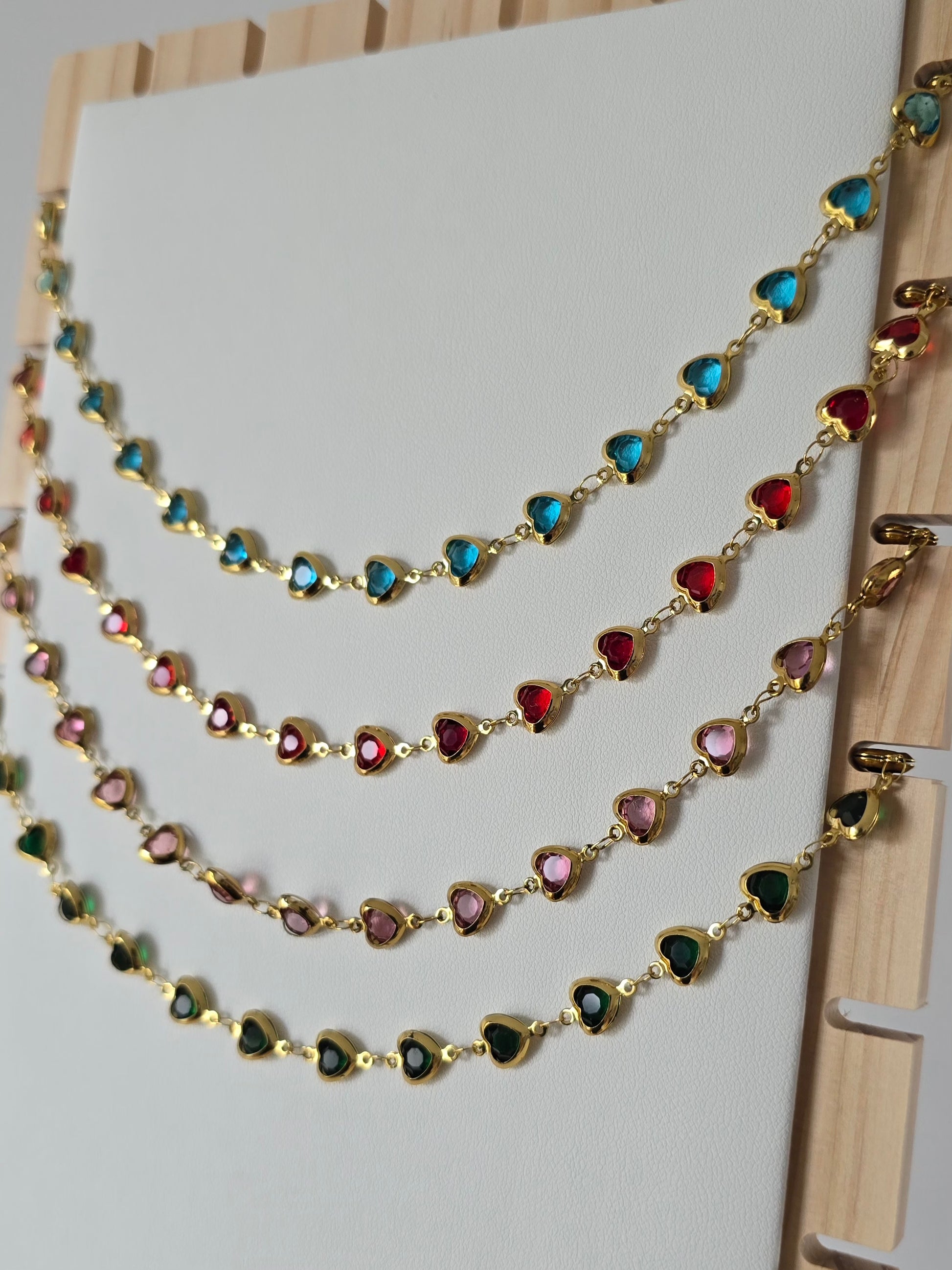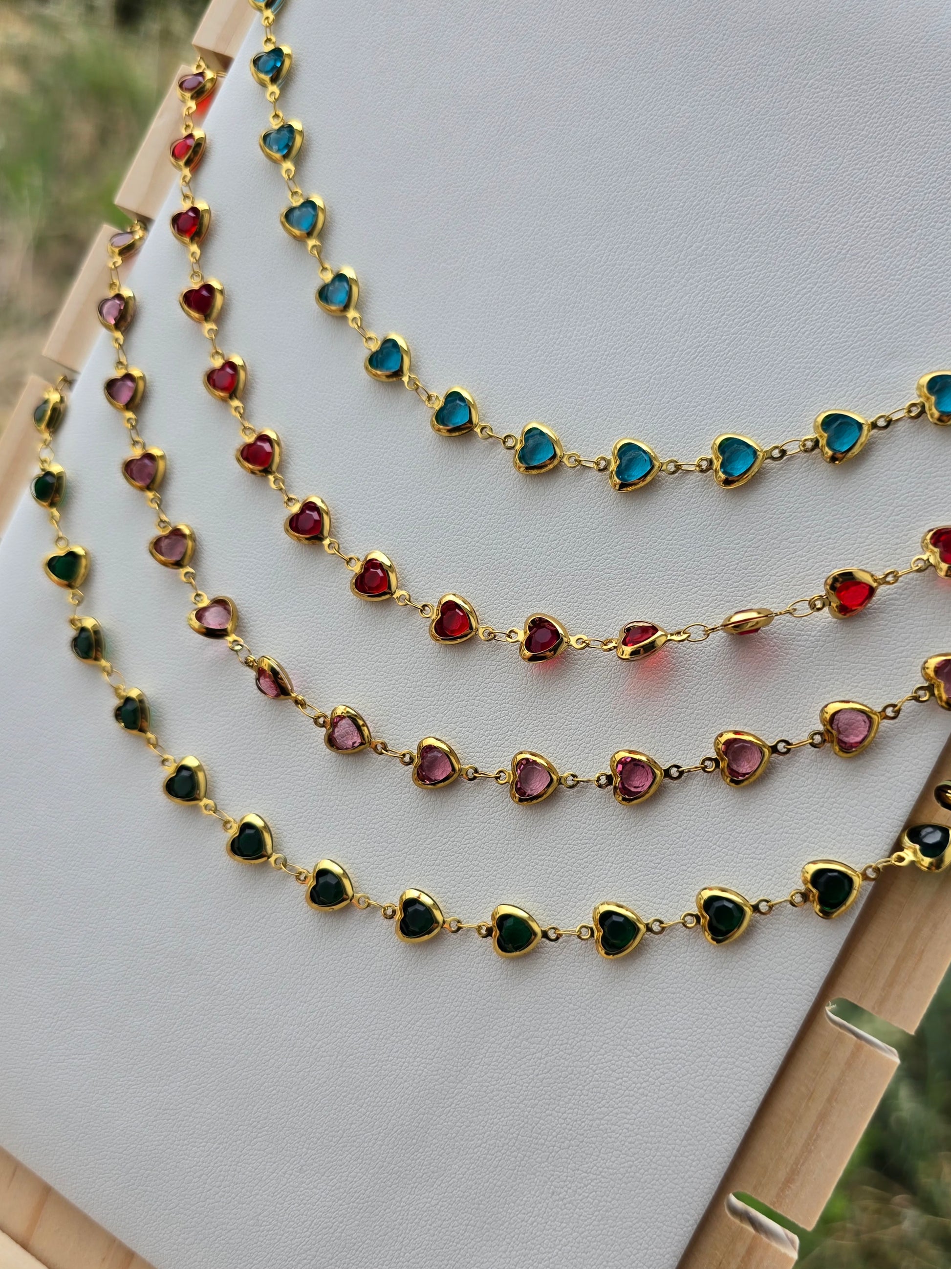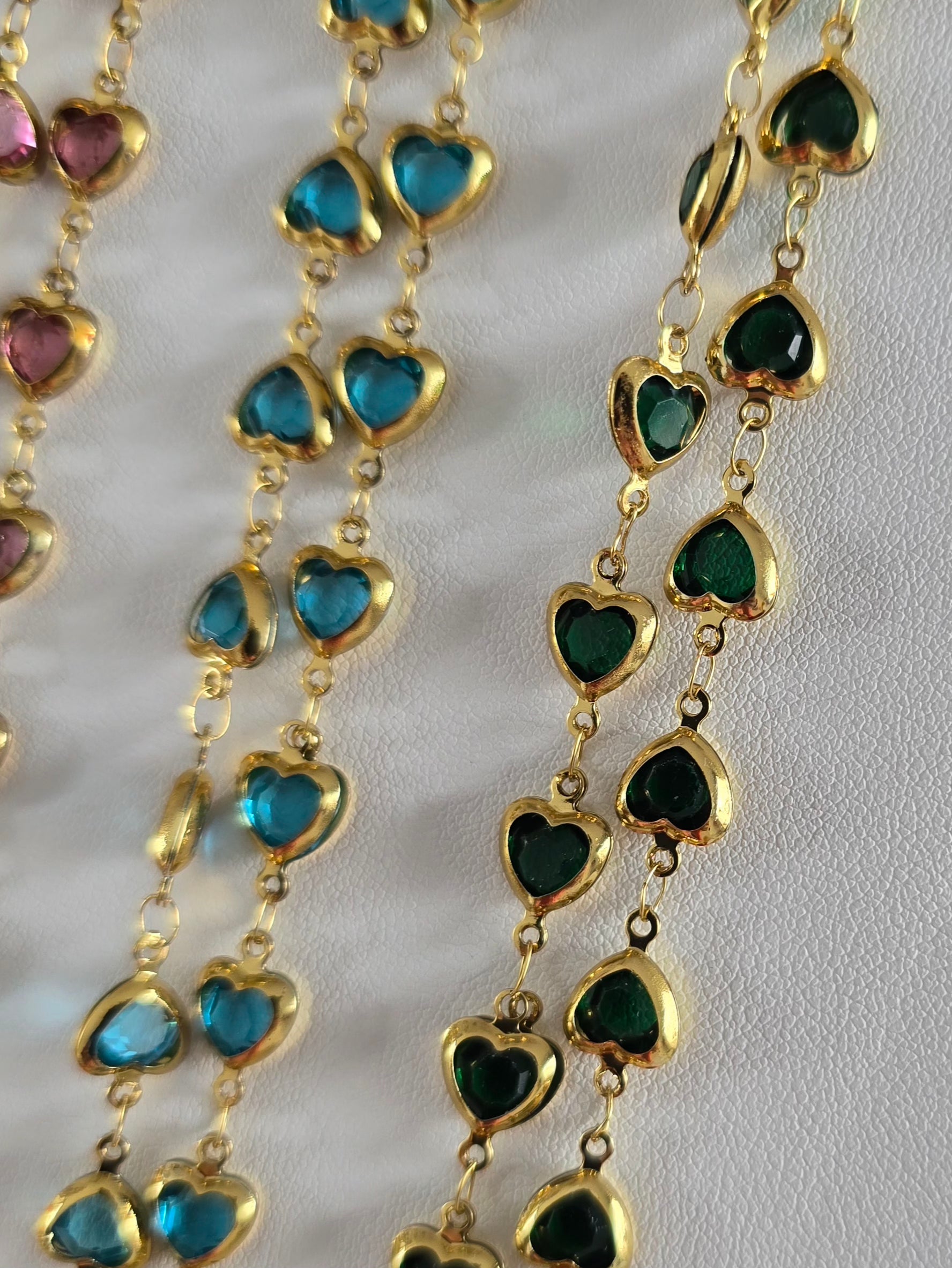- Design : Une chaîne raffinée ornée de petits coeurs colorés translucides à facettes, qui captent la lumière à chaque mouvement.