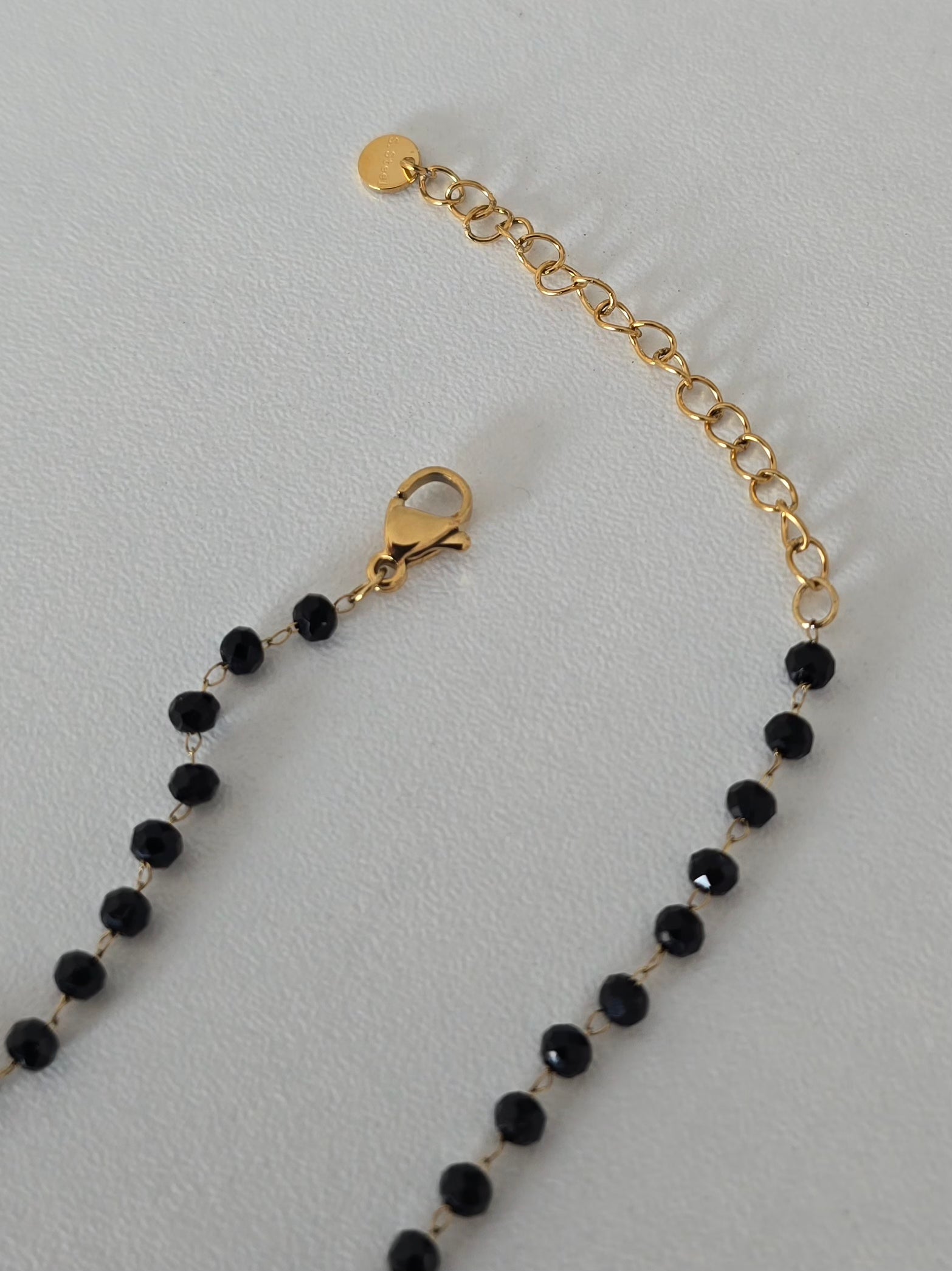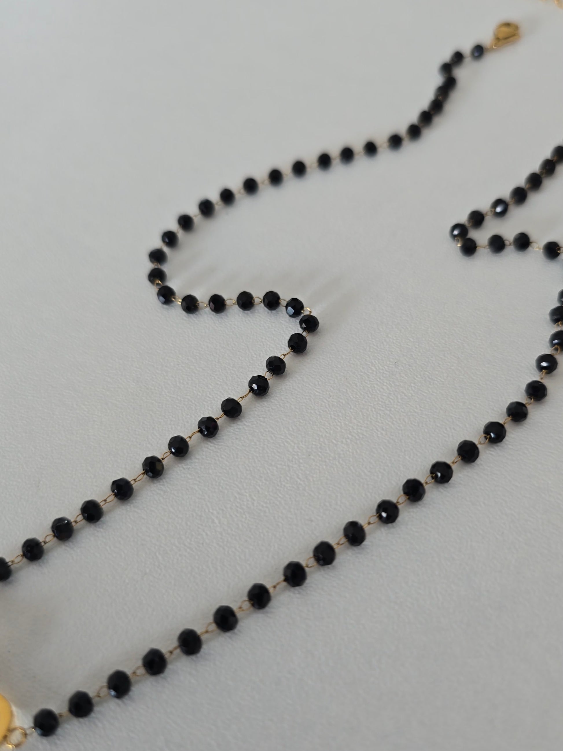 - Perles noires facettées qui reflètent joliment la lumière.