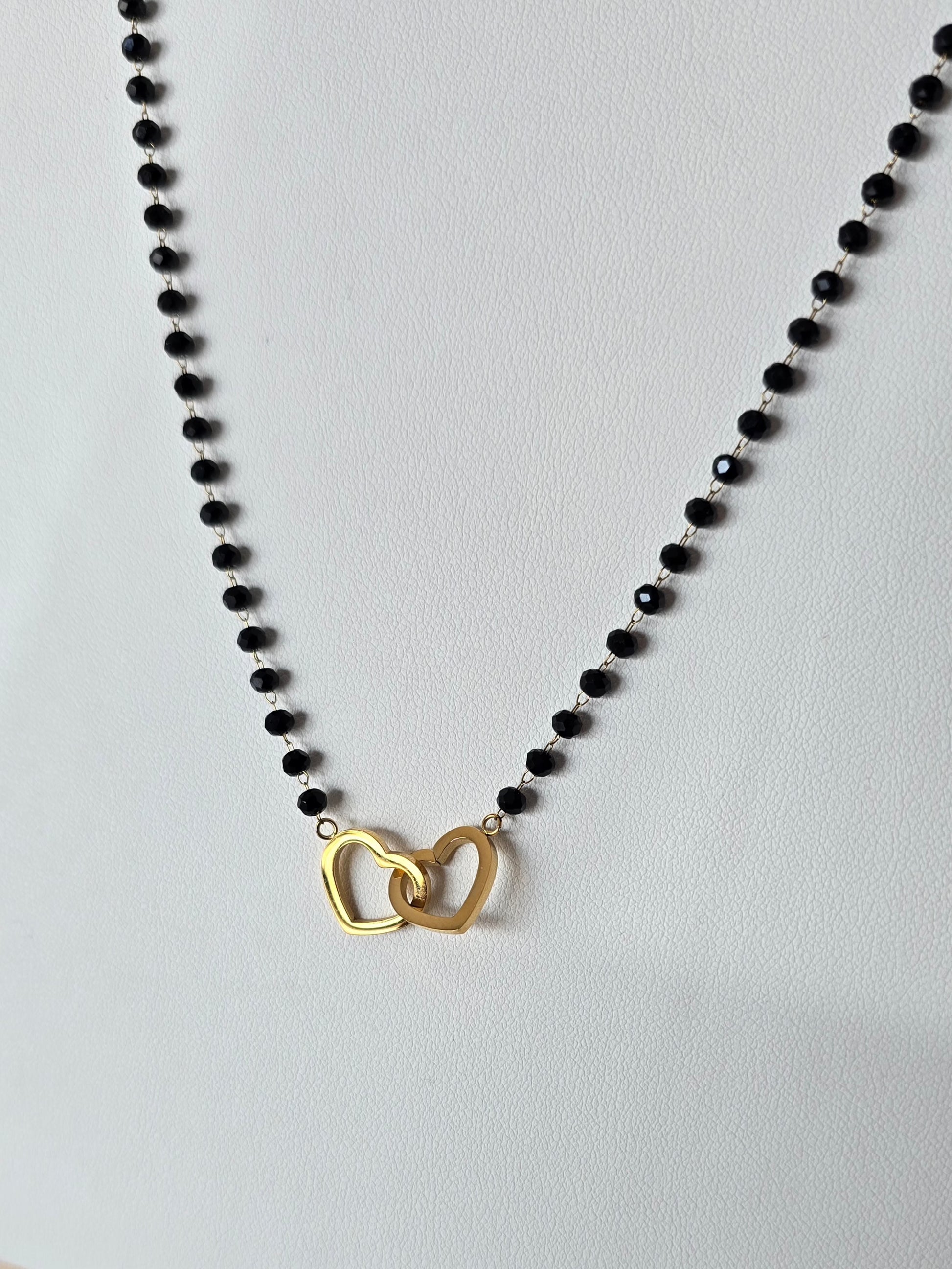 Ici en version NOIR-Doré, il allie la profondeur des perles noires facettées à l'éclat lumineux de l'acier inoxydable doré.