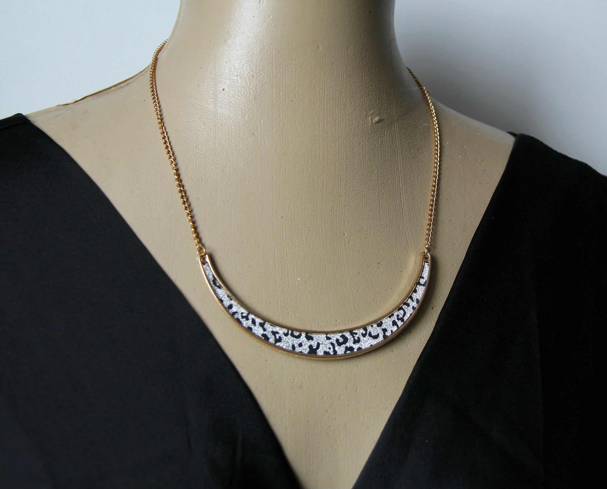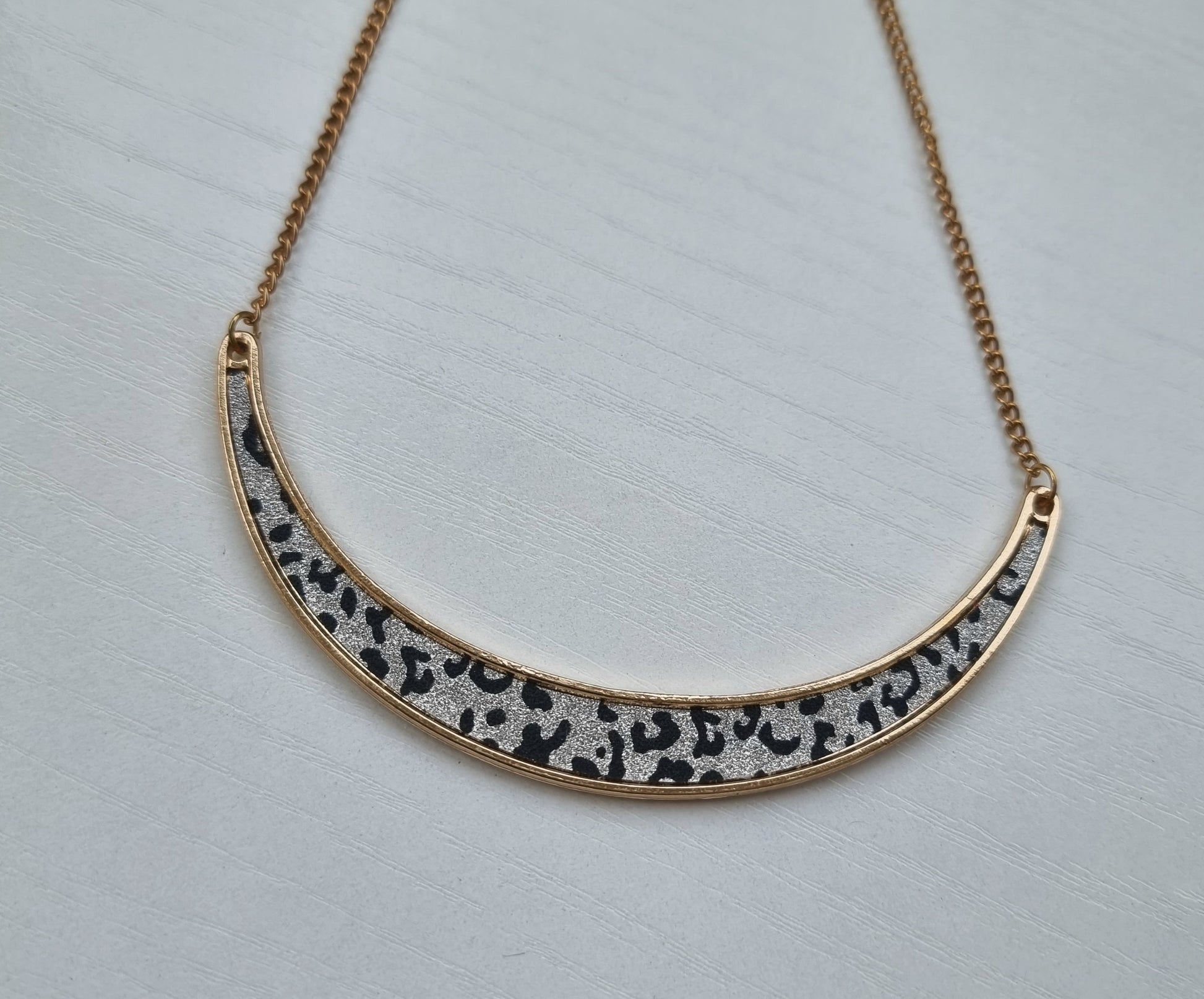 Jolie collier ras de cou, en métal doré avec motif léopard argenté et noir. Avec son fermoir de type “pince de homard” sa taille pourra être réglable pour sublimer vos tenues.