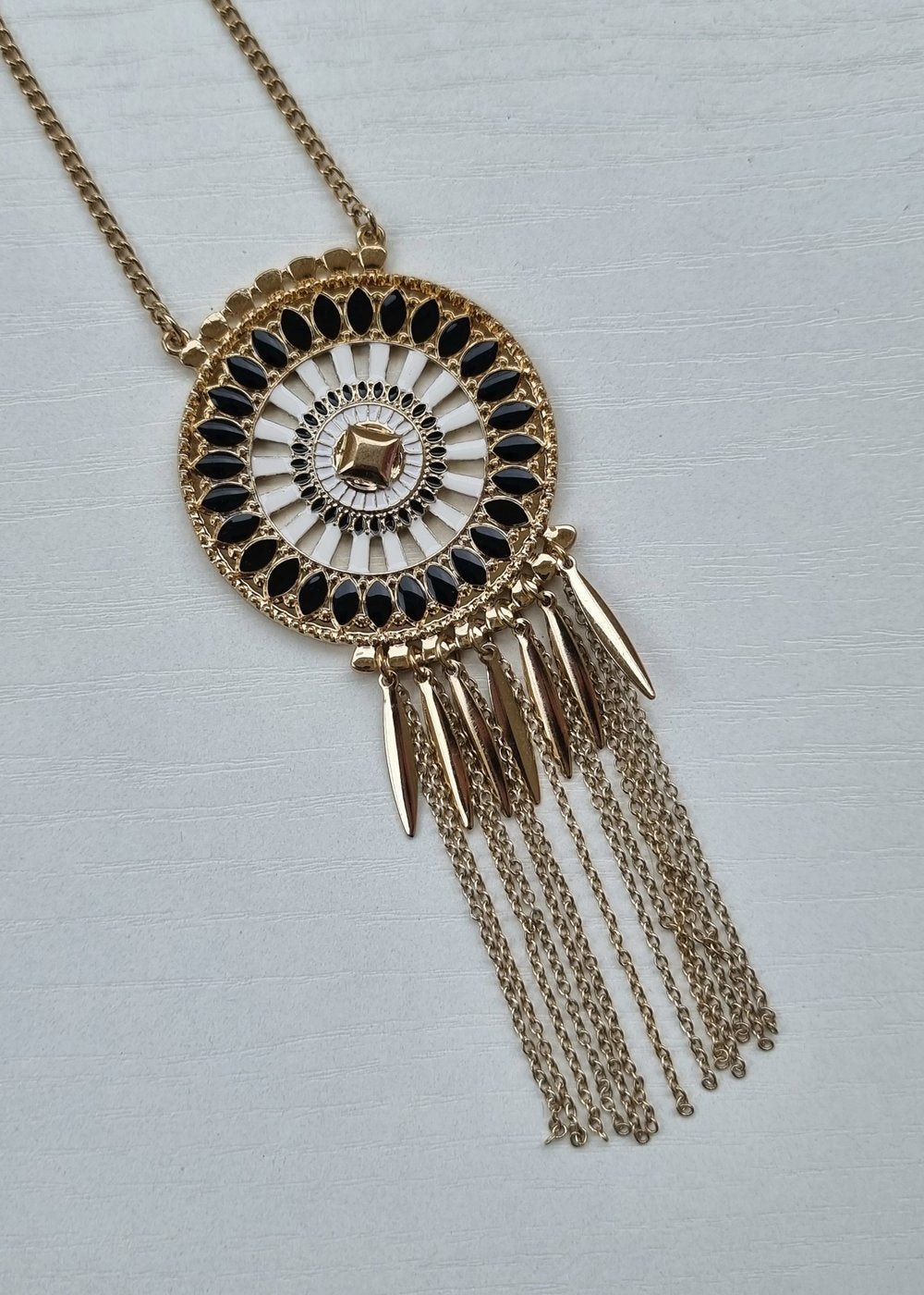 Splendide collier sautoir de couleur doré, blanc, noir. Ce bijou fantaisie à un fermoir de type “pince de homard”; ainsi, il pourra être réglable pour sublimer vos tenues. Qu’elle soit classique, chic ou casual; c’est le bijou qu’il vous faut !