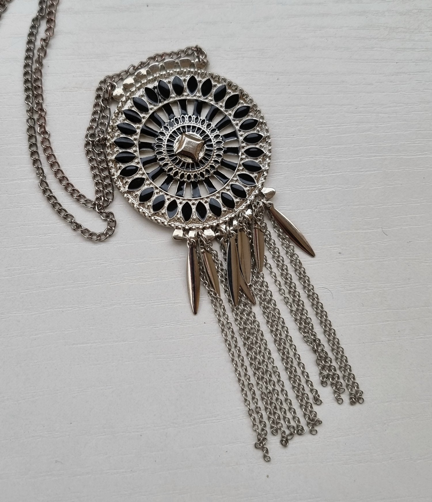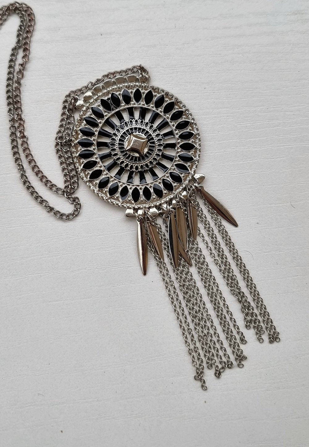 Splendide collier sautoir de couleur argenté et noir. Ce bijou fantaisie à un fermoir de type “pince de homard”; ainsi, il pourra être réglable pour sublimer vos tenues. Qu’elle soit classique, chic ou casual; c’est le bijou qu’il vous faut !