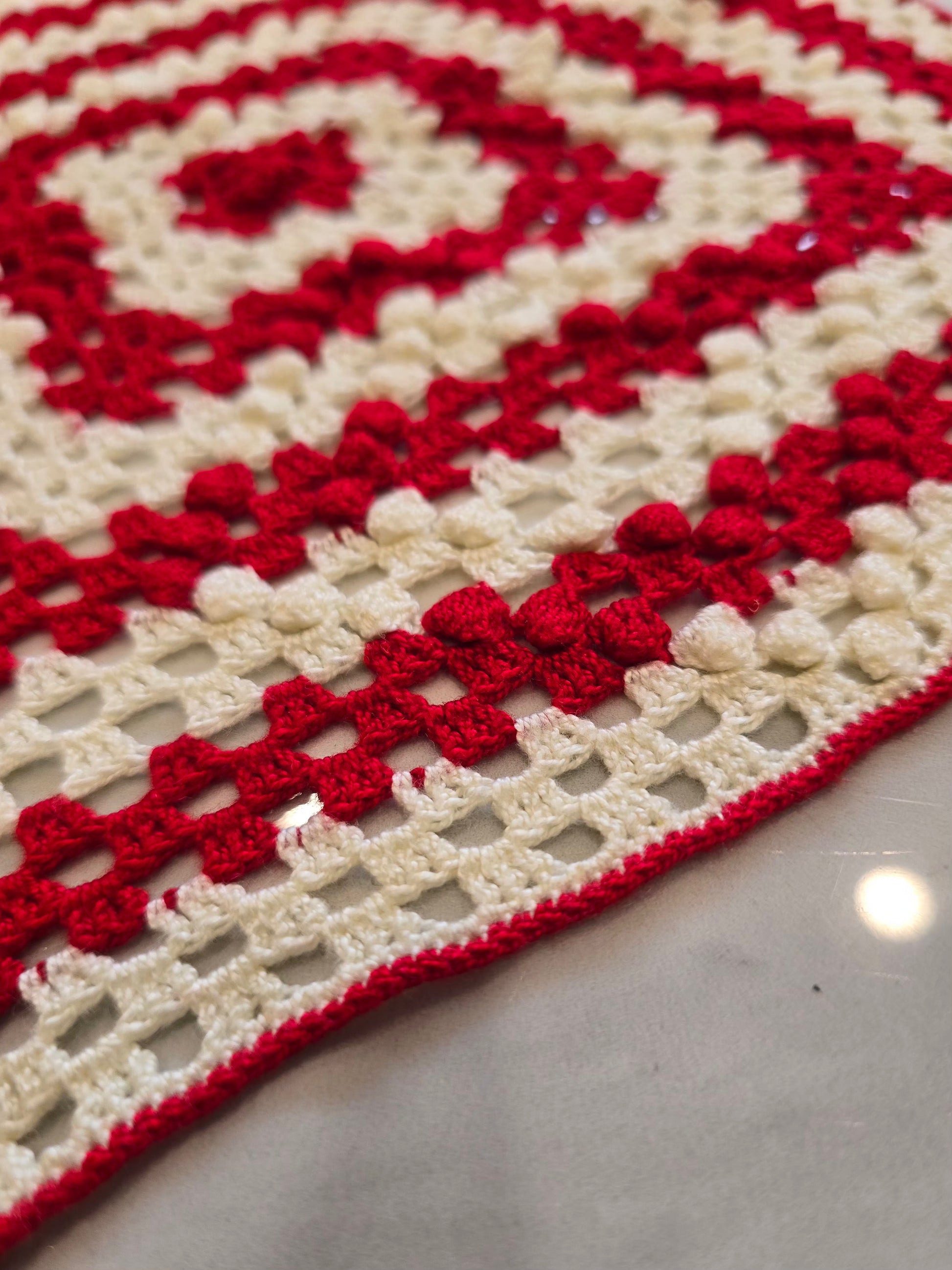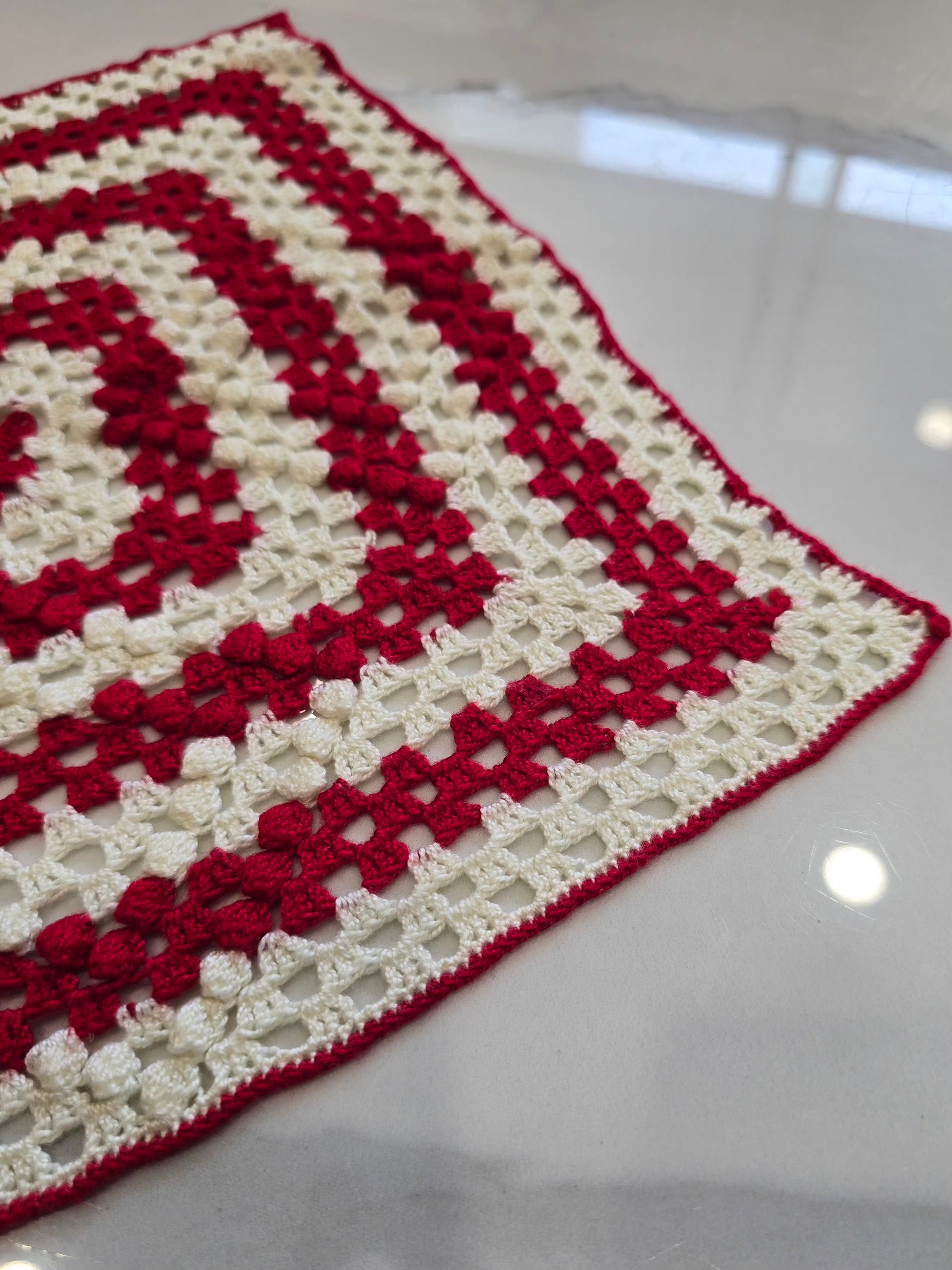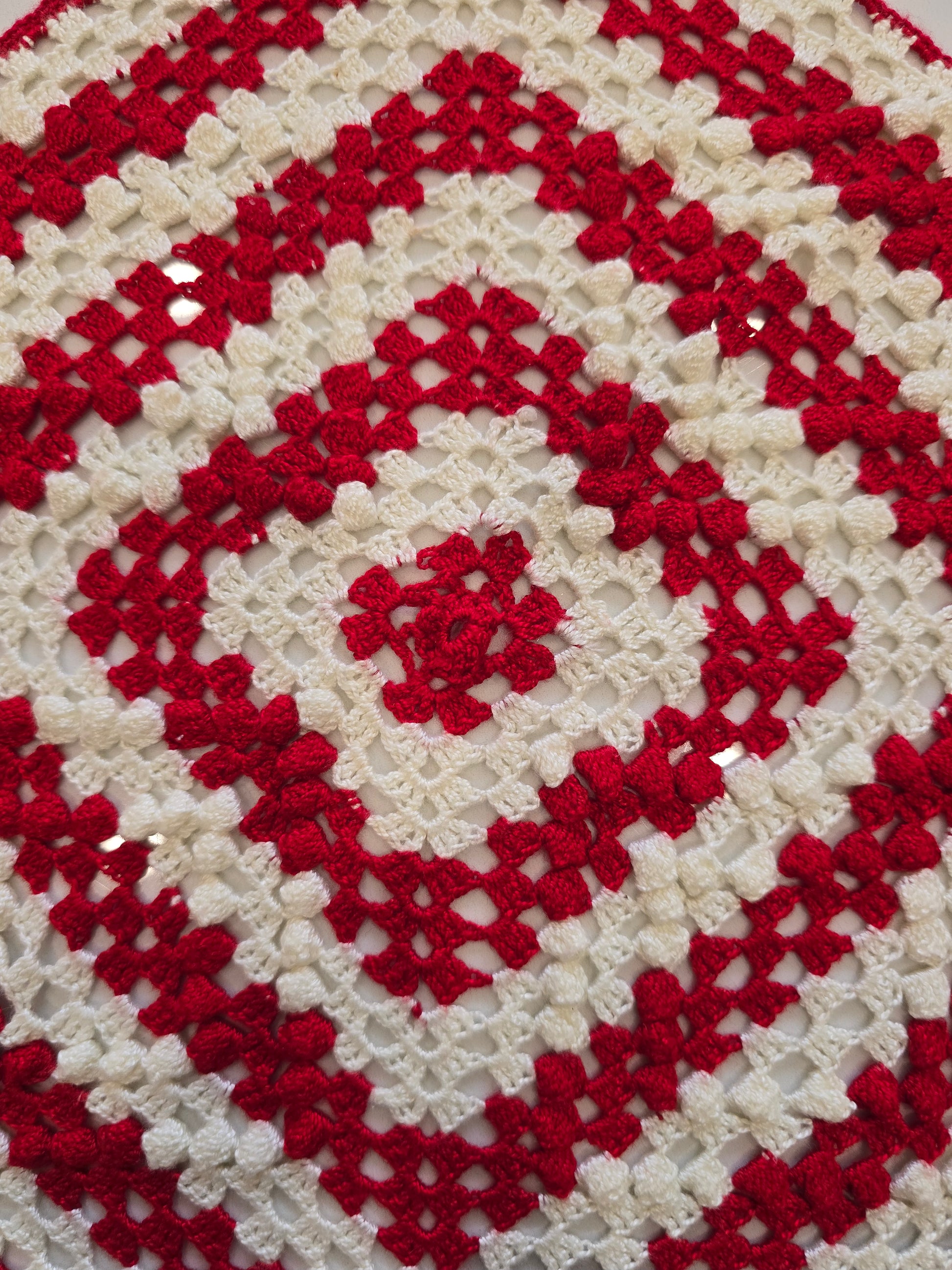 Ce napperon au crochet en forme de losange, confectionné entièrement à la main, séduit par son motif géométrique et ses jolies teintes rouge et blanc.