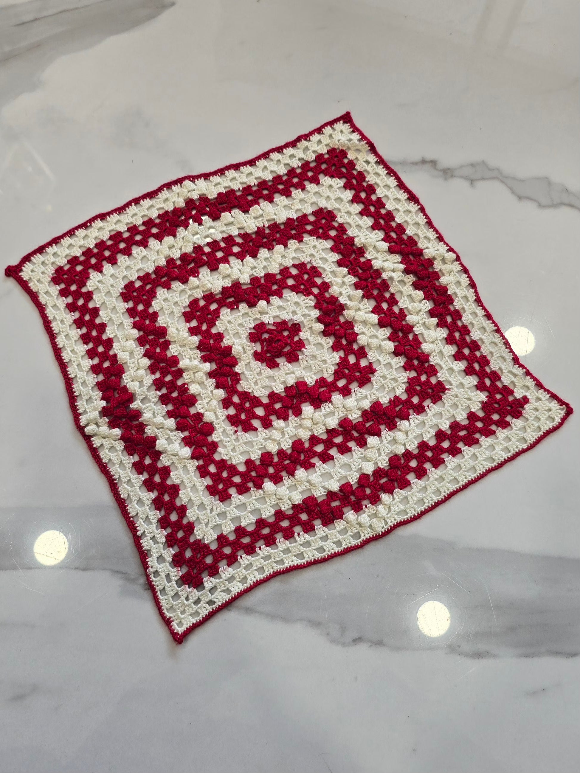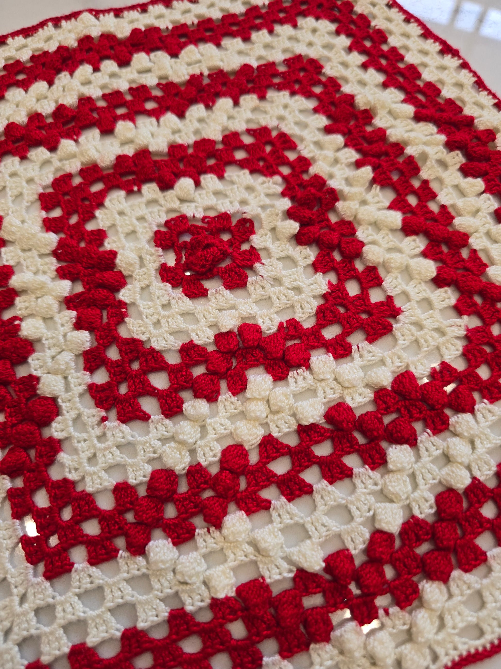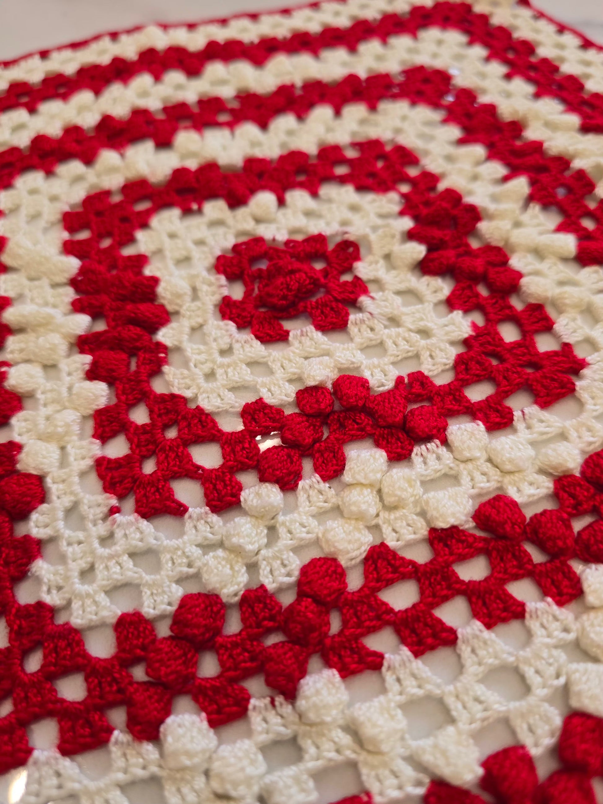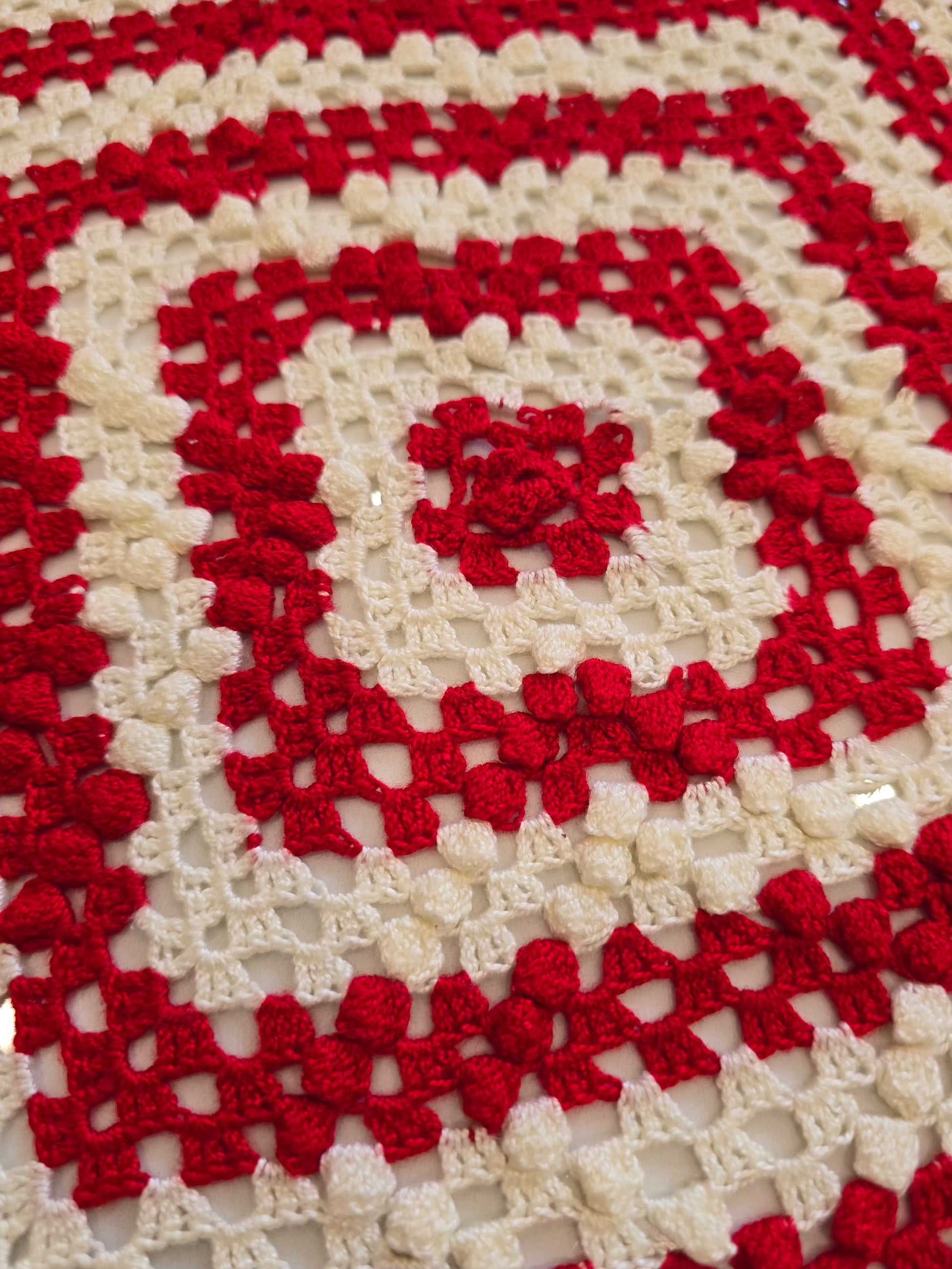 Ce napperon au crochet en forme de losange, confectionné entièrement à la main, séduit par son motif géométrique et ses jolies teintes rouge et blanc.