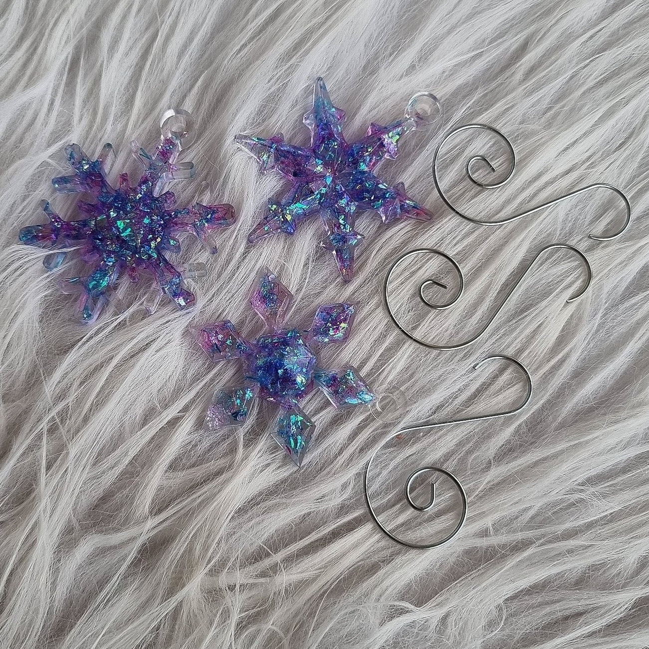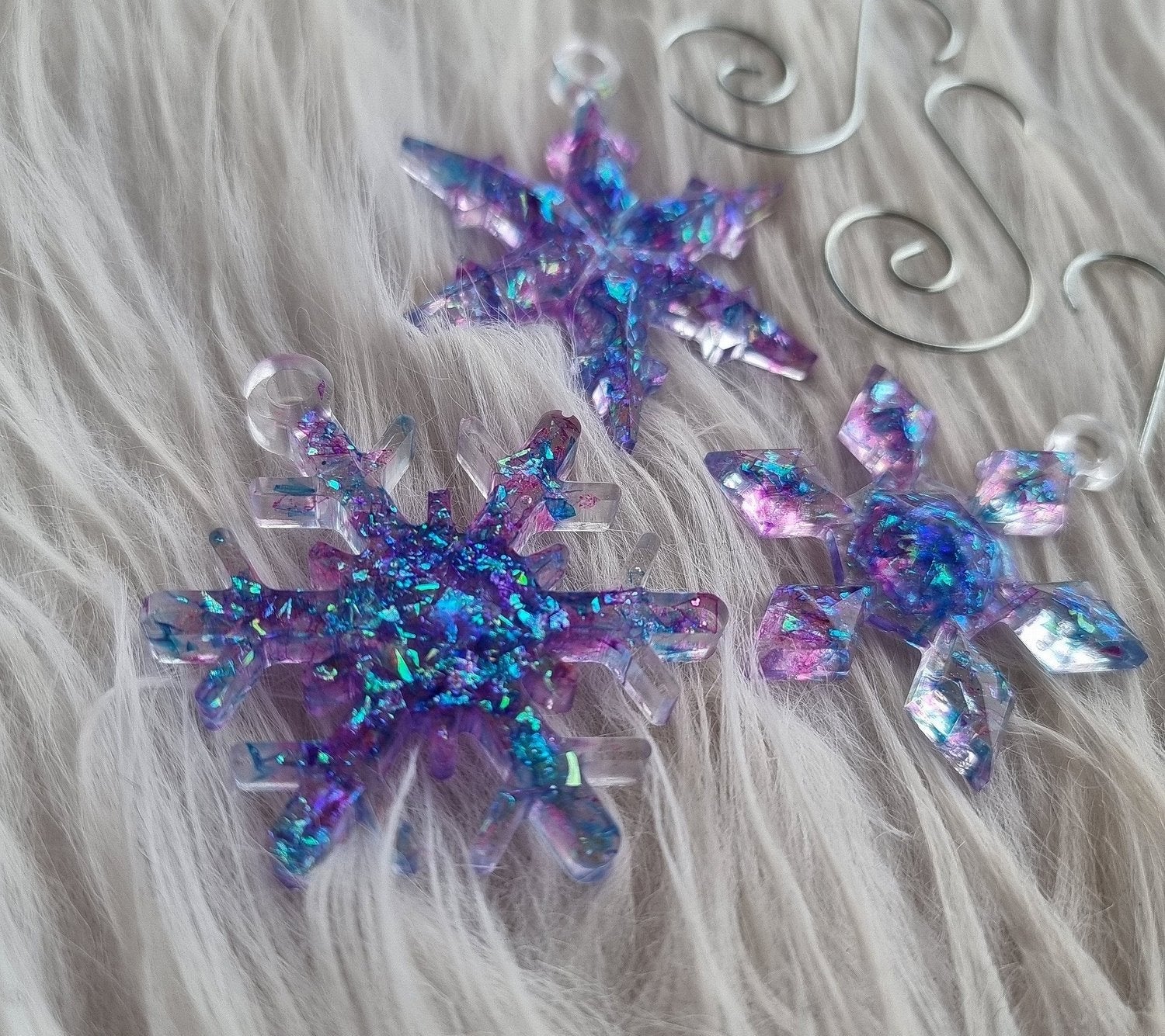 Lot de trois flocons de couleurs relief bleu/violet; réaliser en résine epoxy avec trois crochets de suspension assorti. Très joli et unique !