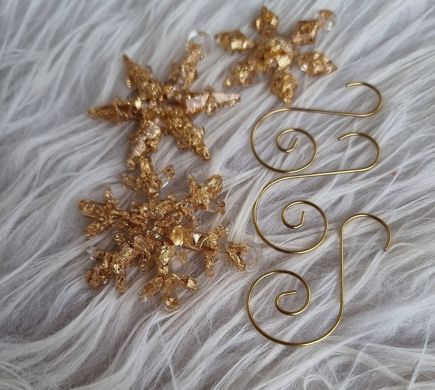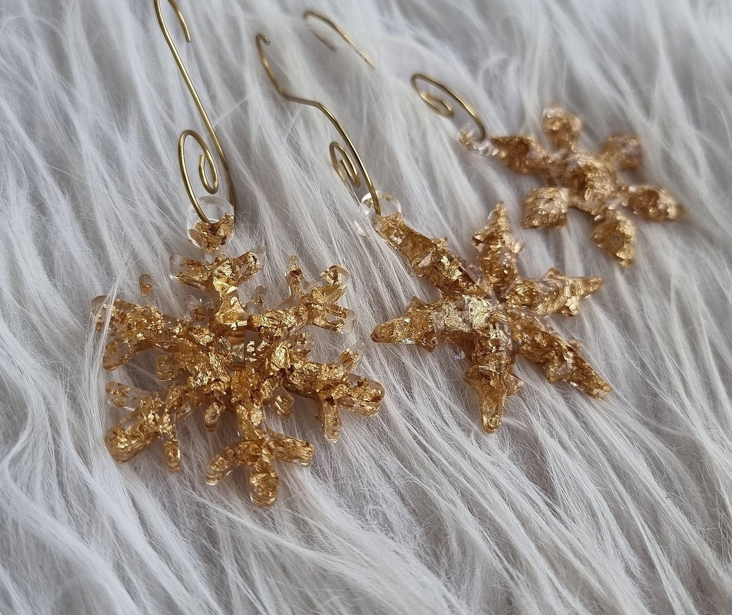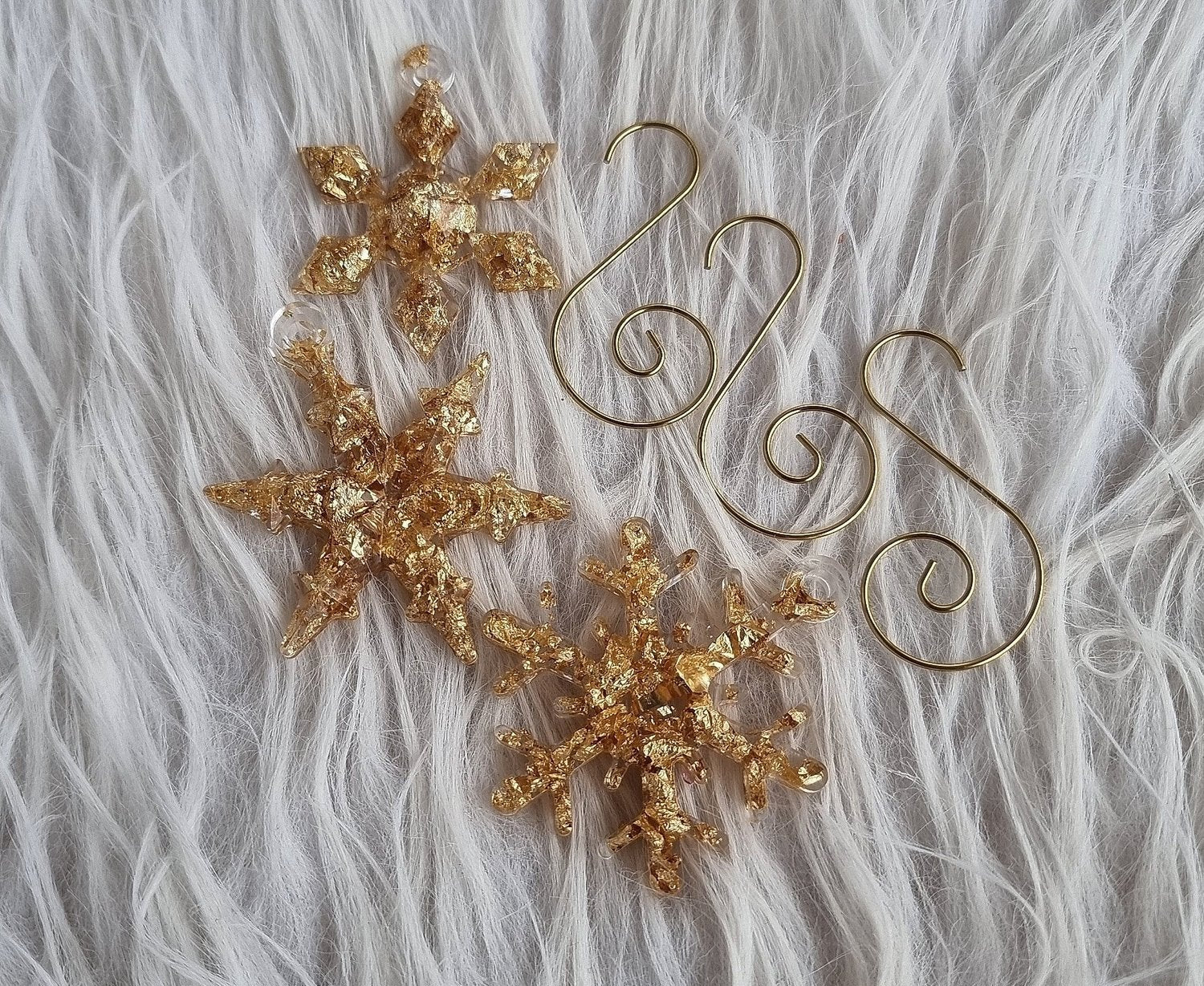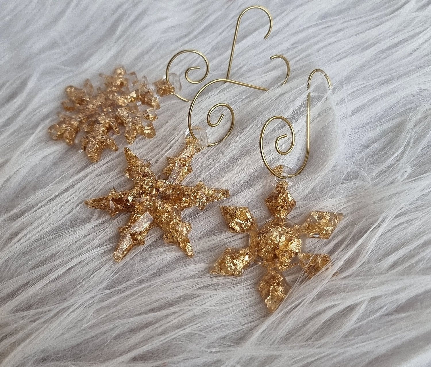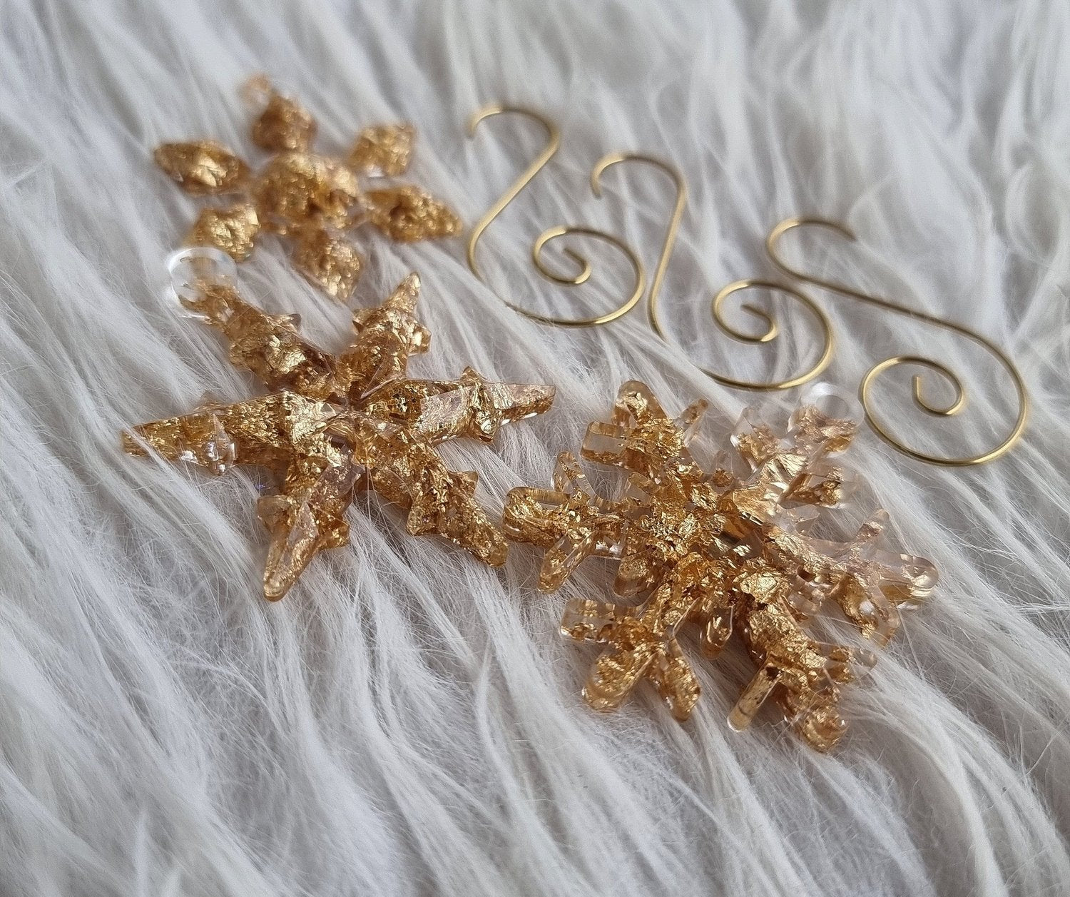 Lot de trois flocons doré réaliser en résine epoxy avec trois crochets de suspension assortie. Très joli et unique !