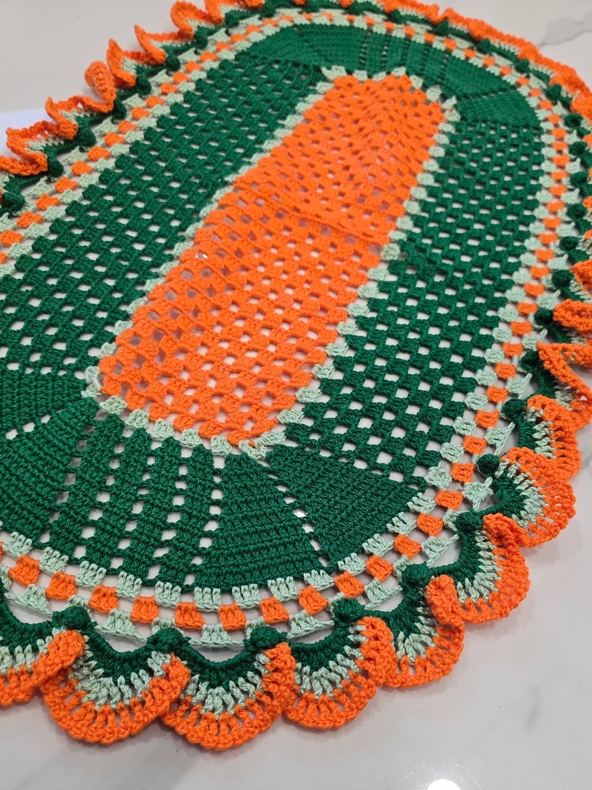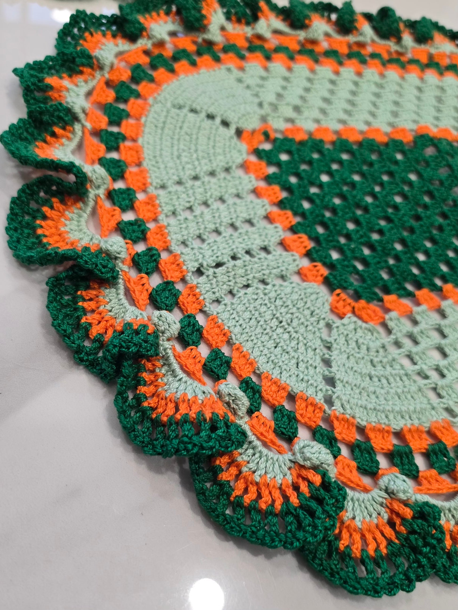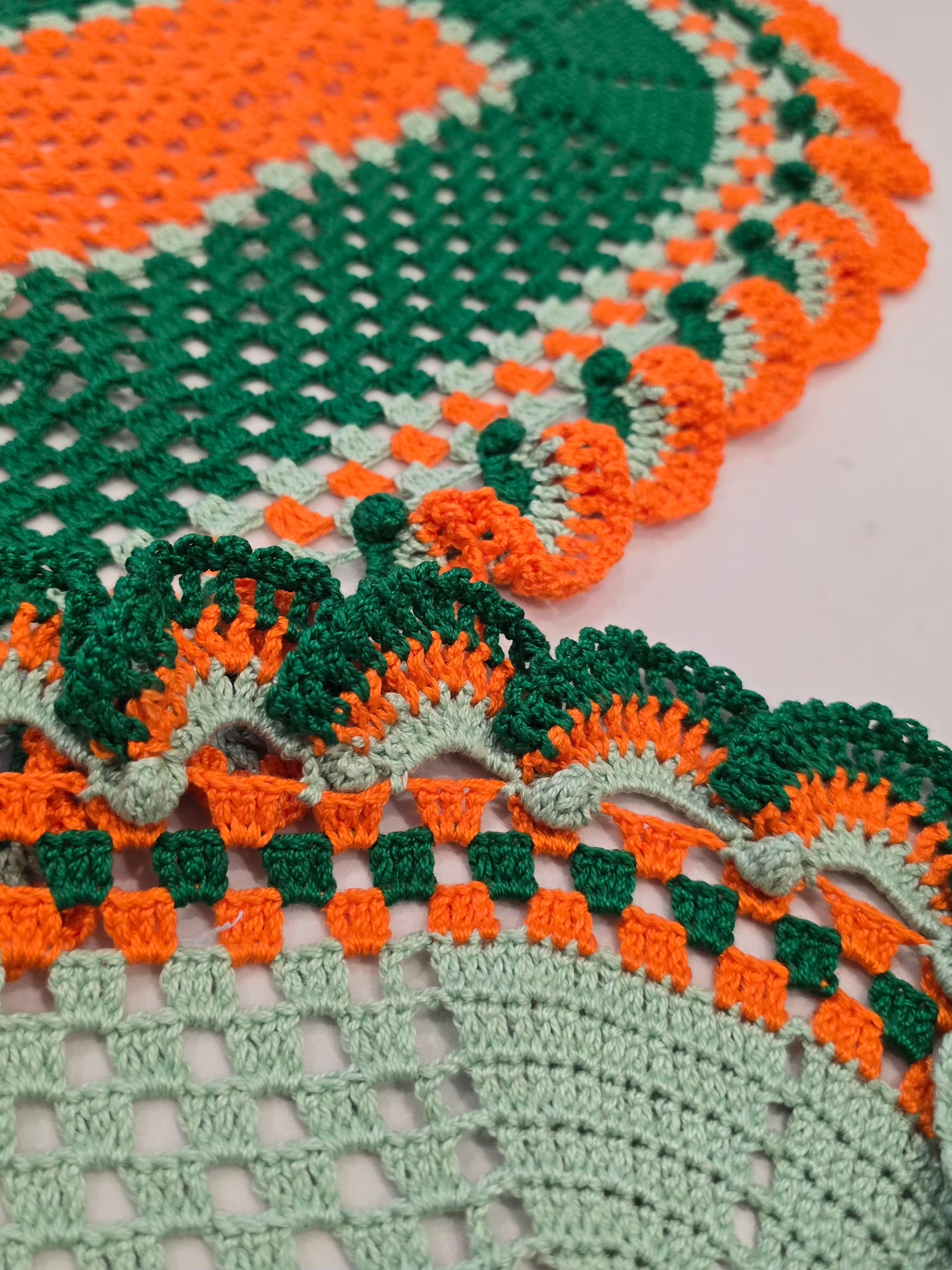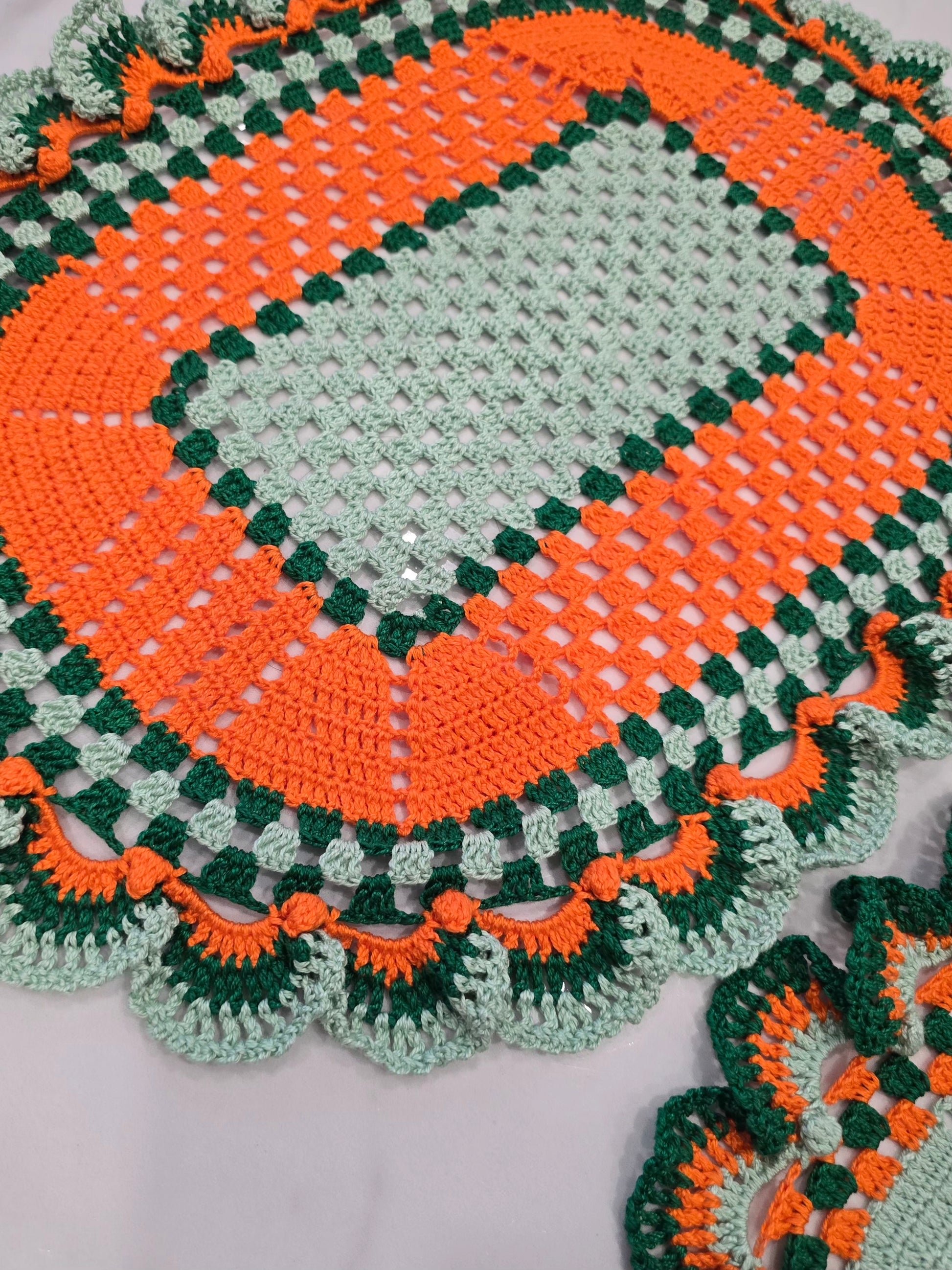 Ce lot de 3 napperons au crochet, entièrement fait main, se distingue par ses superbes tons vert, vert clair et orange. Chaque pièce est unique, réalisée avec soin et passion, pour sublimer votre décoration tout en ajoutant une note chaleureuse et rétro.