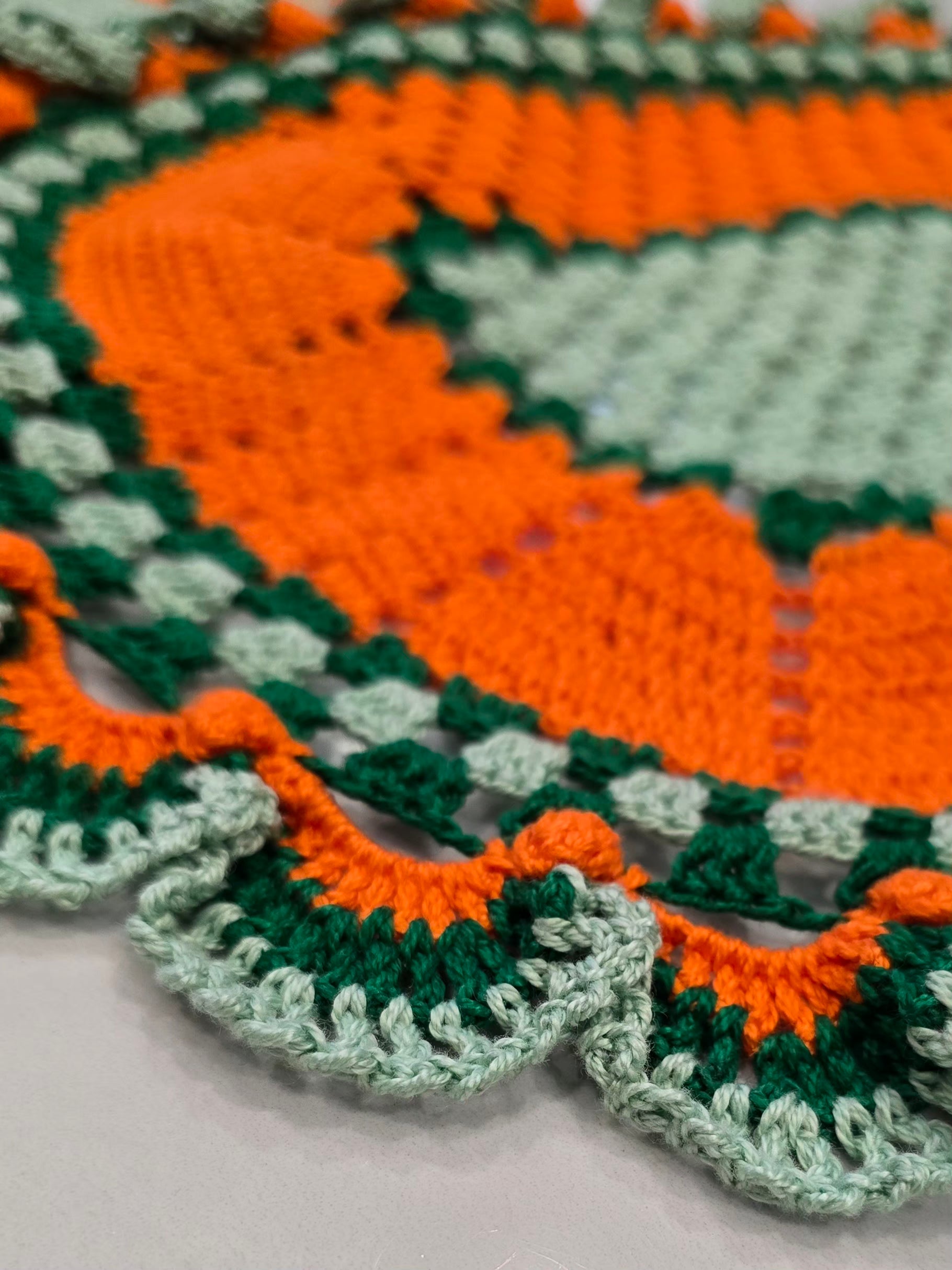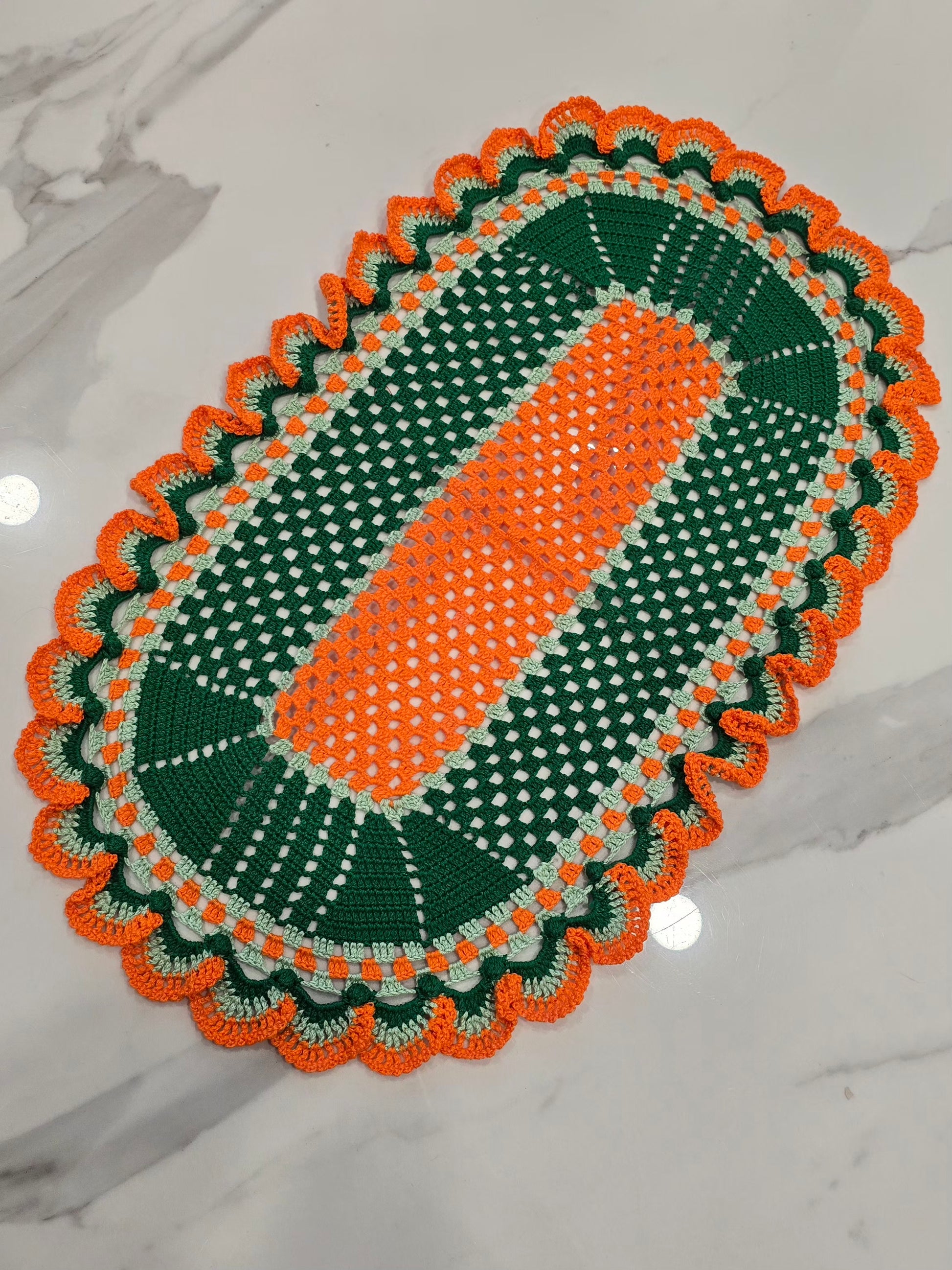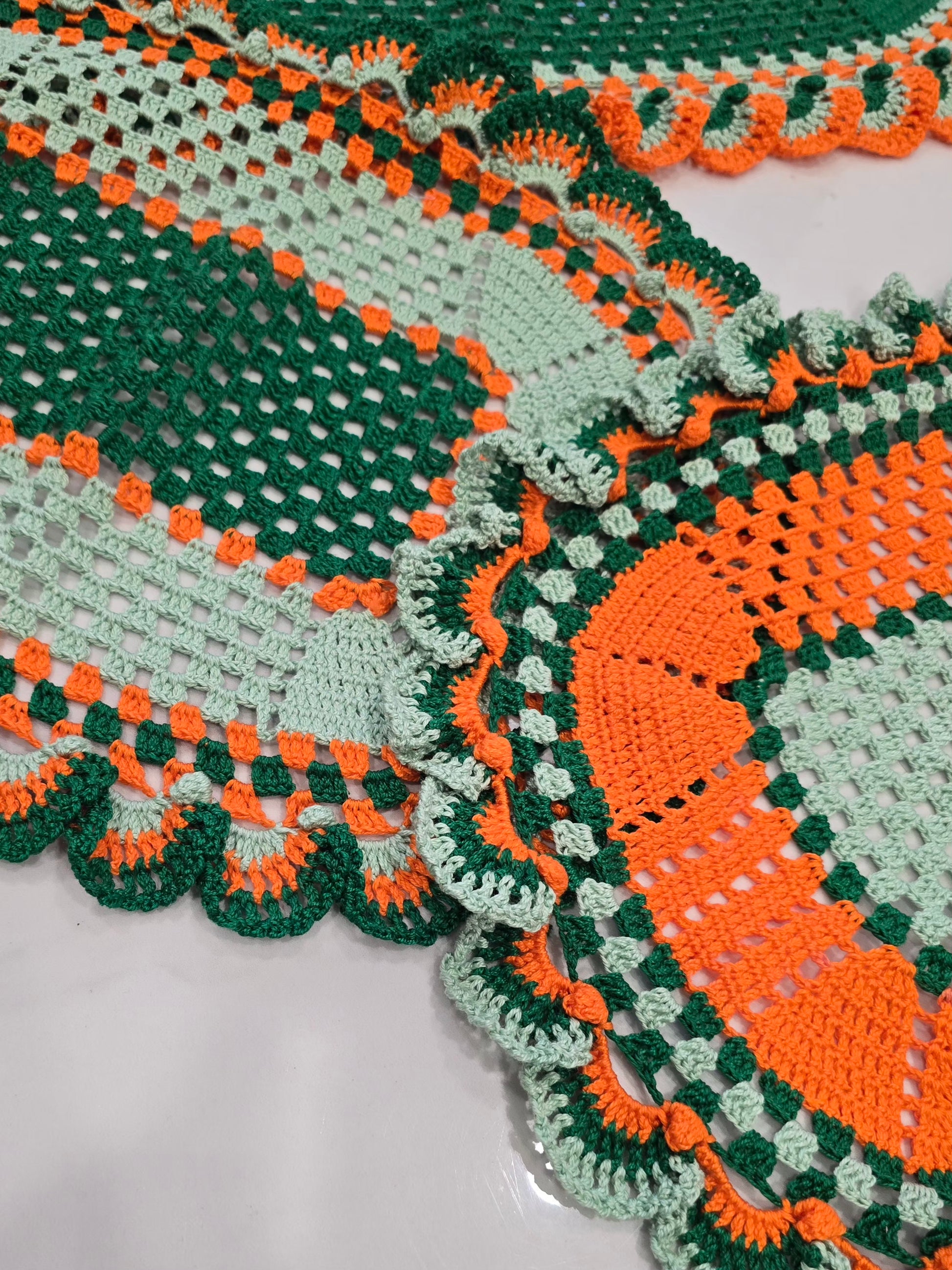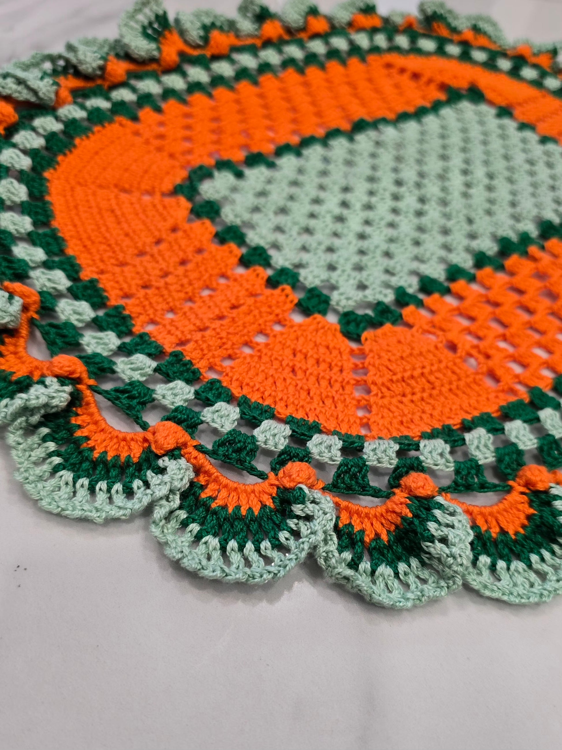 Ce lot de 3 napperons au crochet, entièrement fait main, se distingue par ses superbes tons vert, vert clair et orange. Chaque pièce est unique, réalisée avec soin et passion, pour sublimer votre décoration tout en ajoutant une note chaleureuse et rétro.