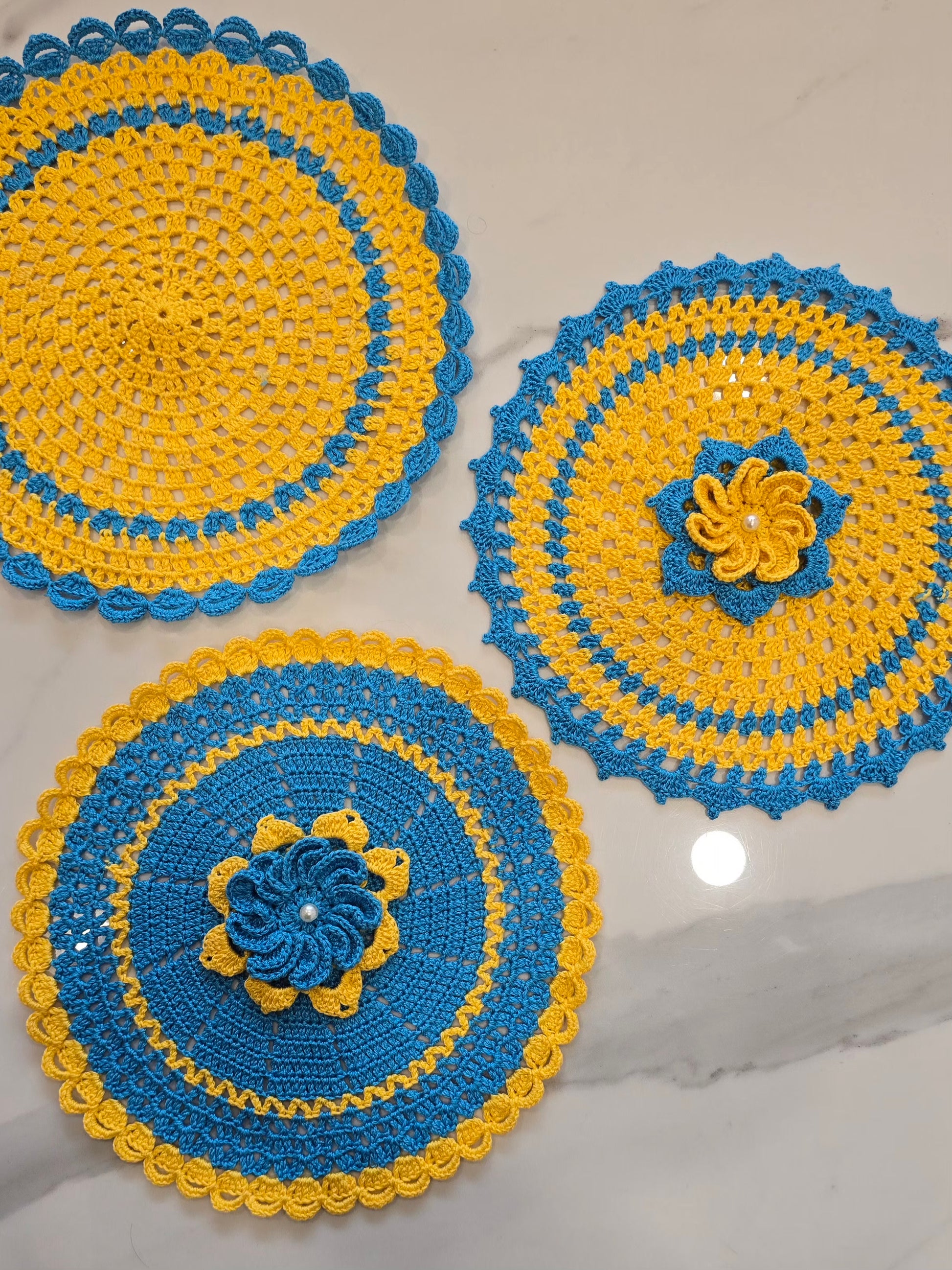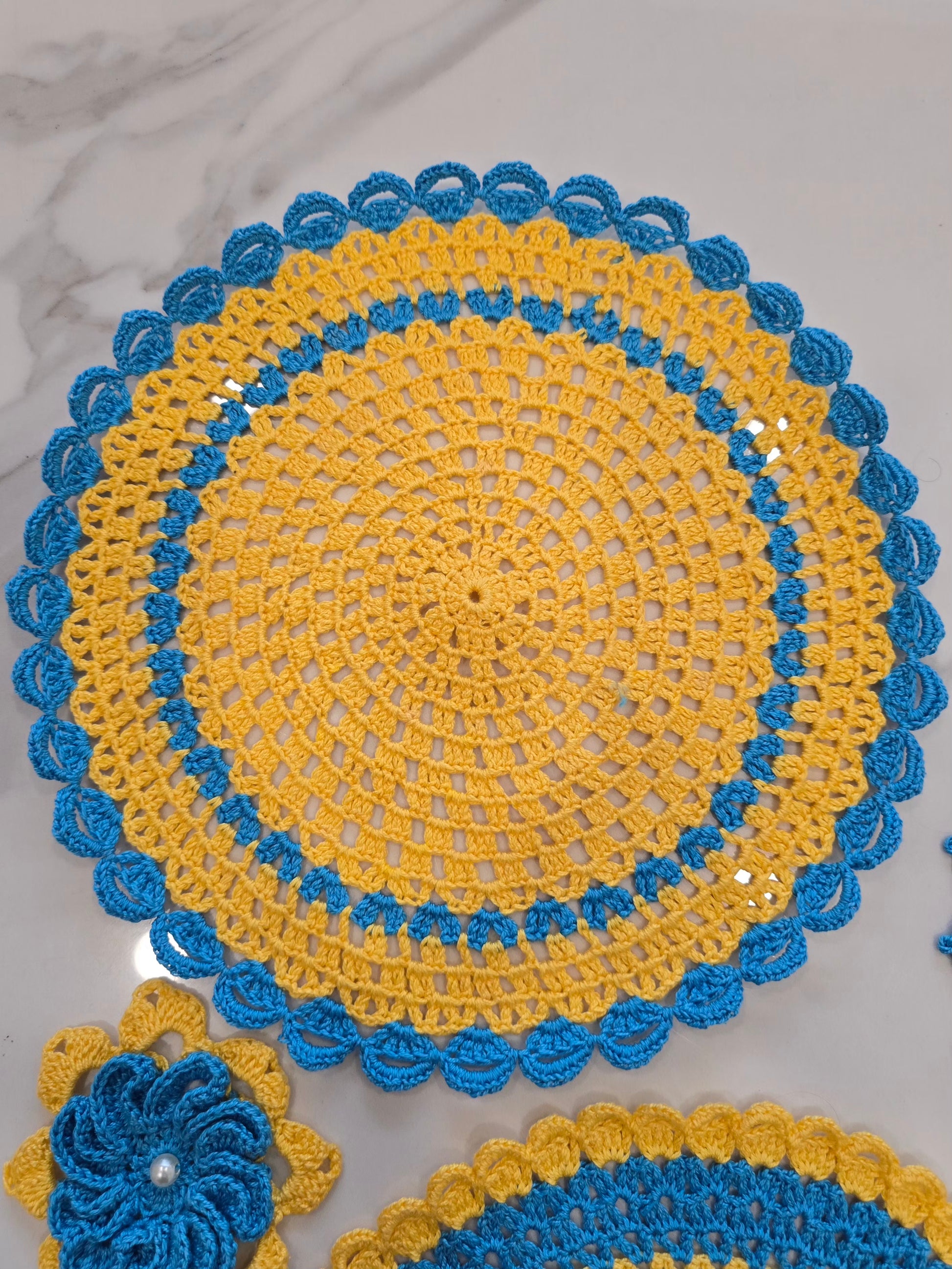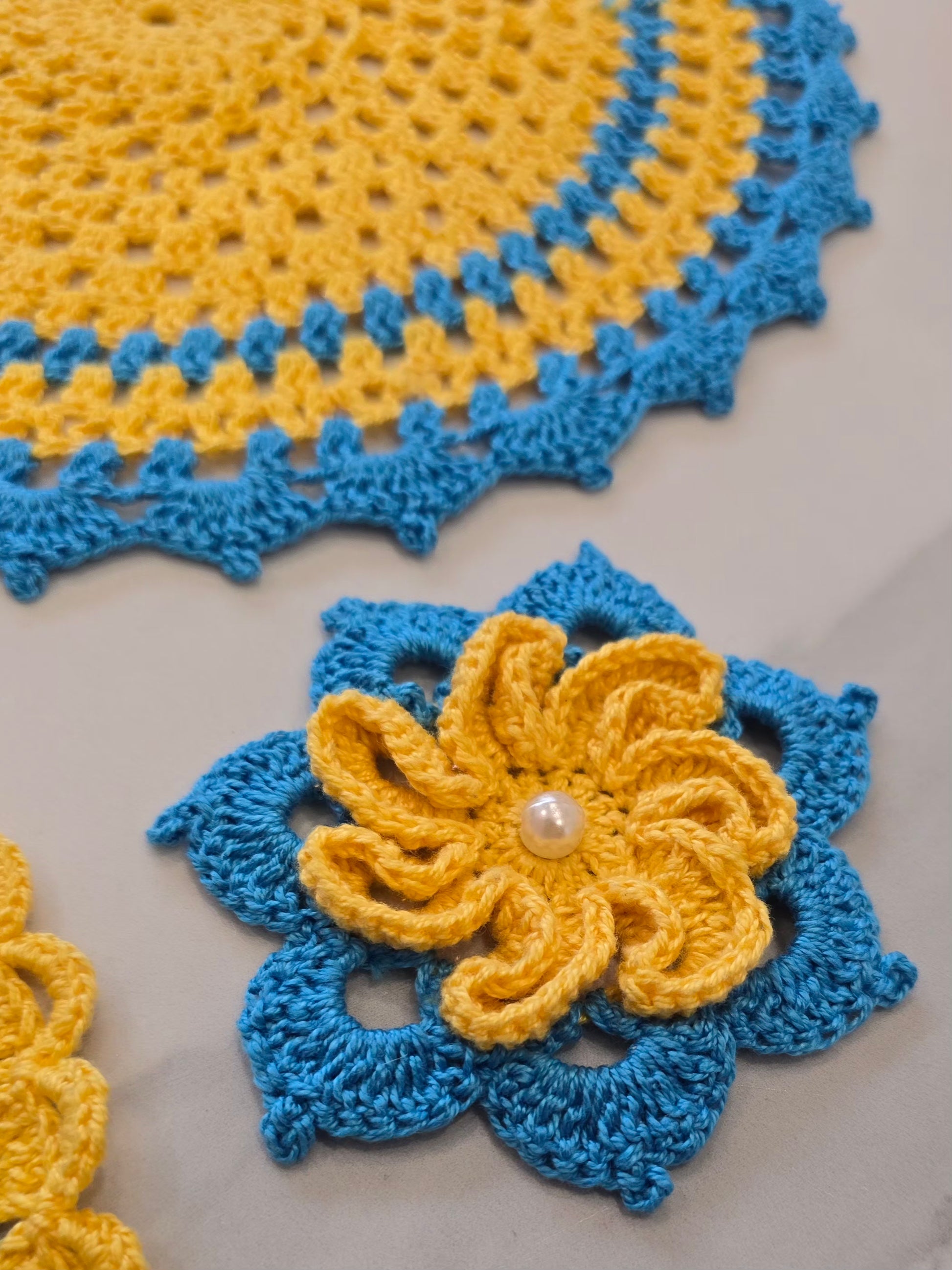 Utilisation : Idéal pour décorer une table, un meuble ou un plateau. Les fleurs peuvent être posées sur les napperons ou utilisées séparément comme accessoire décoratif. Un ensemble ensoleillé qui apporte une touche artisanale et joyeuse à votre intérieur.