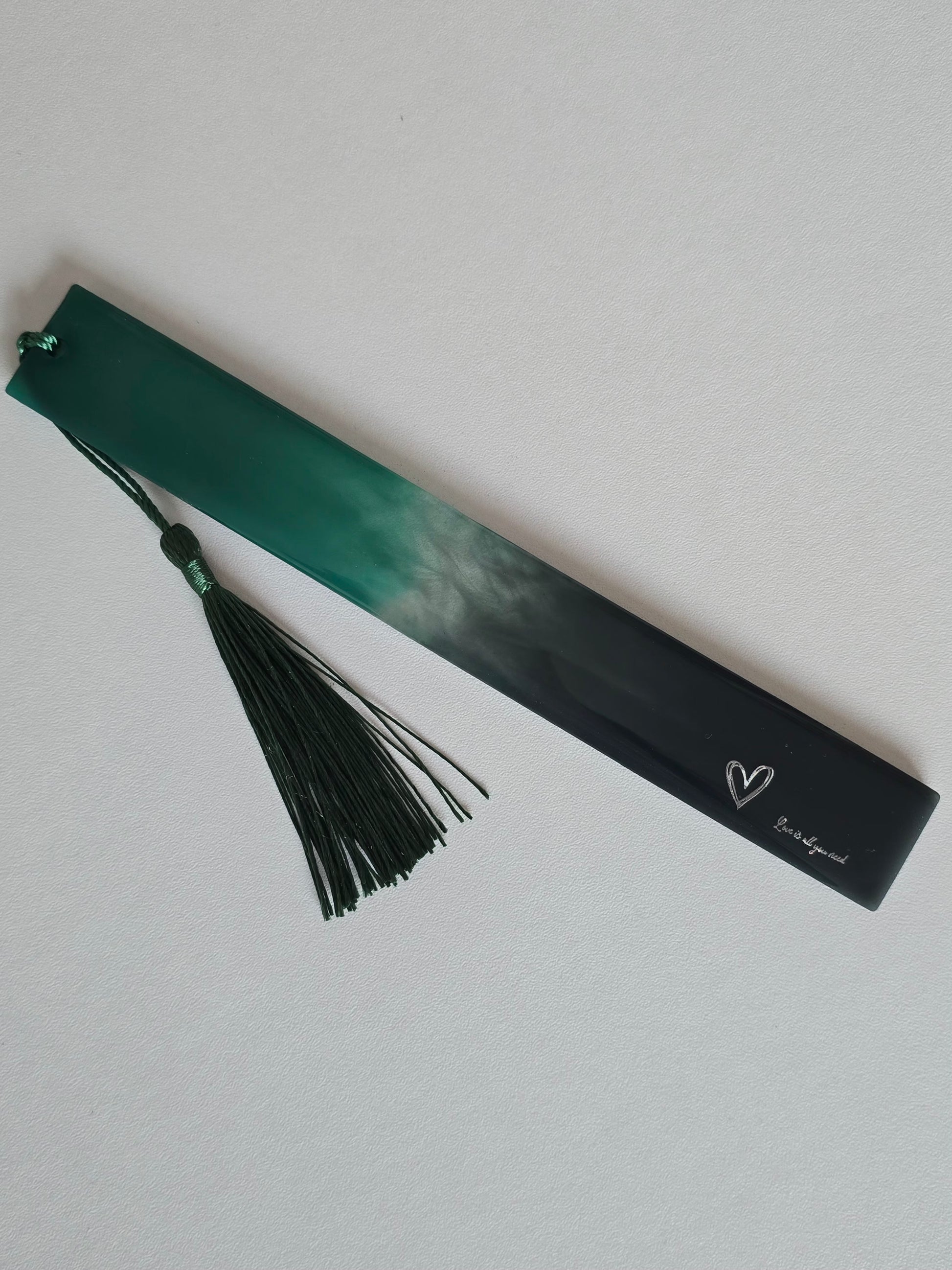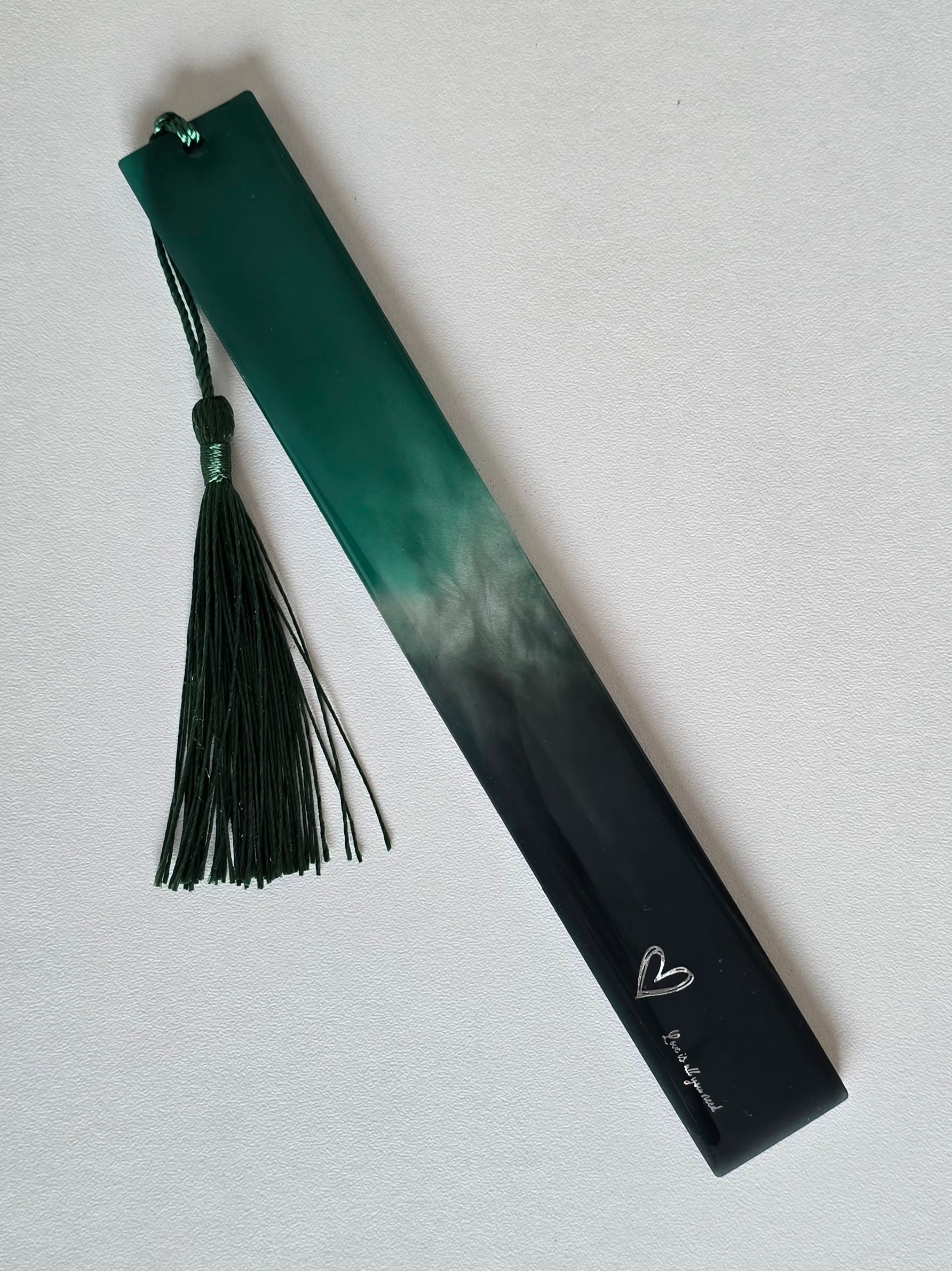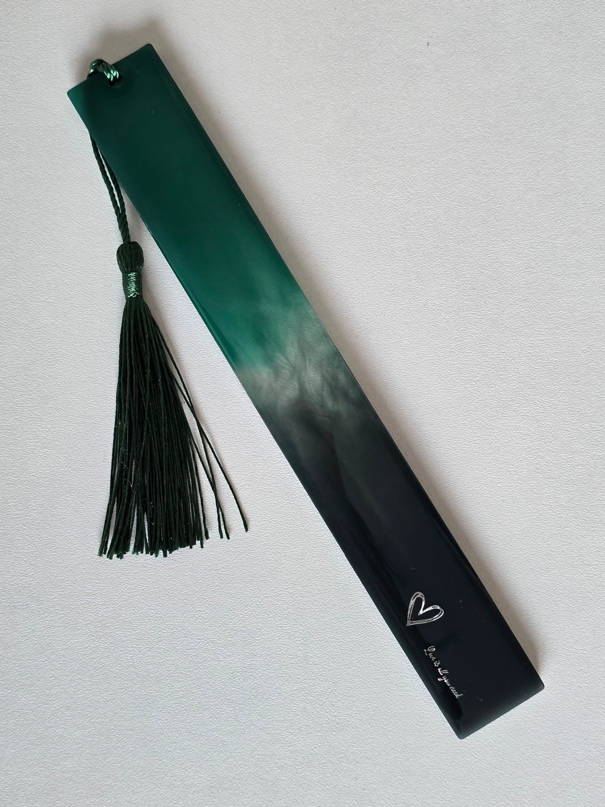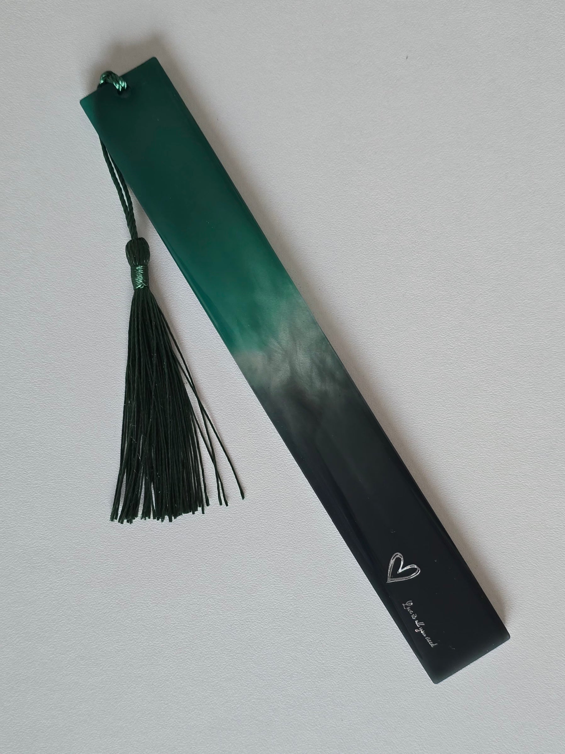 Laissez-vous séduire par l'élégance de ce marque-page unique, fait main, alliant modernité et délicatesse. Réalisé en résine epoxy, il se distingue par son subtil dégradé vert, transparent et noir, apportant un effet raffiné et intemporel.