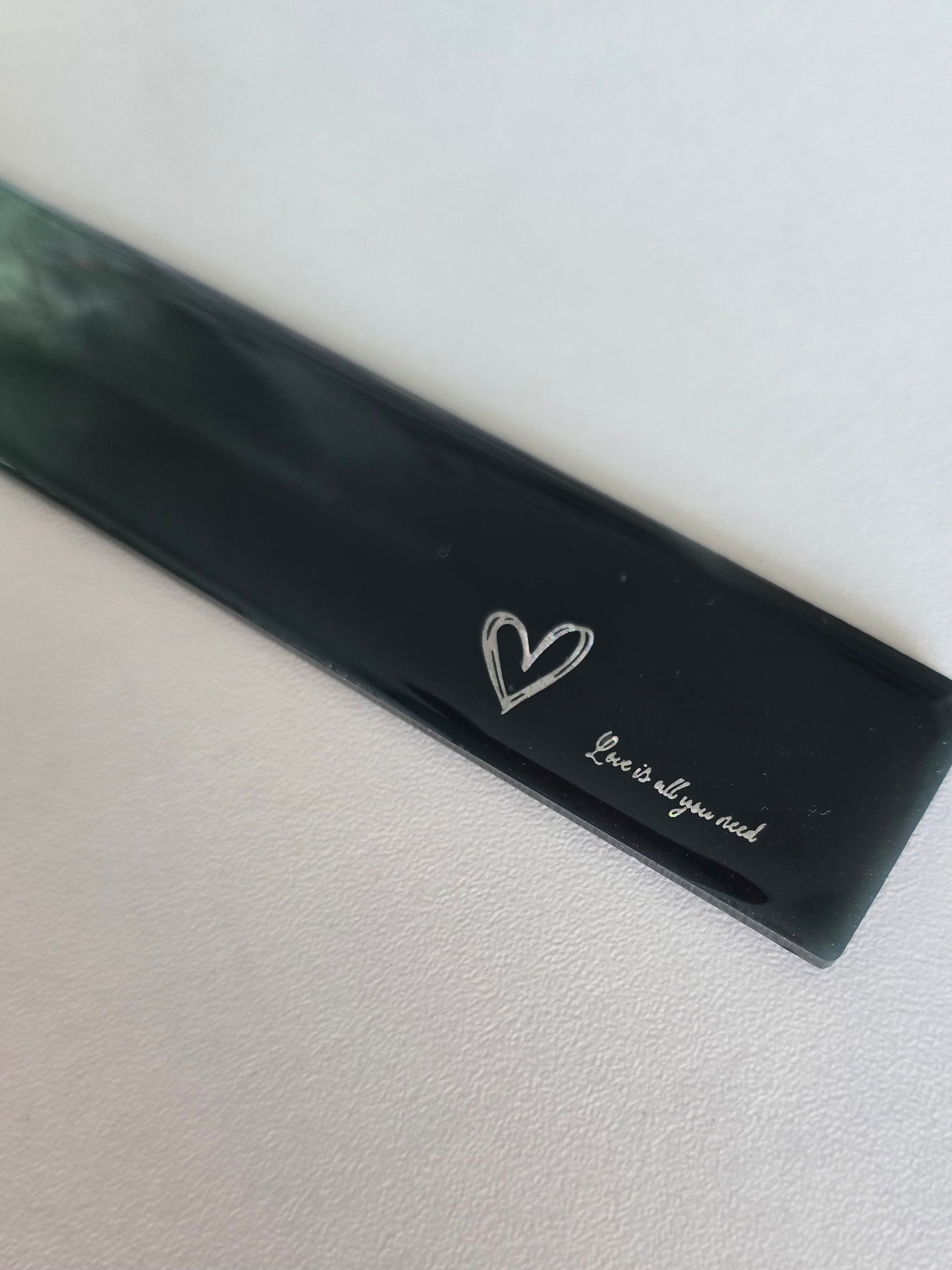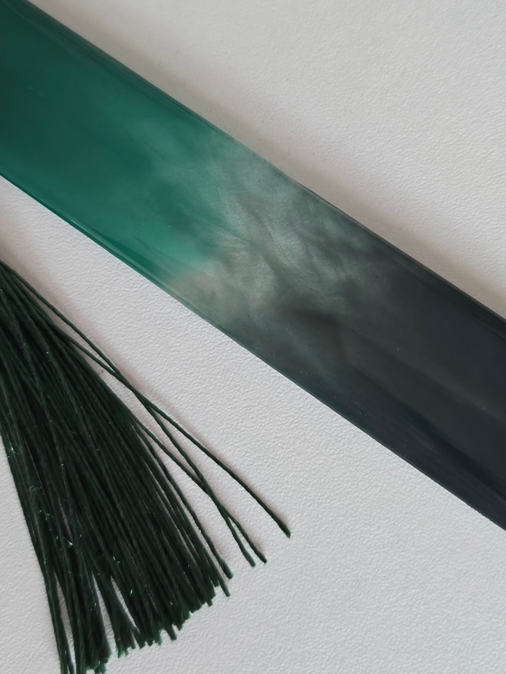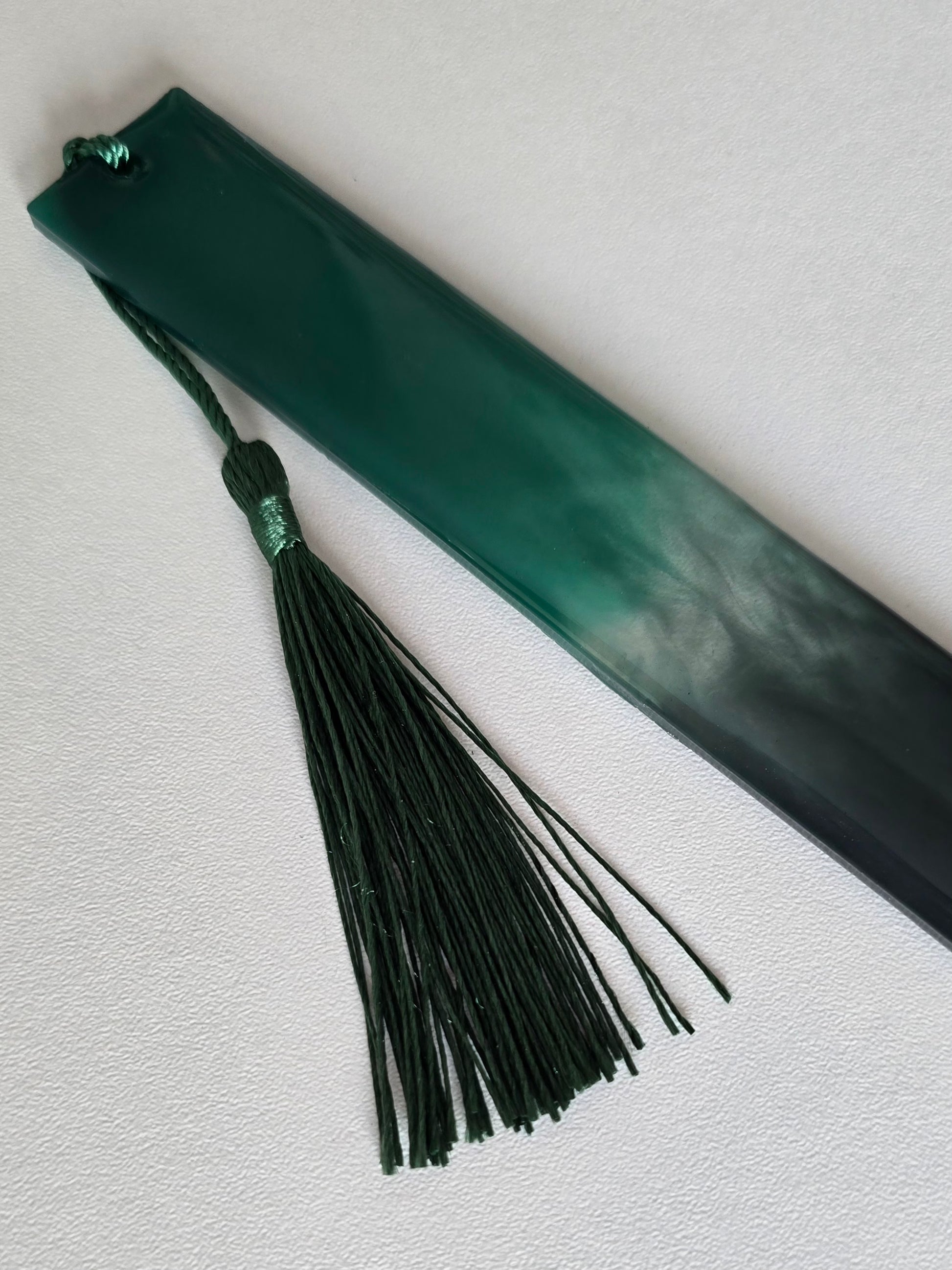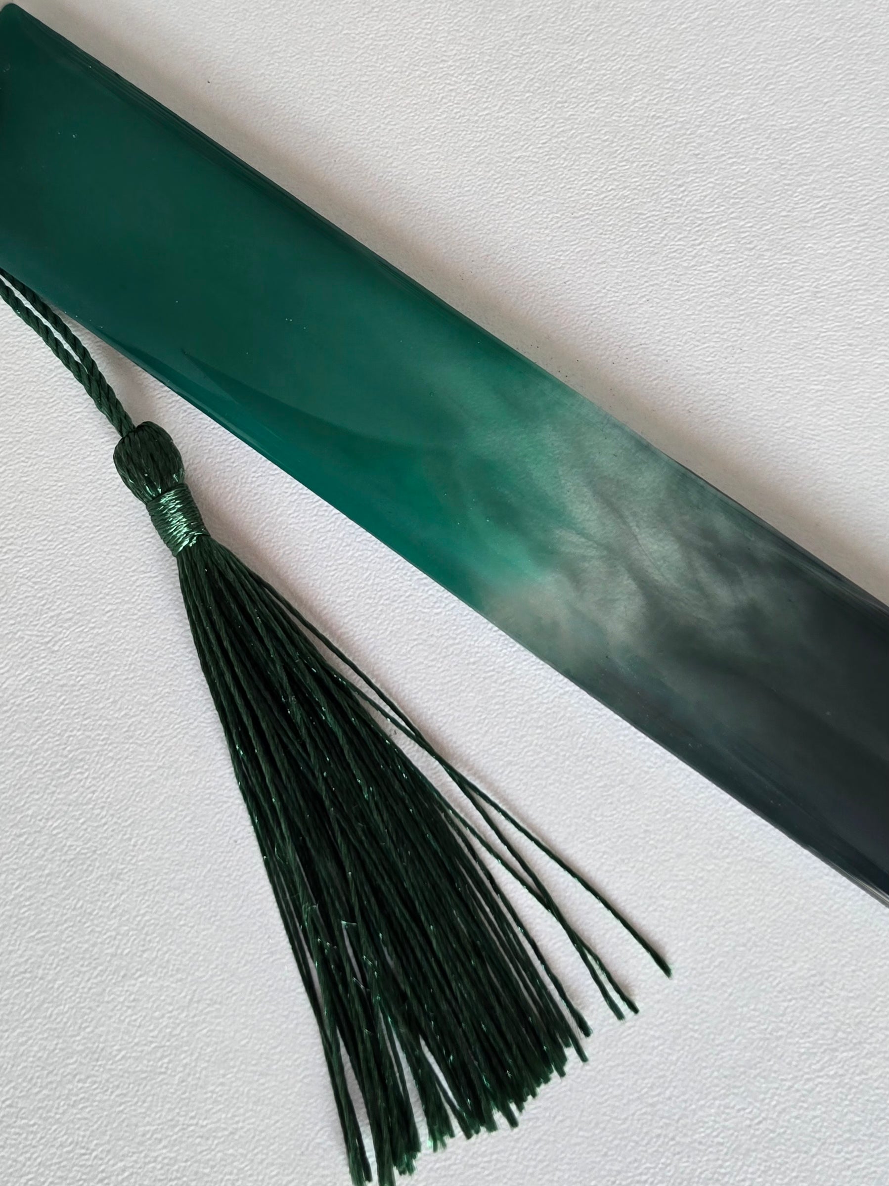 Laissez-vous séduire par l'élégance de ce marque-page unique, fait main, alliant modernité et délicatesse. Réalisé en résine epoxy, il se distingue par son subtil dégradé vert, transparent et noir, apportant un effet raffiné et intemporel.