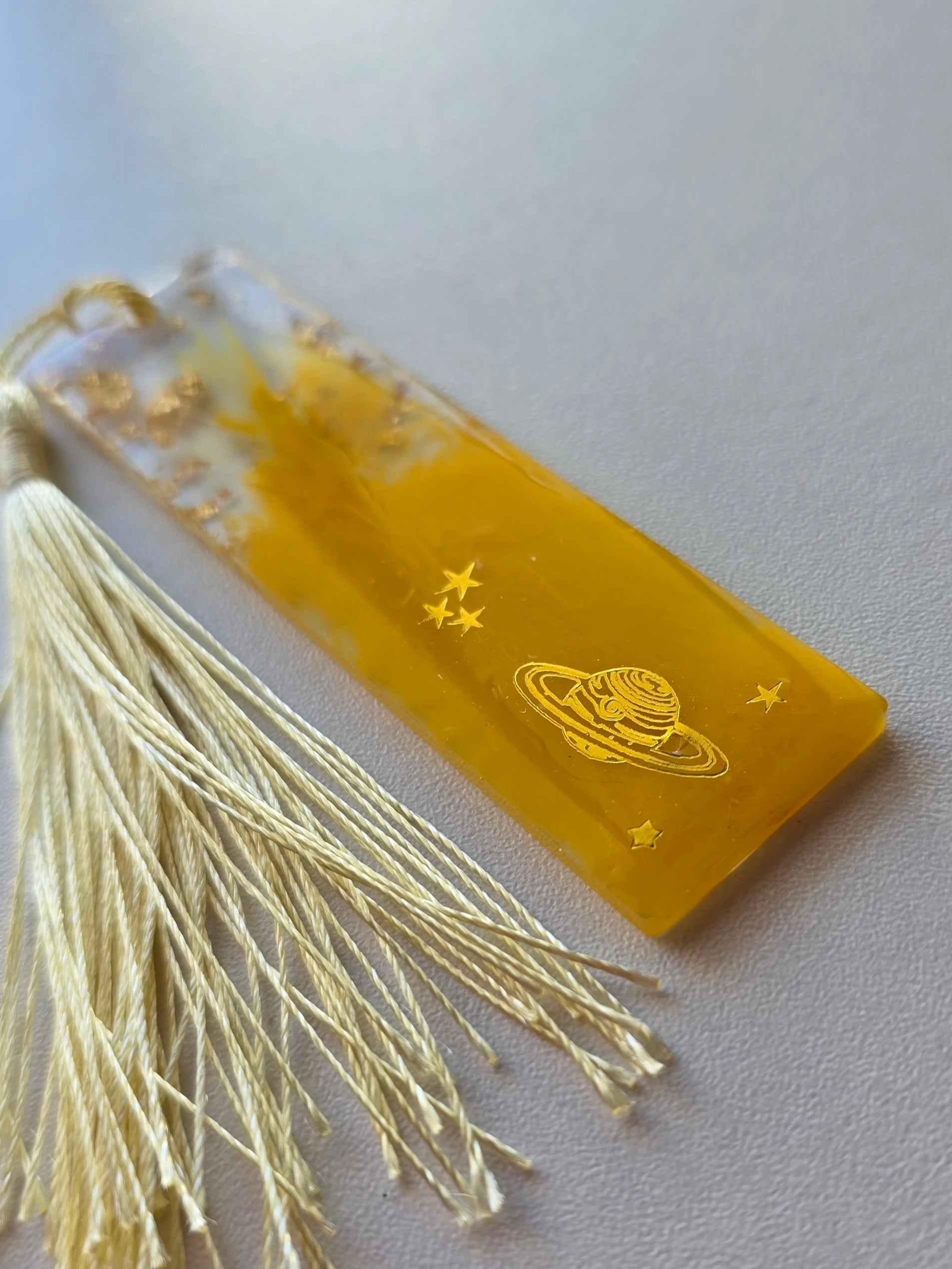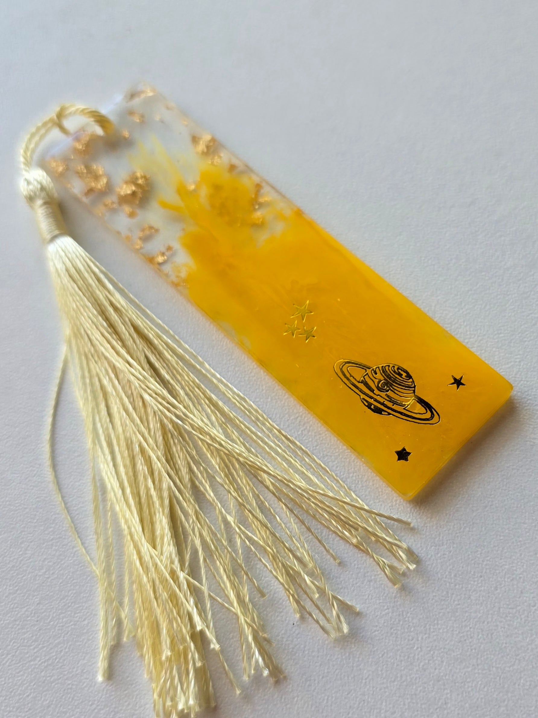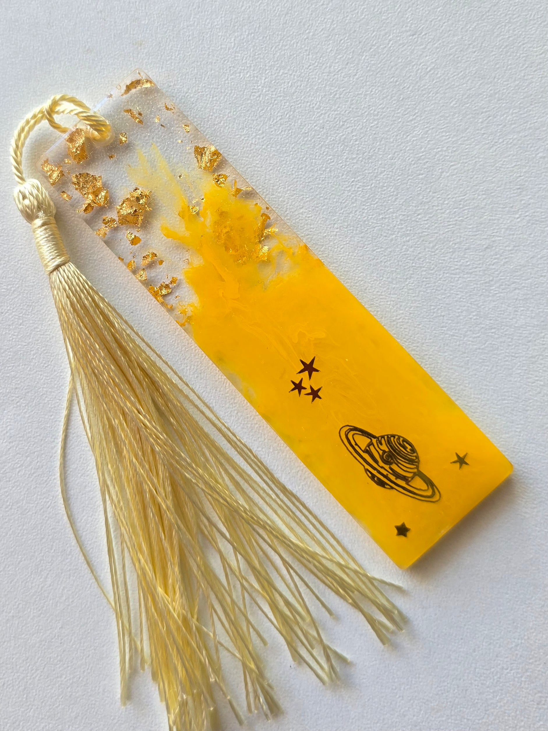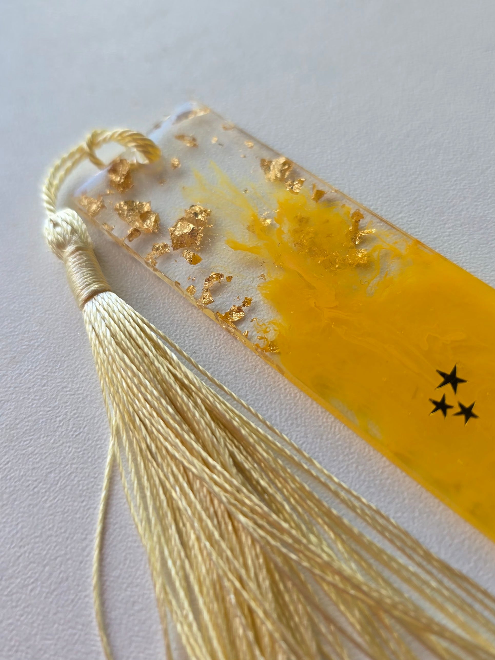 Plongez dans la magie des étoiles avec ce marque-page unique en résine epoxy artisanale. Son design mêle la transparence et un jaune éclatant, rehaussé de feuilles dorées scintillantes qui captent la lumière à chaque angle.