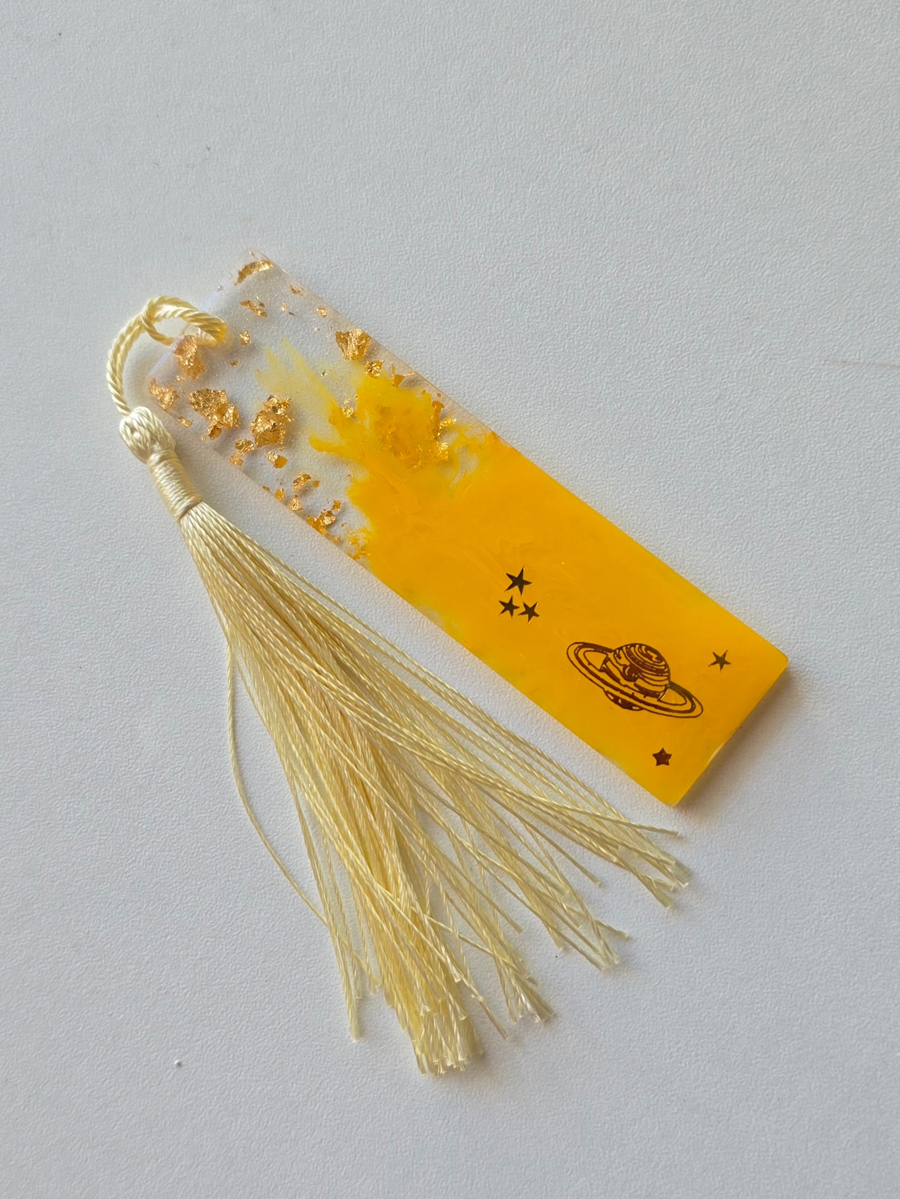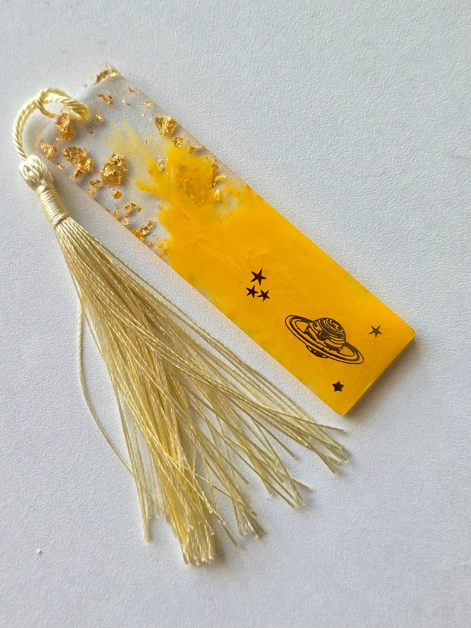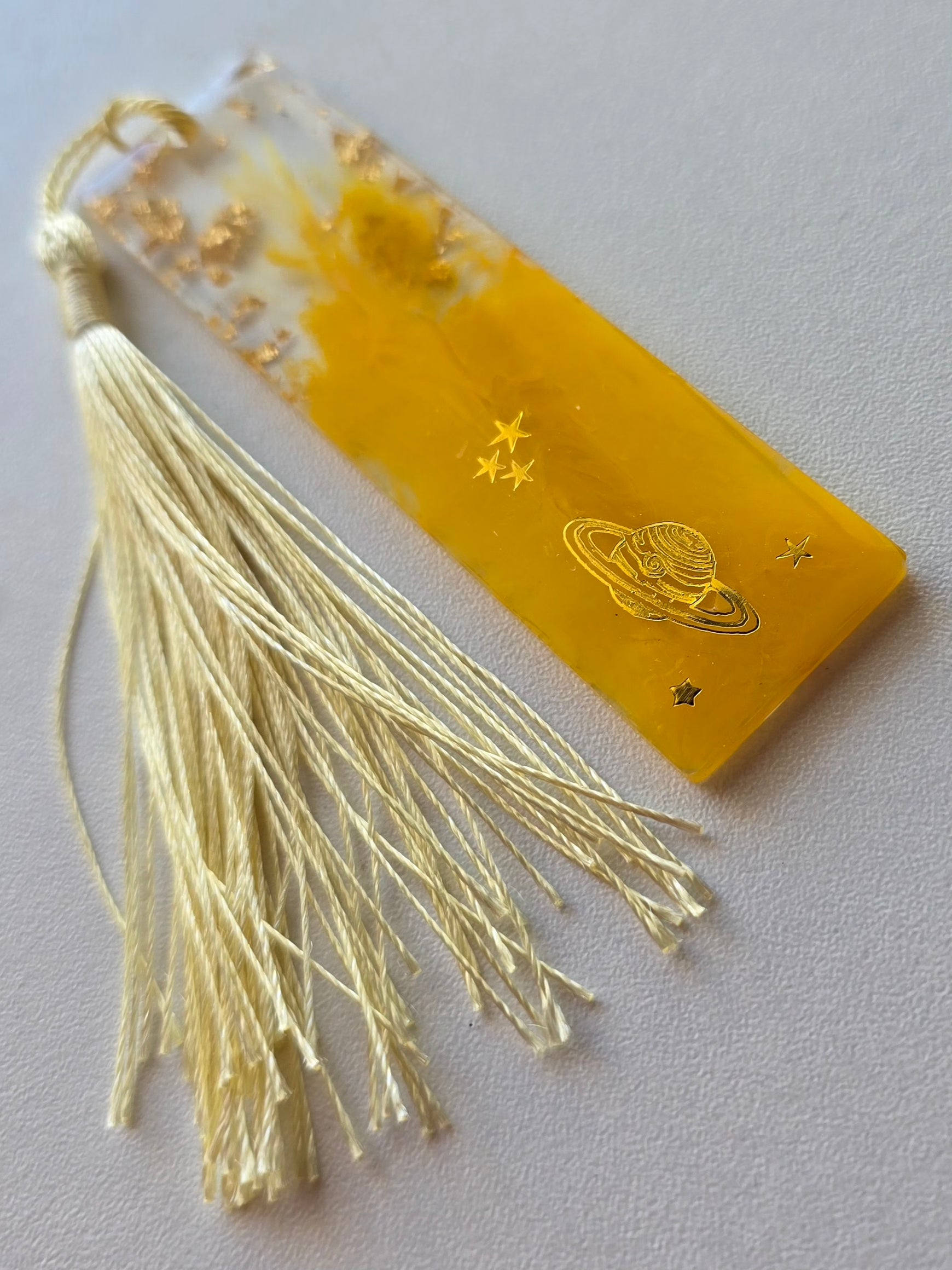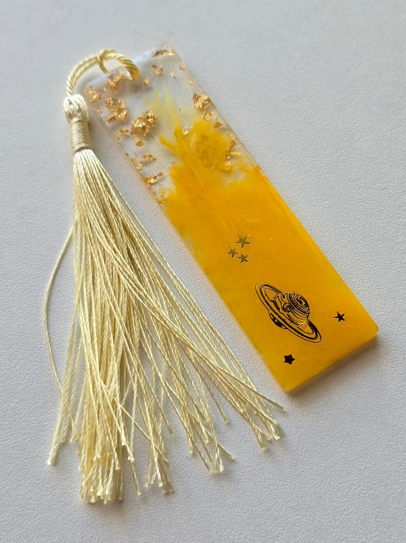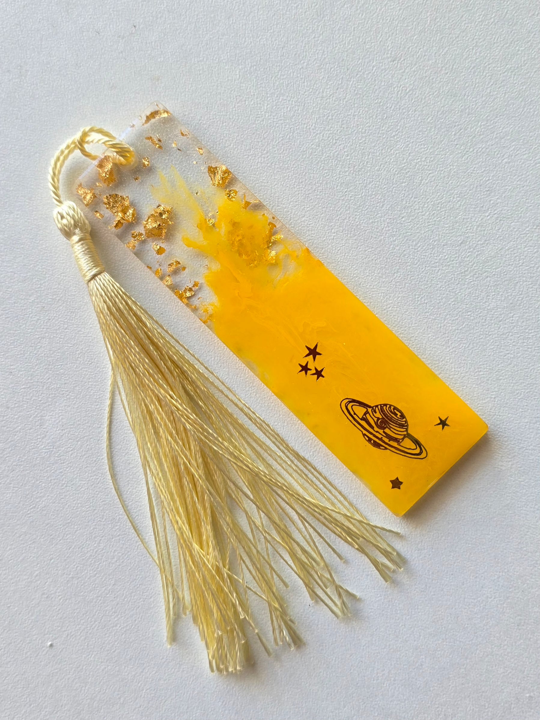 Plongez dans la magie des étoiles avec ce marque-page unique en résine epoxy artisanale. Son design mêle la transparence et un jaune éclatant, rehaussé de feuilles dorées scintillantes qui captent la lumière à chaque angle.
