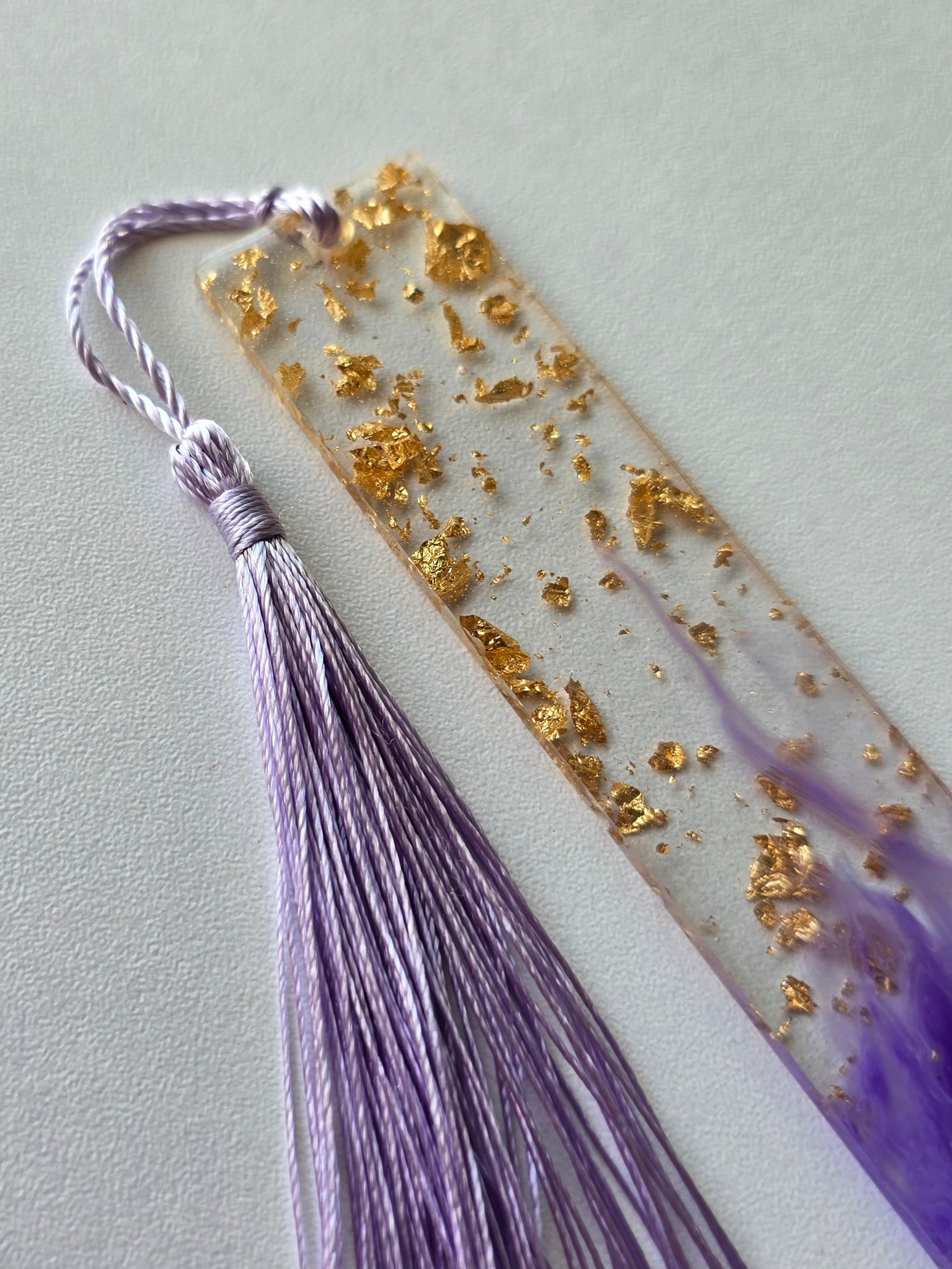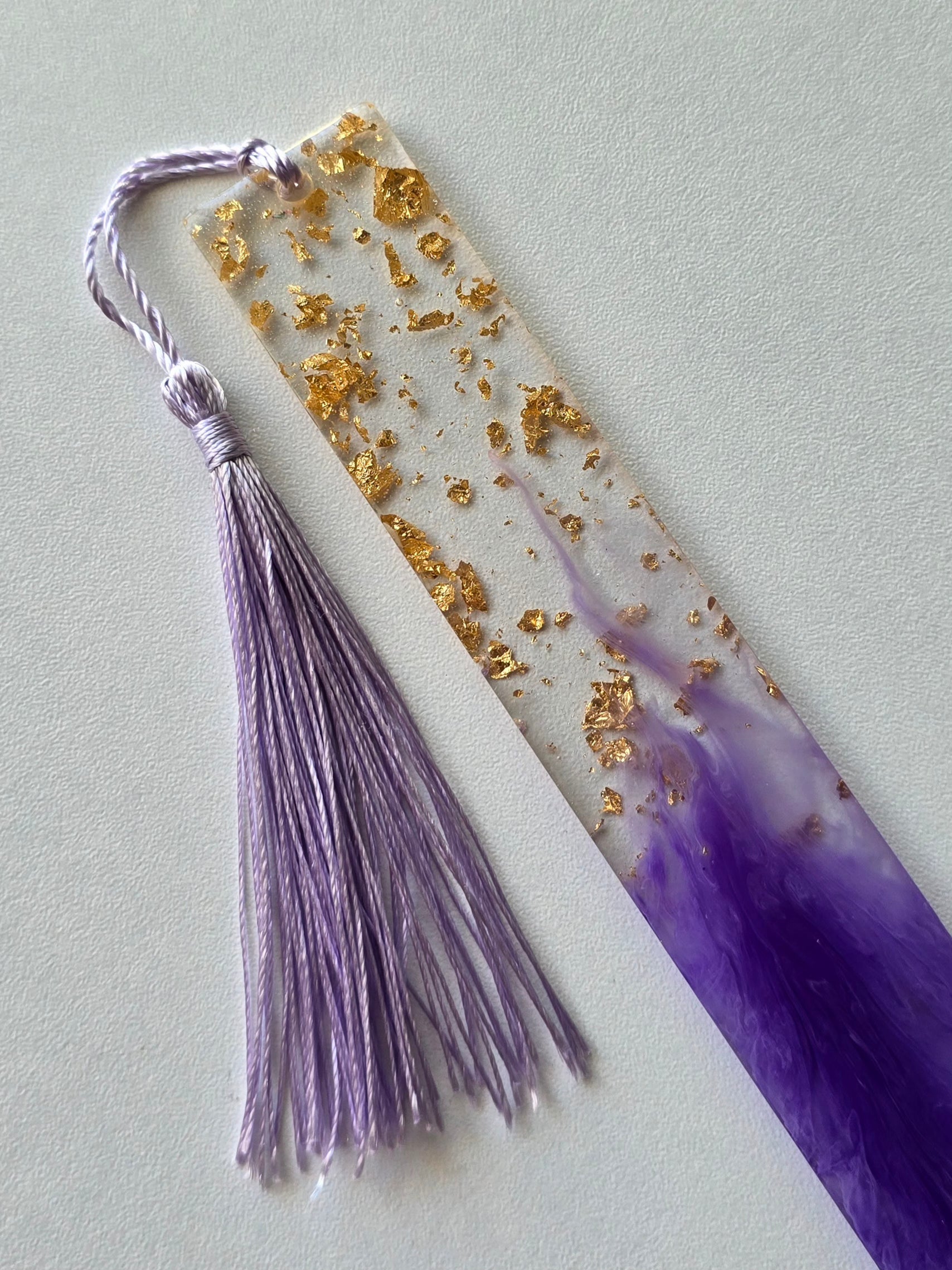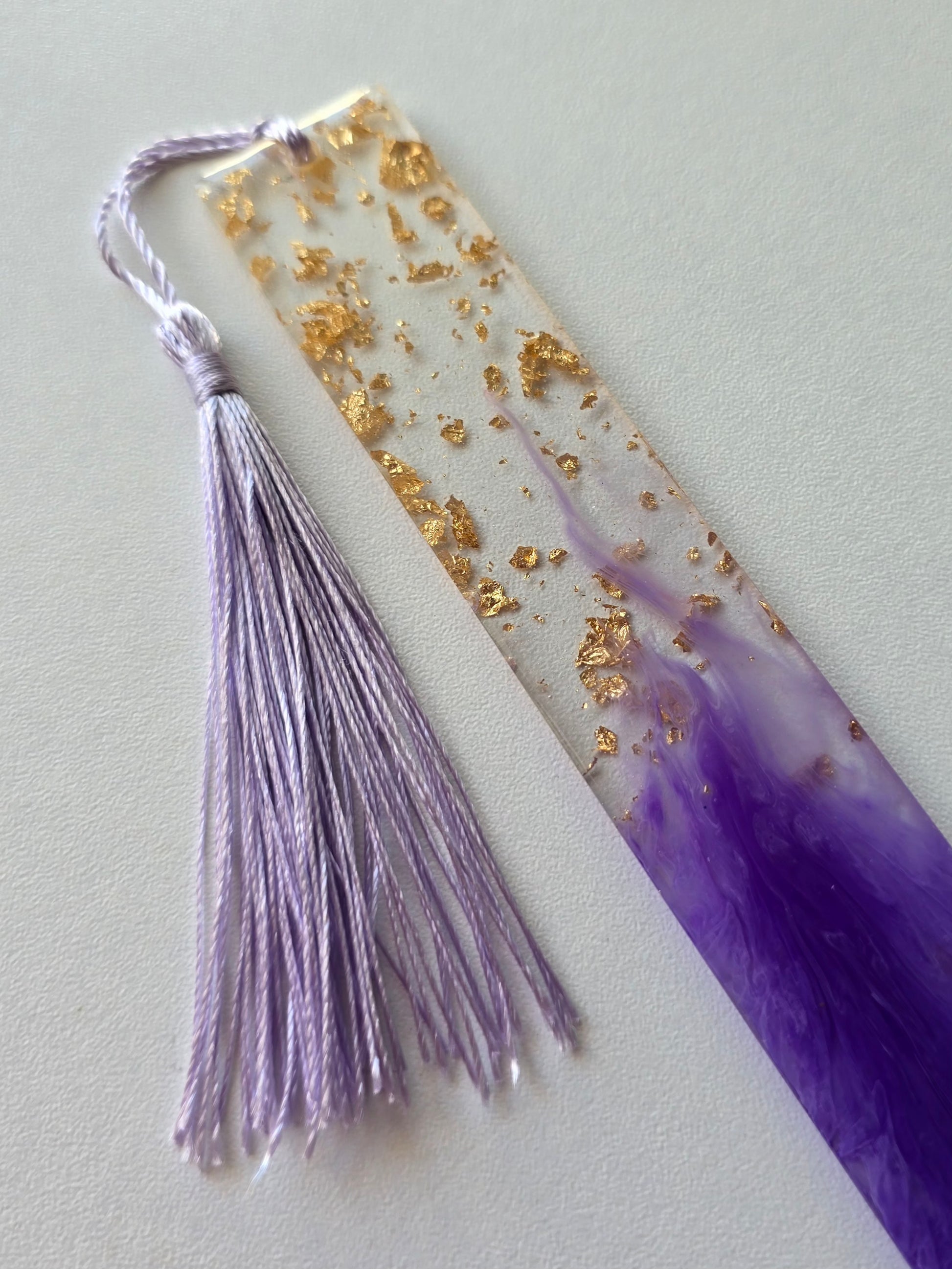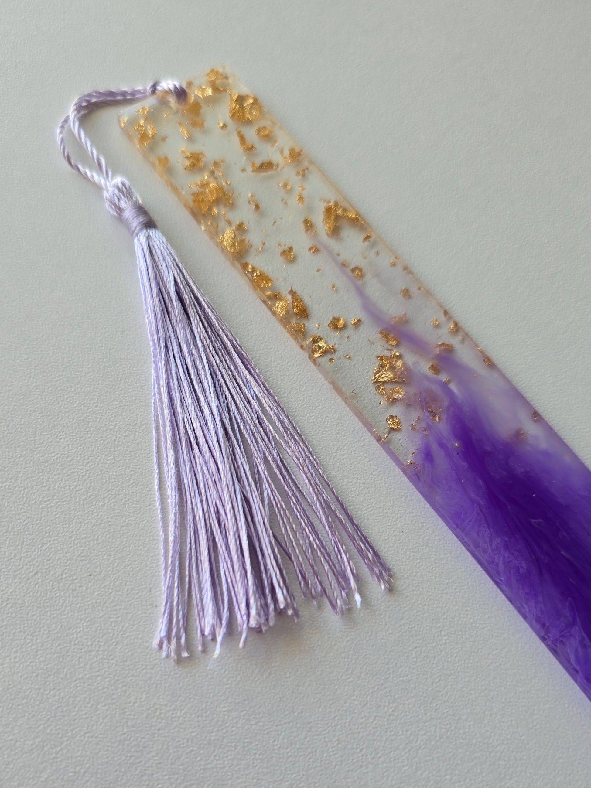 Un accessoire raffiné qui allie élégance et émotion. Réalisé en résine epoxy artisanale, ce marque-page mêle la profondeur du violet, la transparence cristalline et l'éclat de feuilles dorées scintillantes.