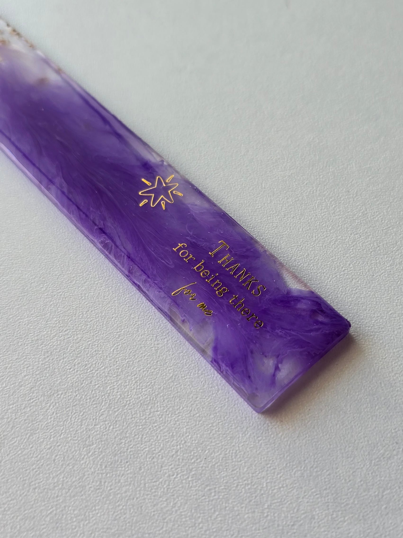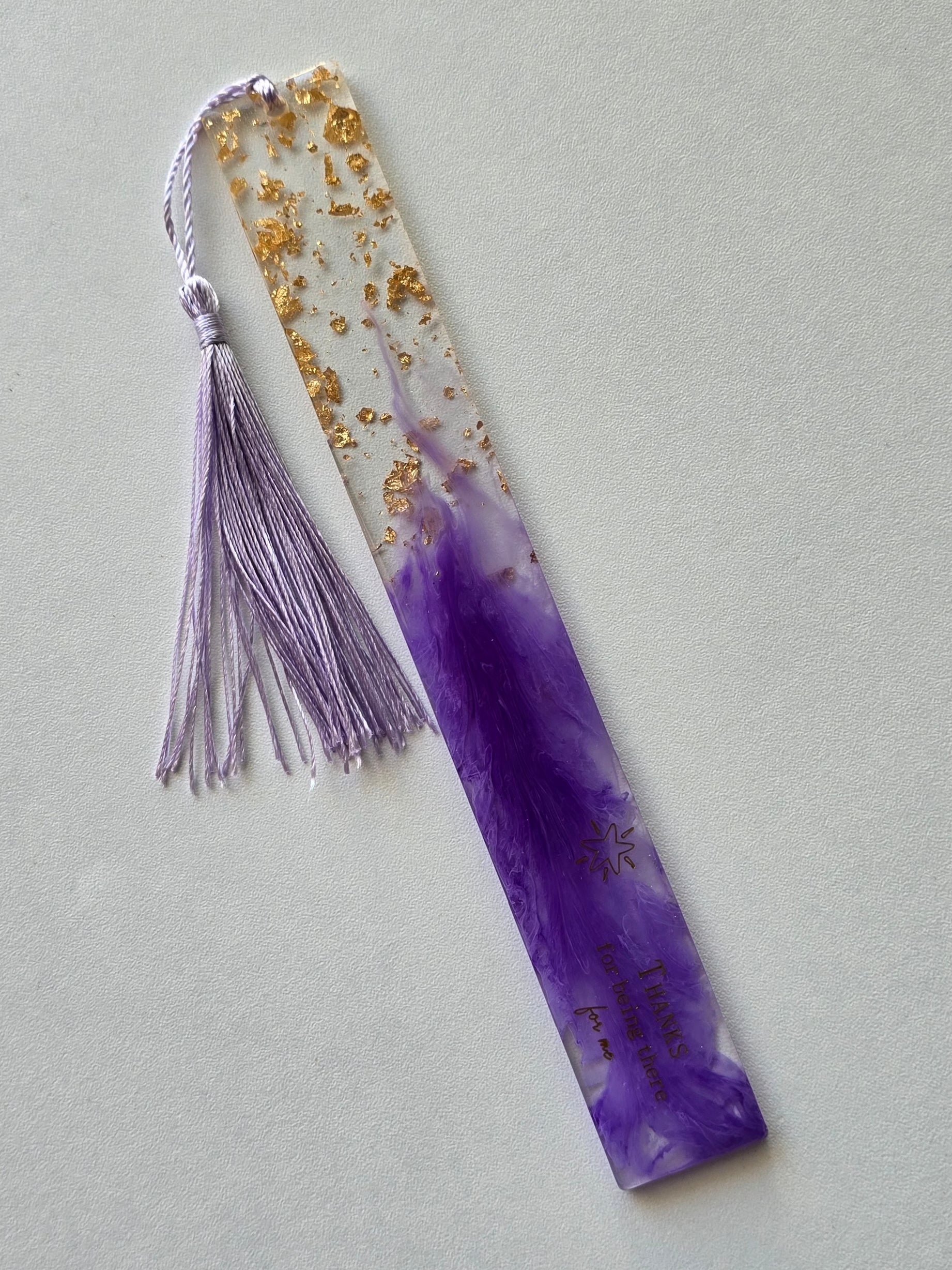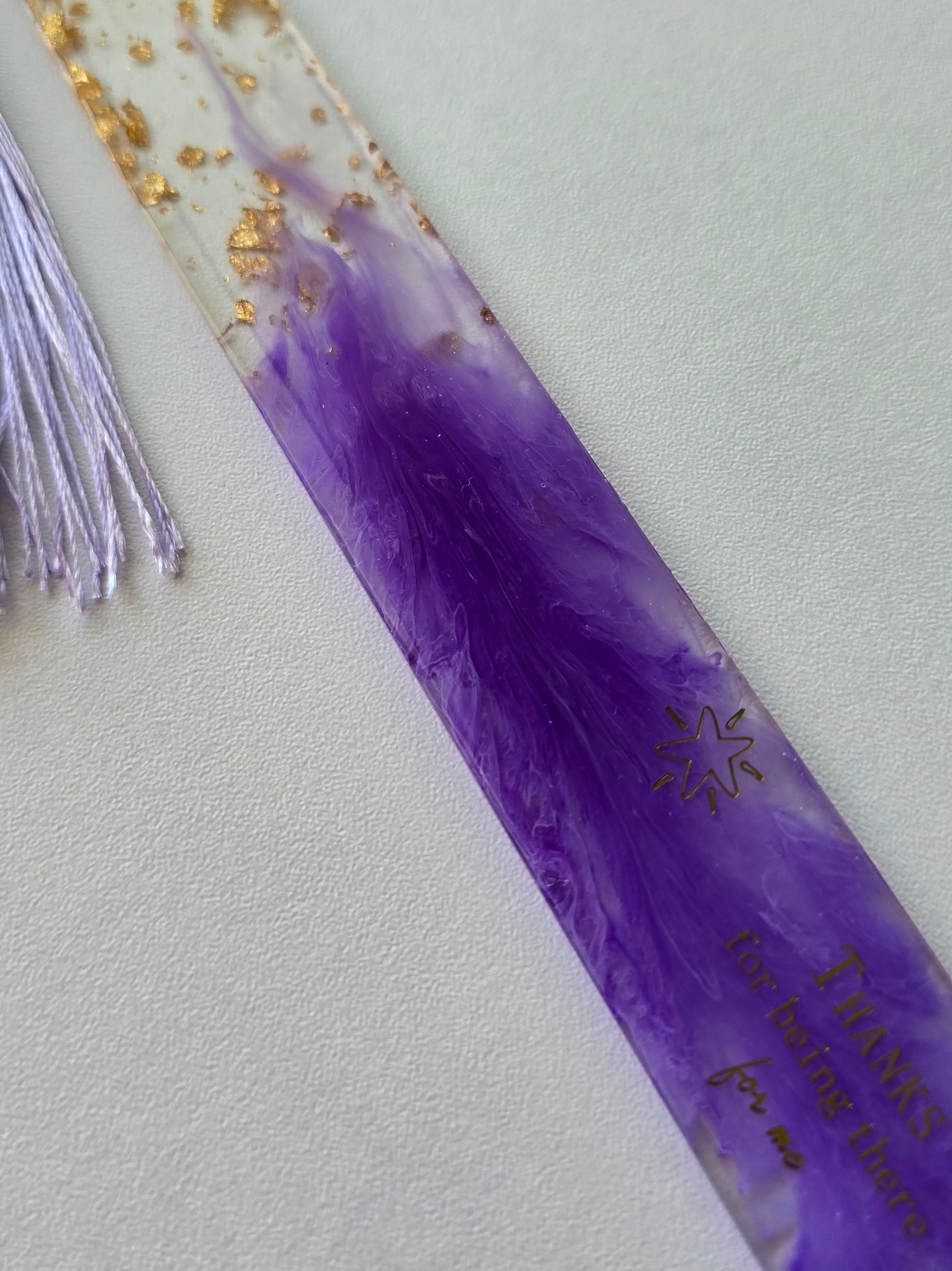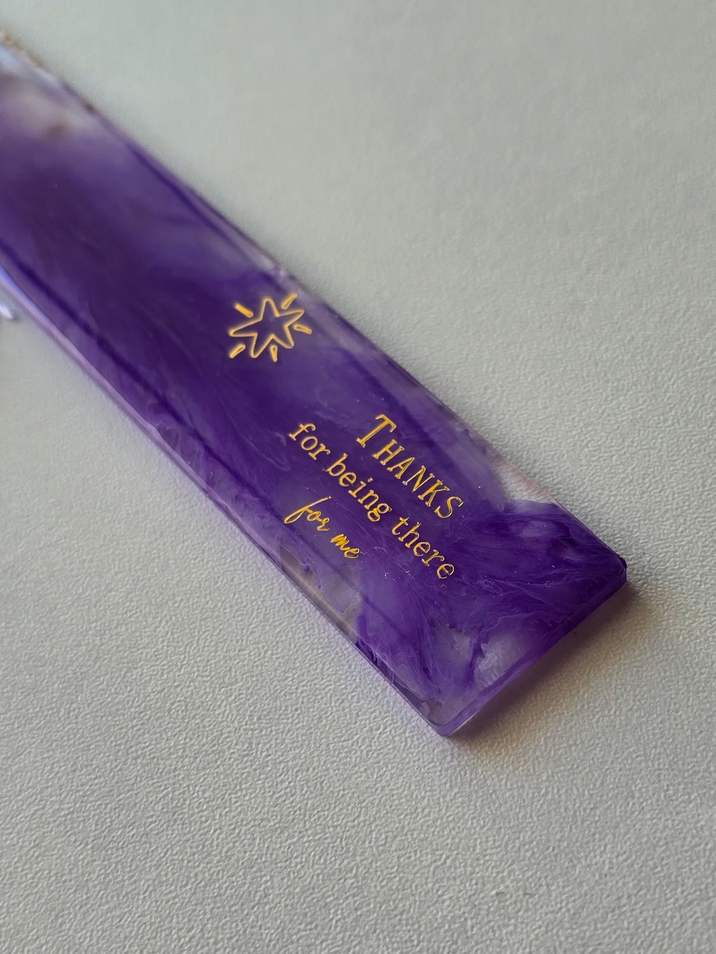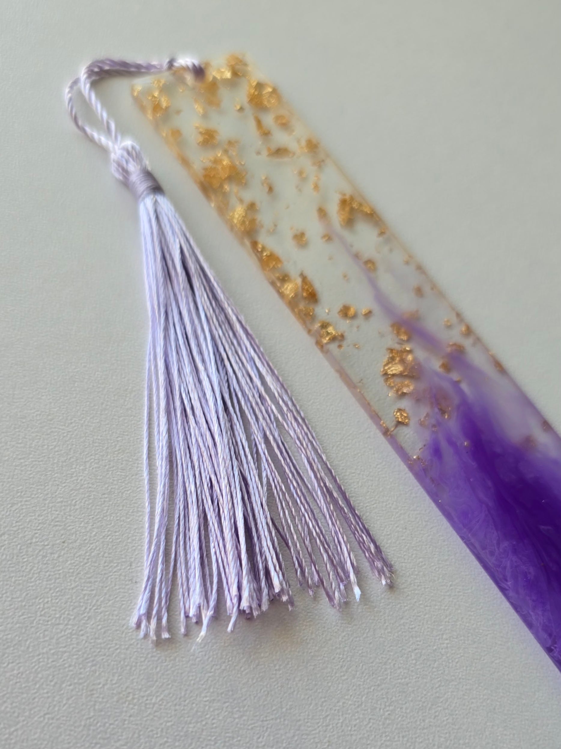 Un accessoire raffiné qui allie élégance et émotion. Réalisé en résine epoxy artisanale, ce marque-page mêle la profondeur du violet, la transparence cristalline et l'éclat de feuilles dorées scintillantes.