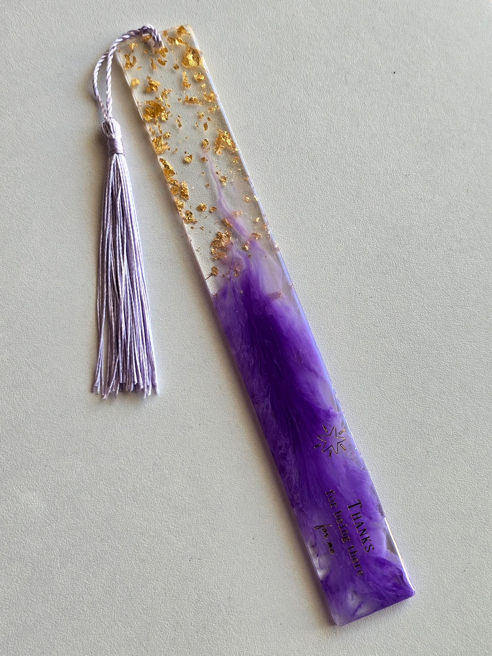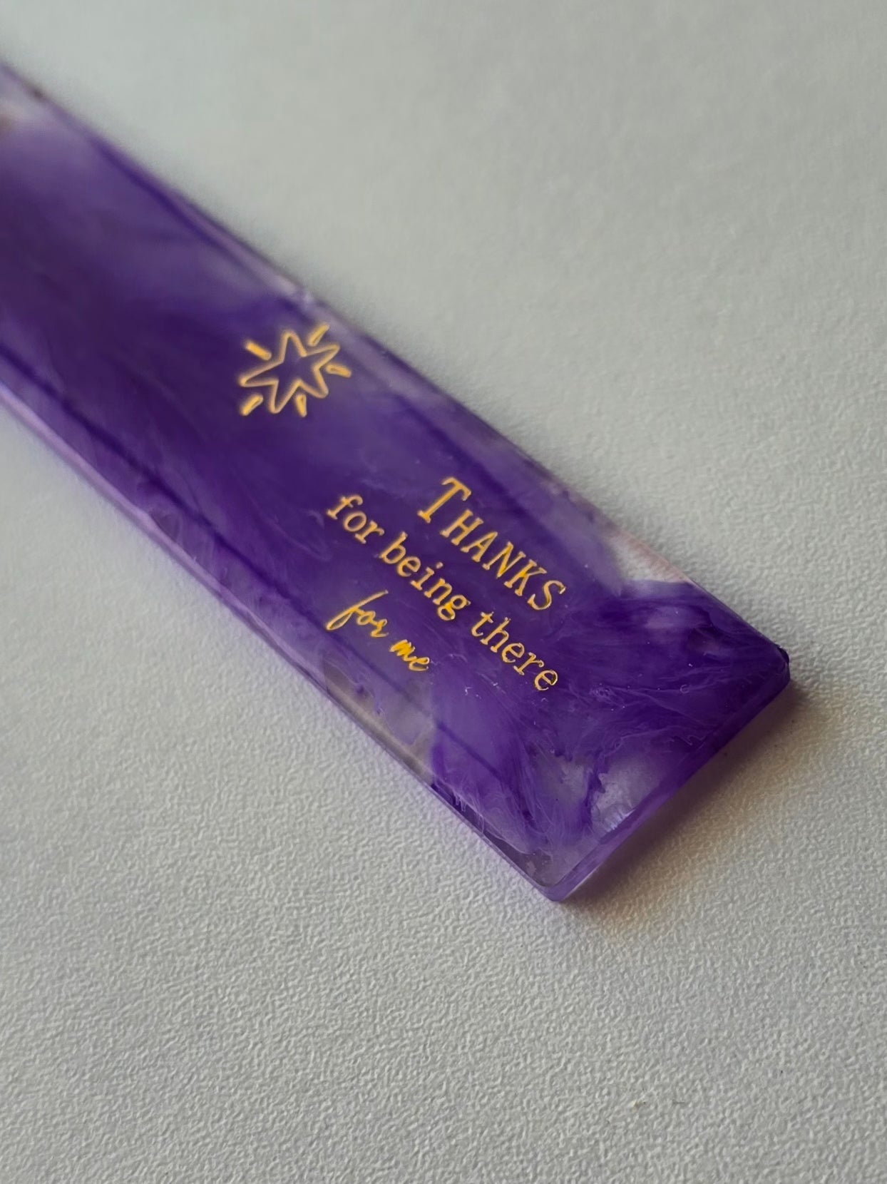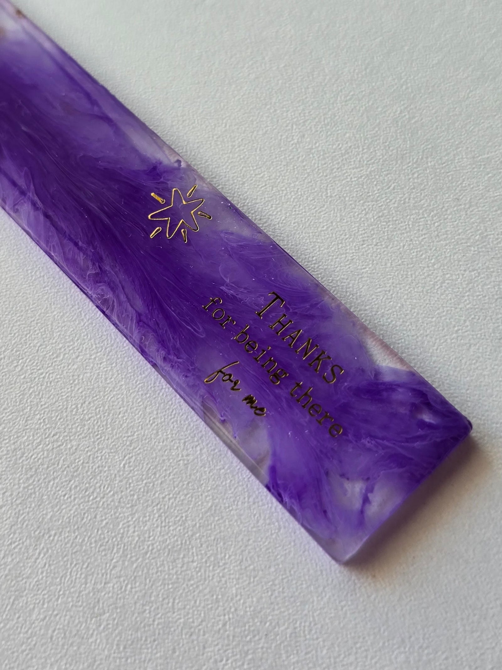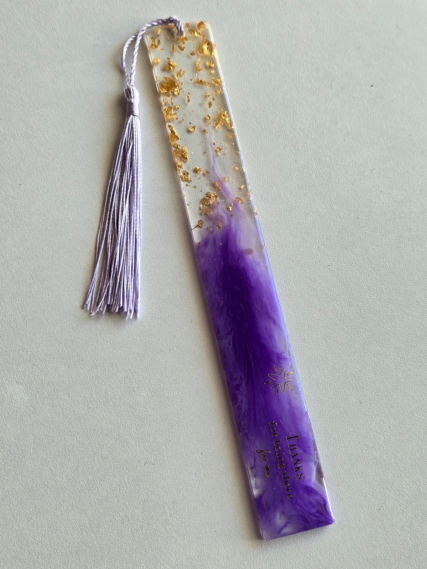 Un accessoire raffiné qui allie élégance et émotion. Réalisé en résine epoxy artisanale, ce marque-page mêle la profondeur du violet, la transparence cristalline et l'éclat de feuilles dorées scintillantes.