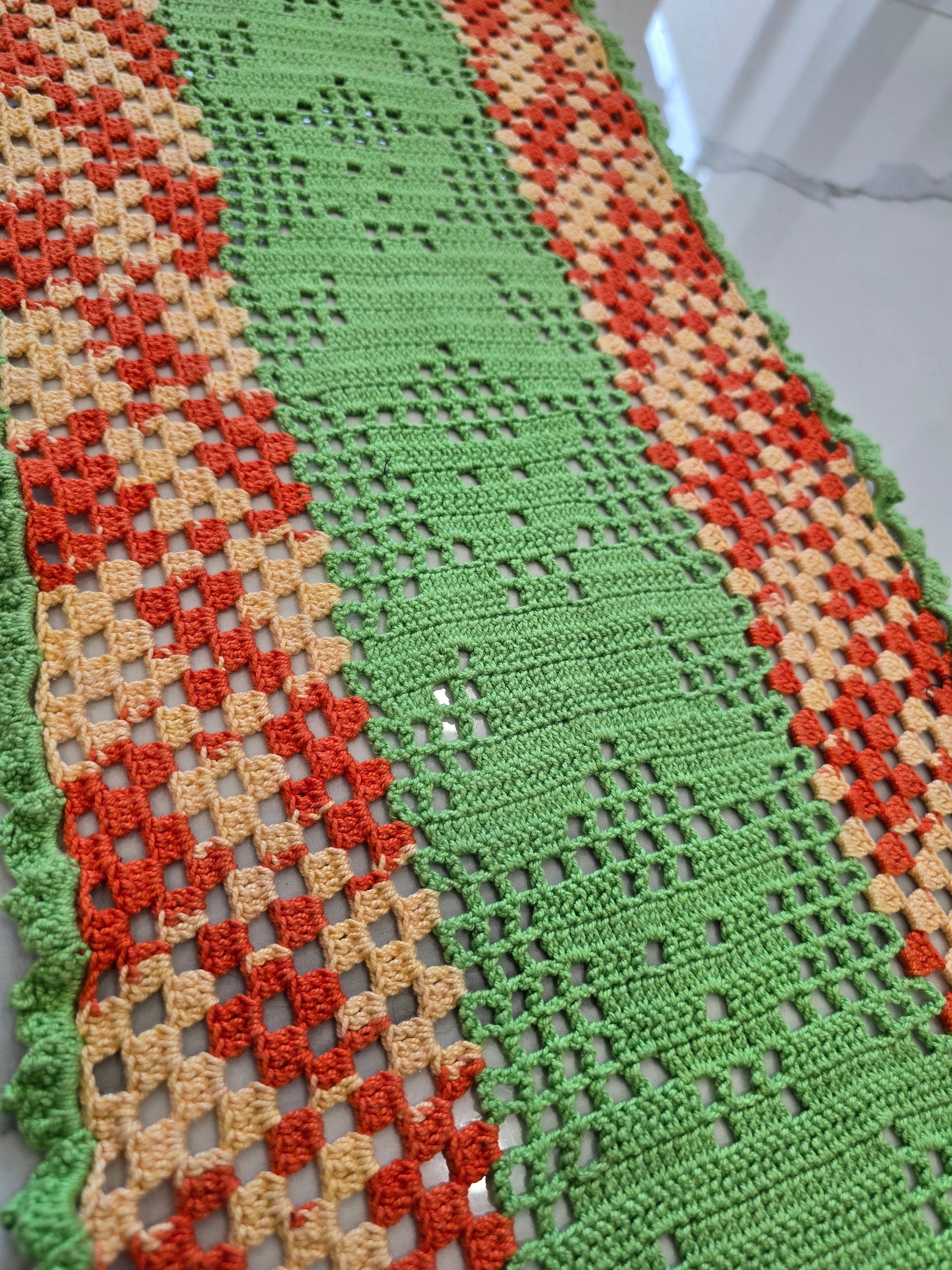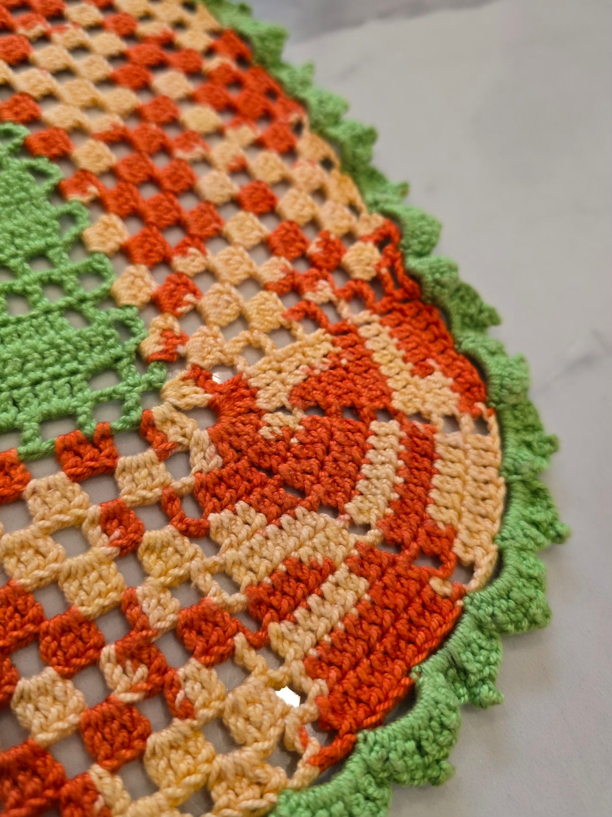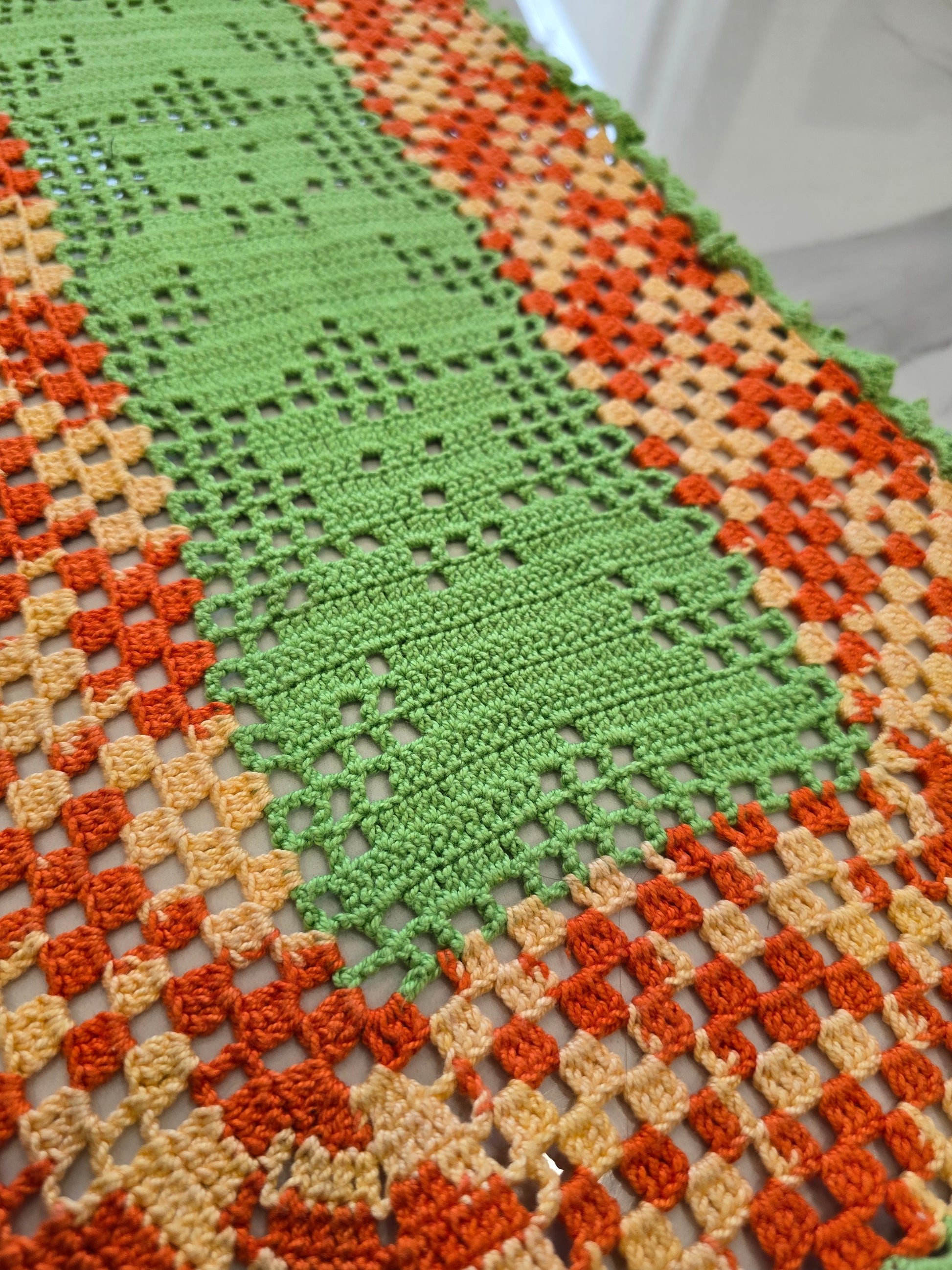 Ce napperon au crochet, réalisé entièrement à la main, présente de jolis motifs oursons au centre et un superbe mélange de vert, orange et orange pastel.