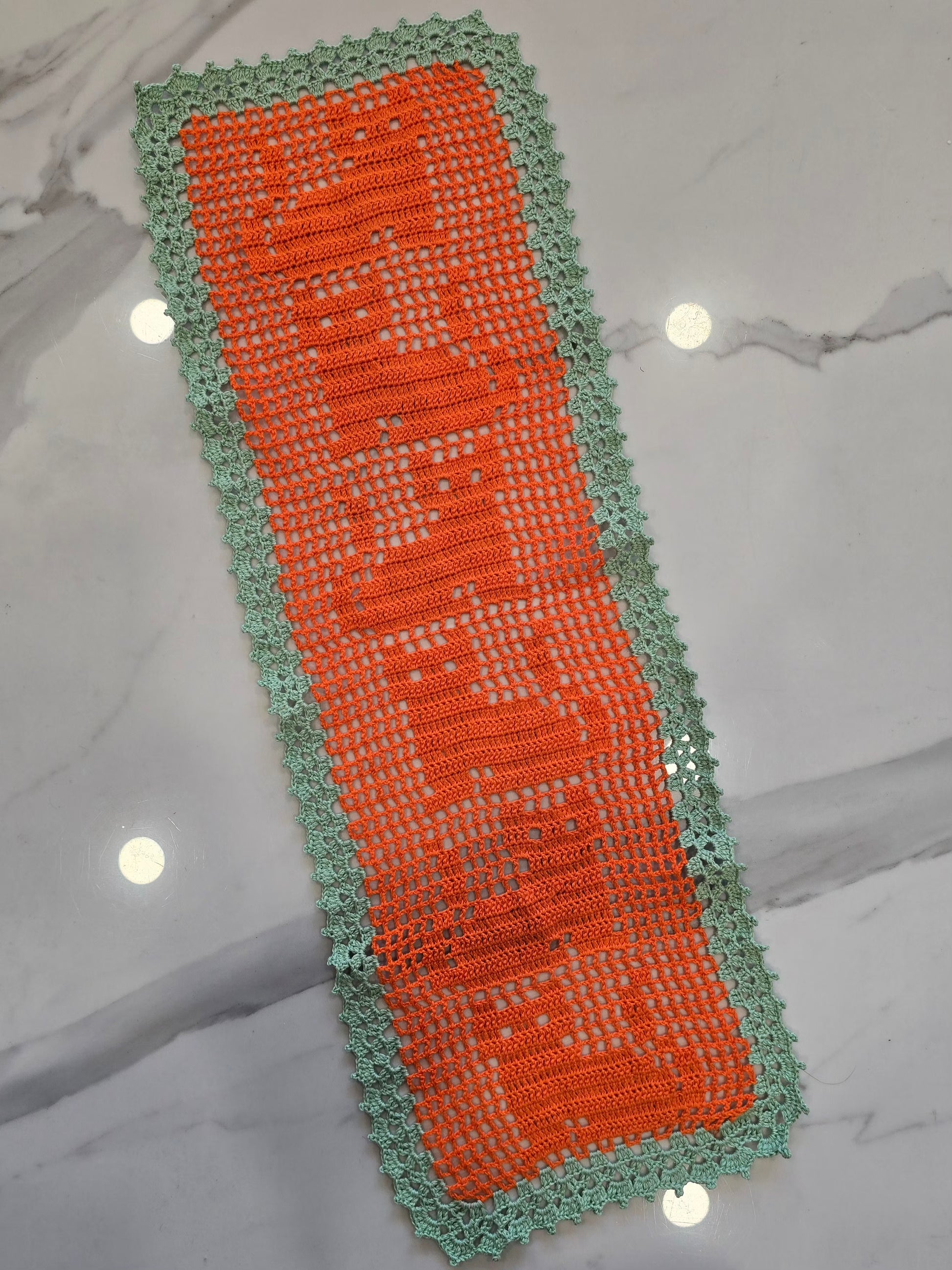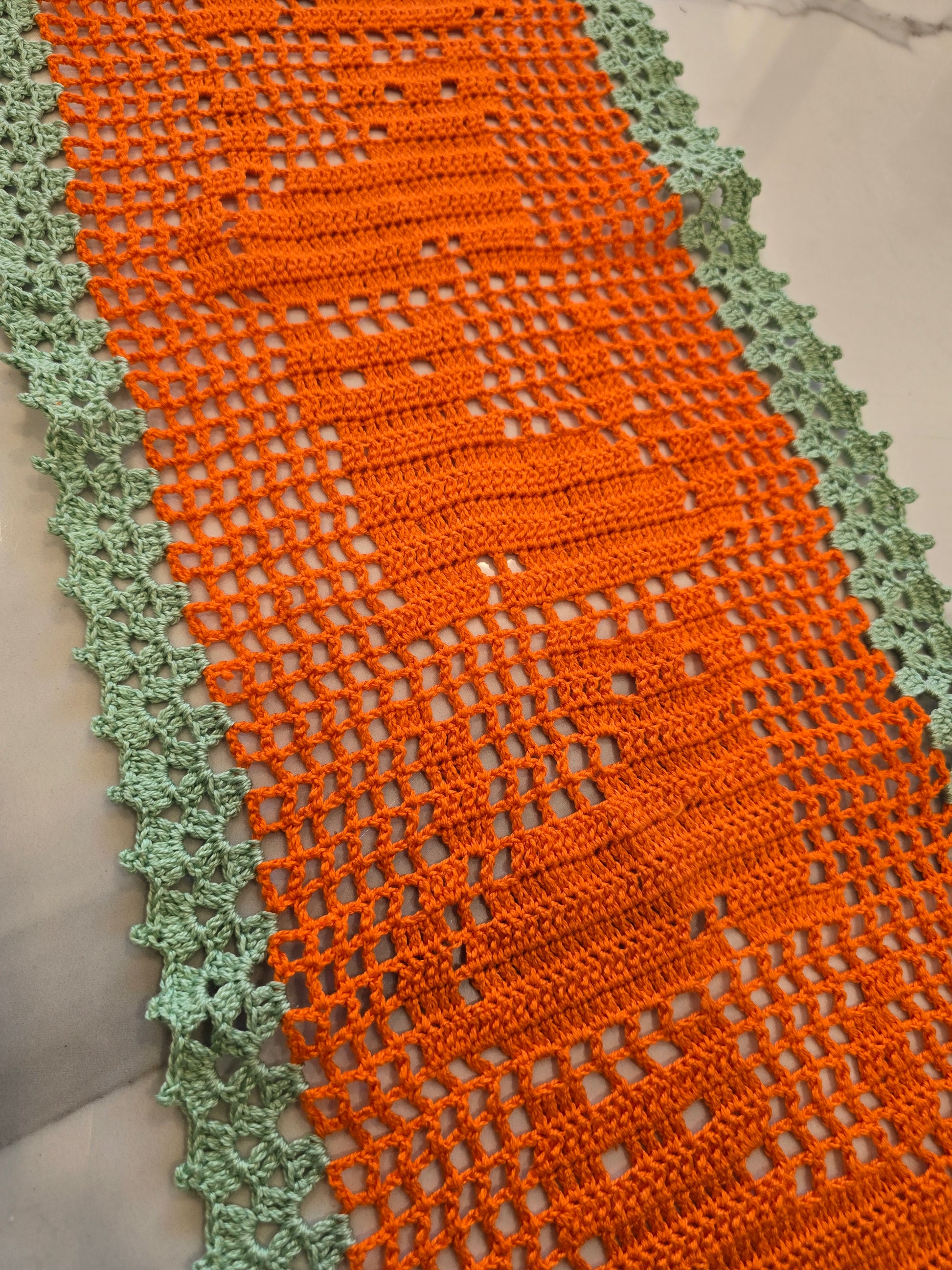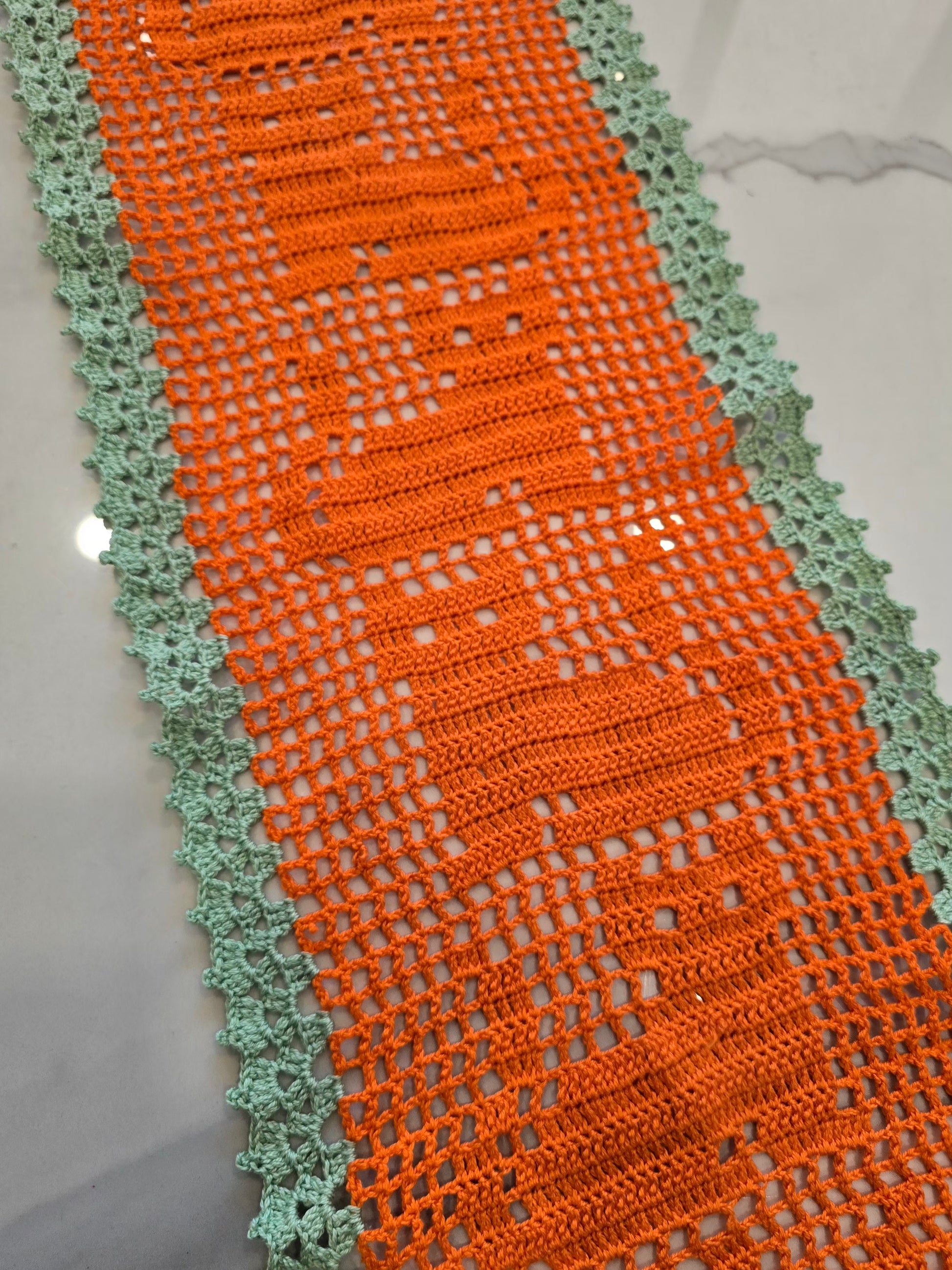 Ce magnifique chemin de table au croche, entièrement fait main, se distingue par ses motifs chats tout en délicatesse. Ses couleurs orange et vert pastel s'accordent parfaitement pour une décoration chaleureuse et joyeuse.