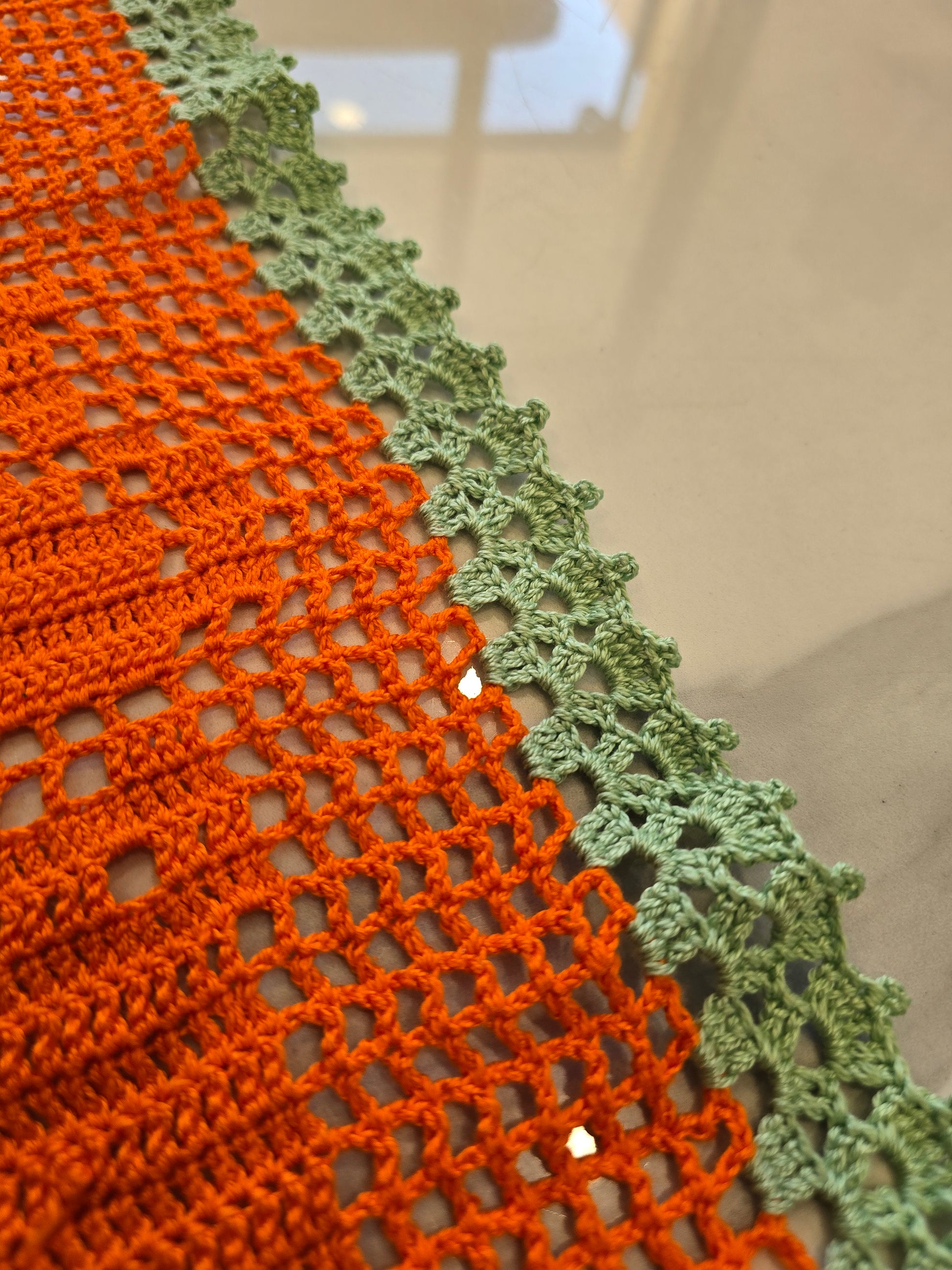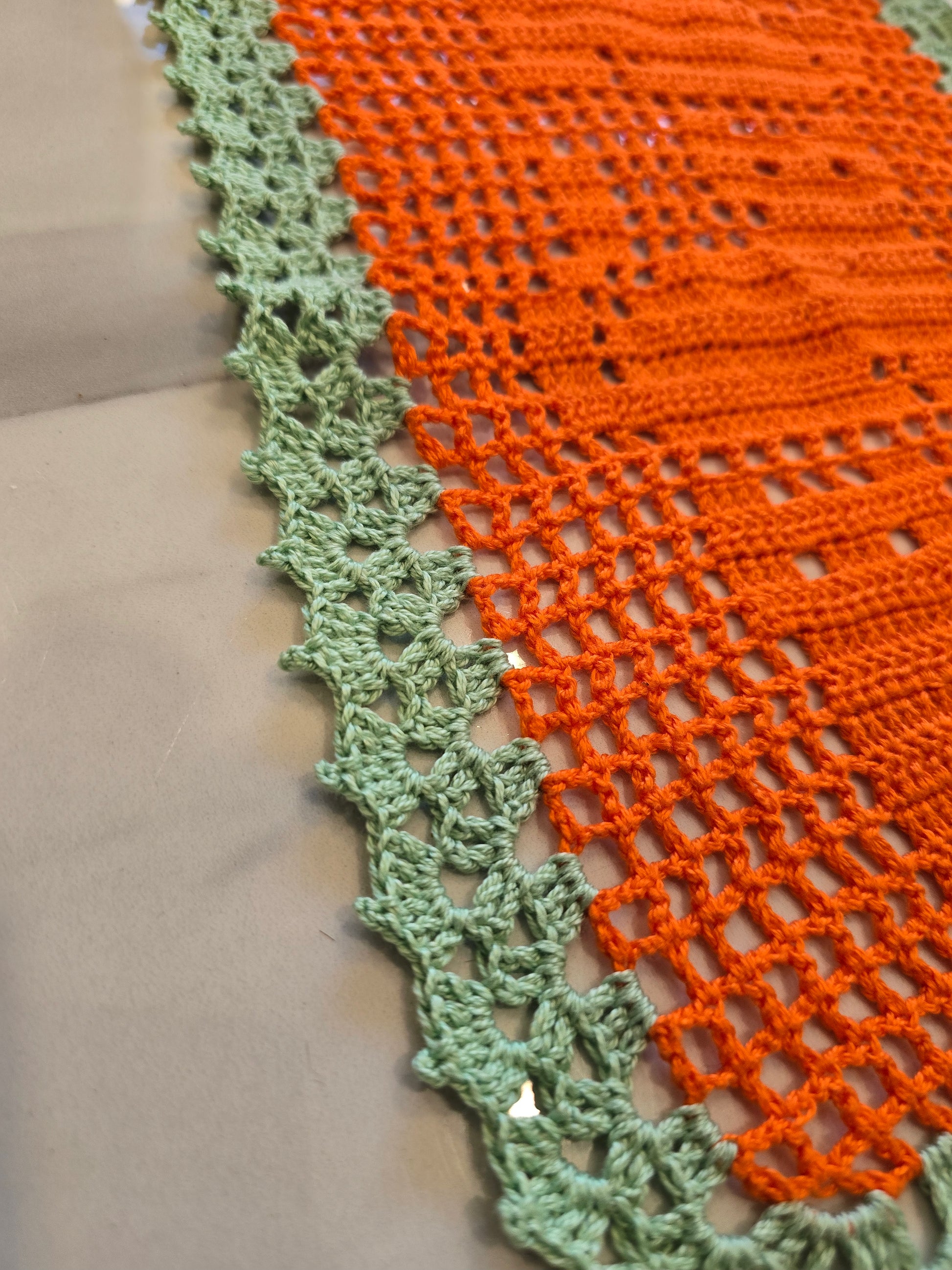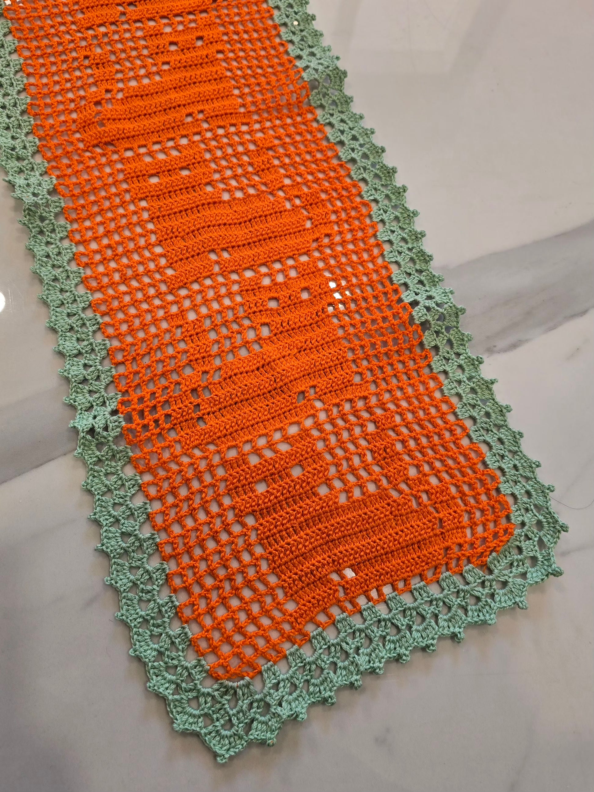 Ce magnifique chemin de table au croche, entièrement fait main, se distingue par ses motifs chats tout en délicatesse. Ses couleurs orange et vert pastel s'accordent parfaitement pour une décoration chaleureuse et joyeuse.