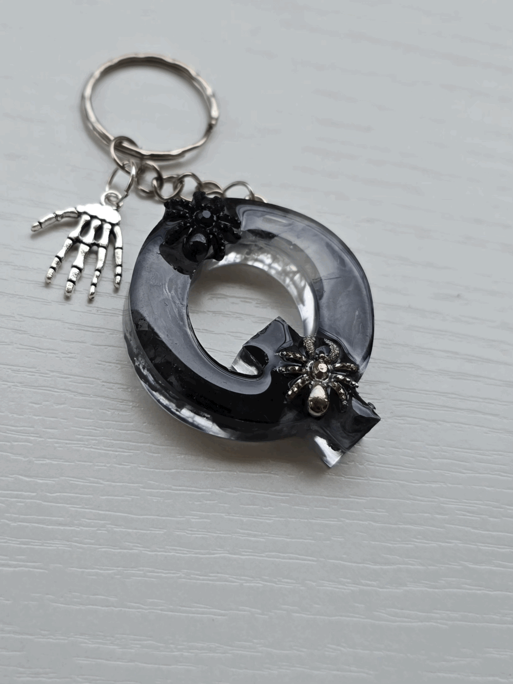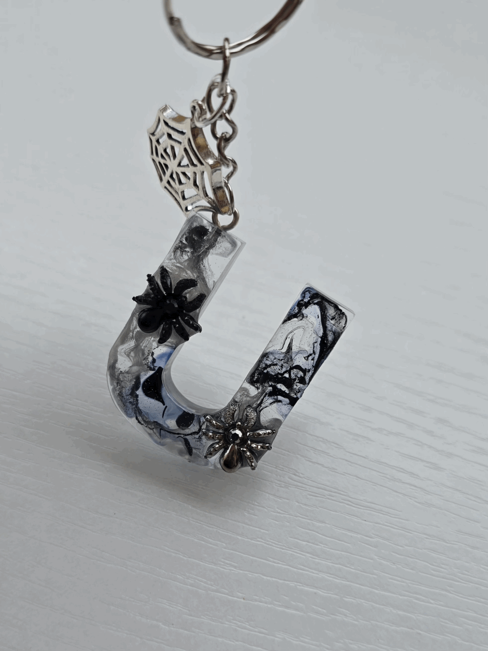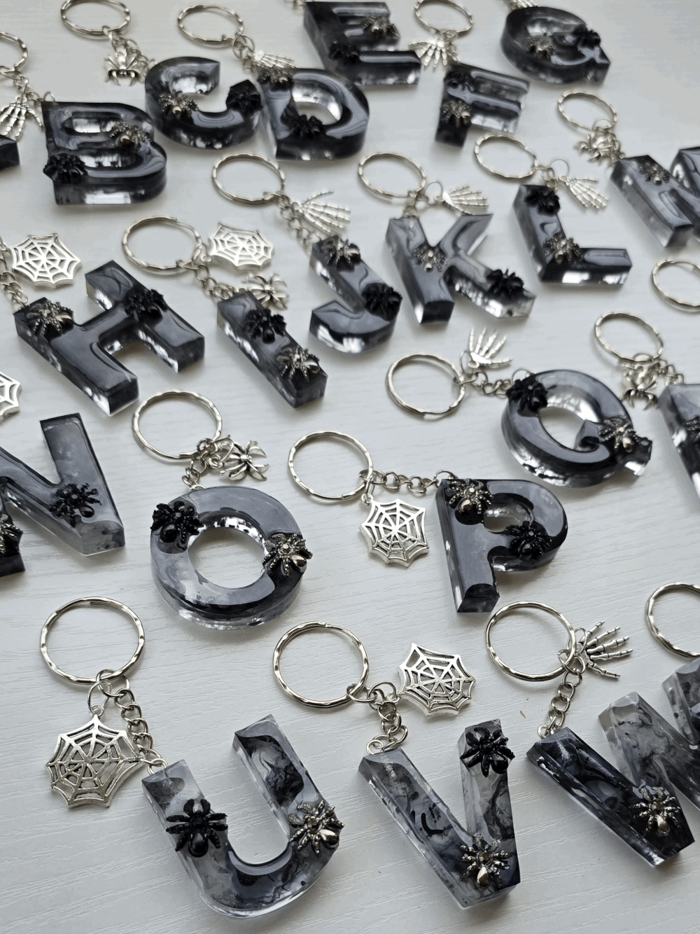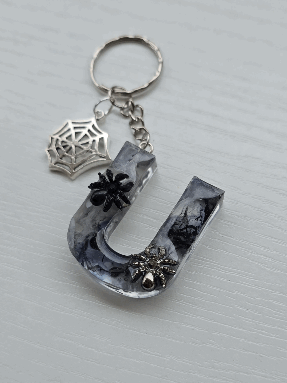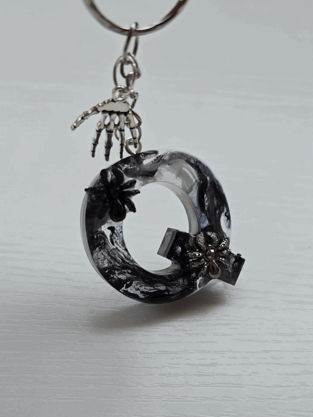 Chaque pièce unique présente un élégant effet fumé à l'intérieur, créant un mystérieux nuage qui semble emprisonné dans la résine. Pour un look encore plus captivant, de petites décorations en forme d'araignée sont délicatement posées sur la surface, ajoutant une touche sinistre et effrayante. Les porte-clés sont également ornés de breloques assorties, ajoutant une finition charmante et thématique.