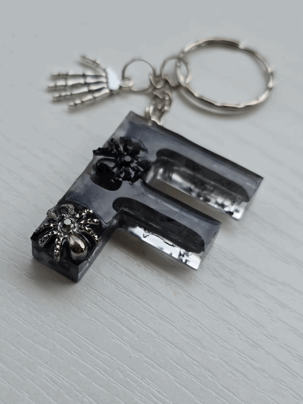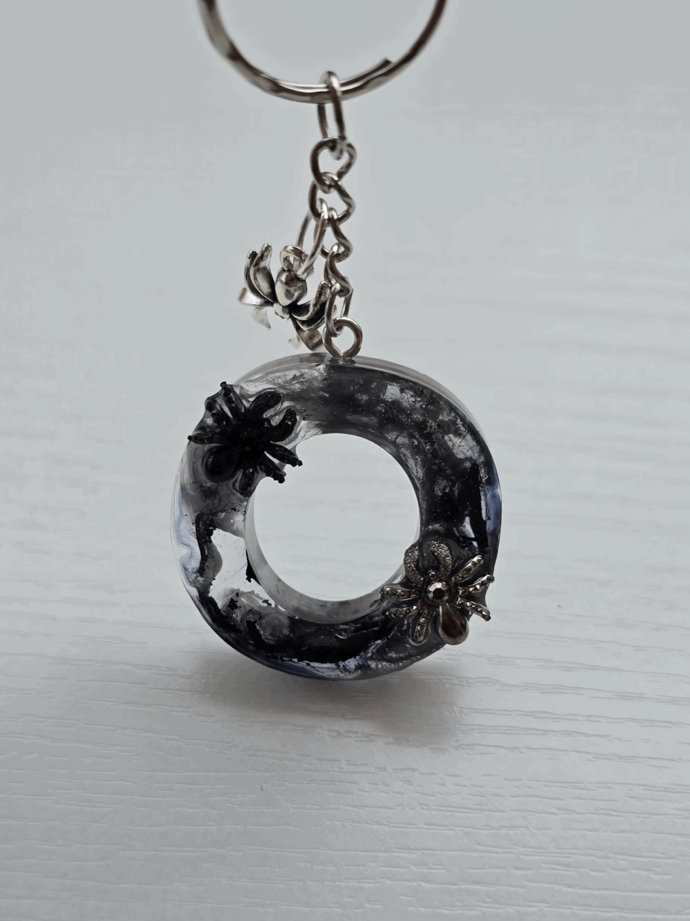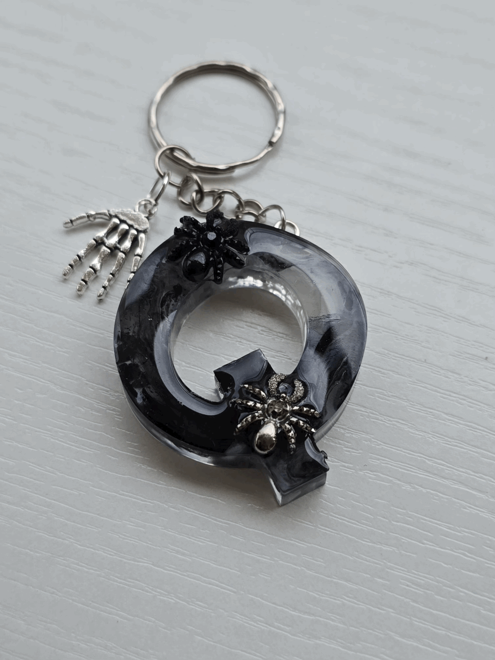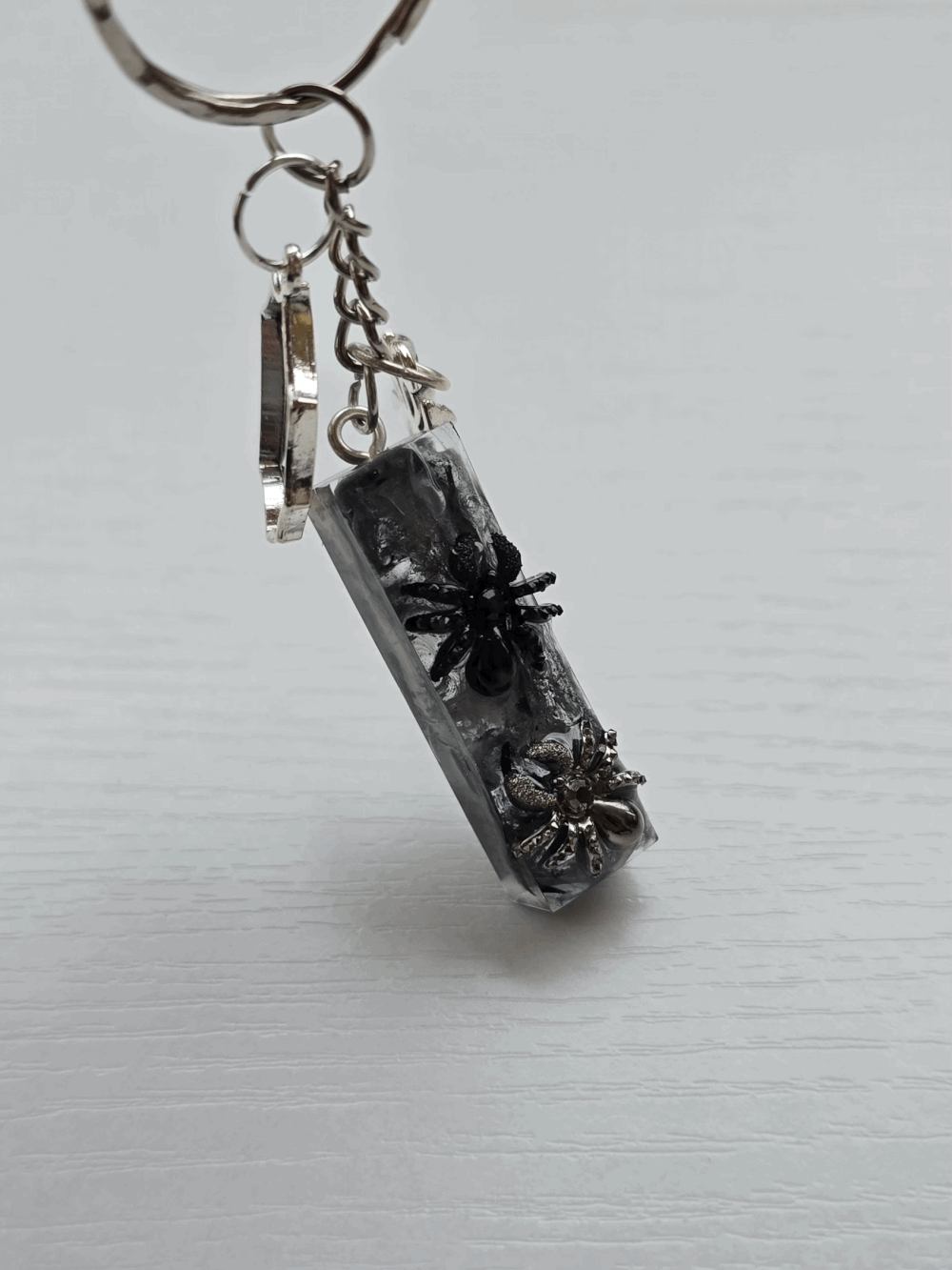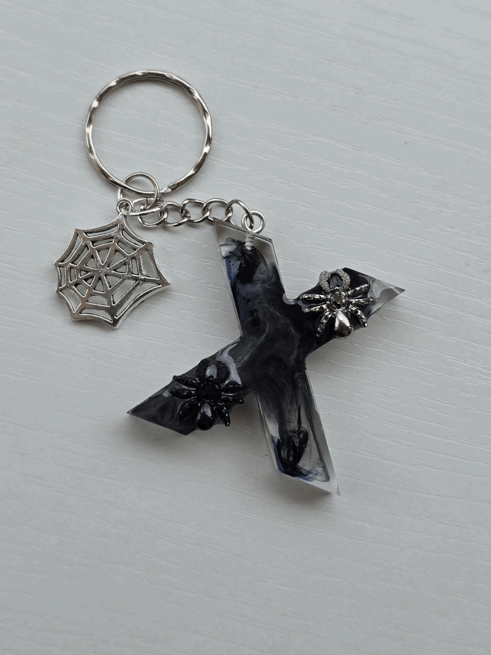 Chaque pièce unique présente un élégant effet fumé à l'intérieur, créant un mystérieux nuage qui semble emprisonné dans la résine. Pour un look encore plus captivant, de petites décorations en forme d'araignée sont délicatement posées sur la surface, ajoutant une touche sinistre et effrayante. Les porte-clés sont également ornés de breloques assorties, ajoutant une finition charmante et thématique.