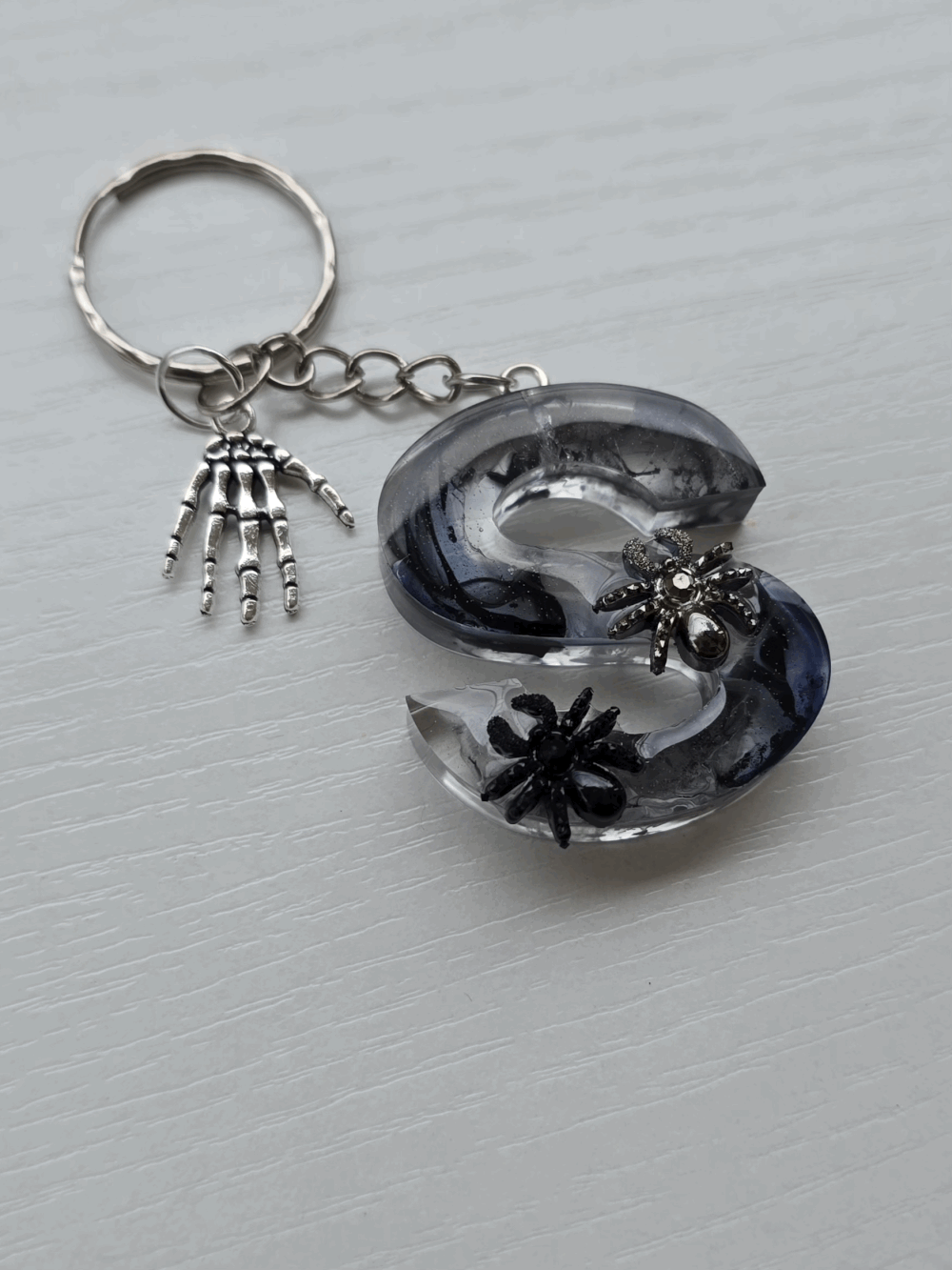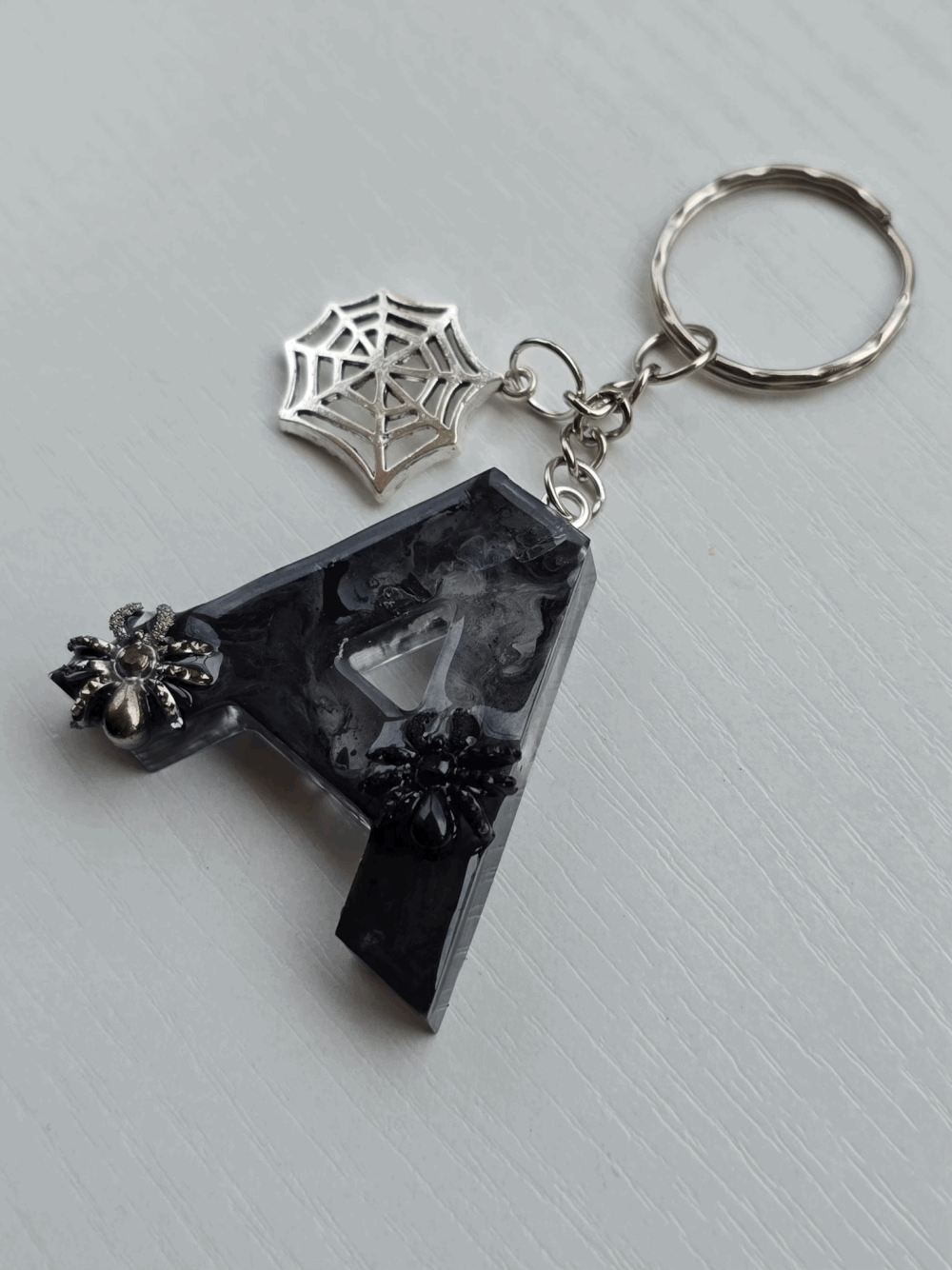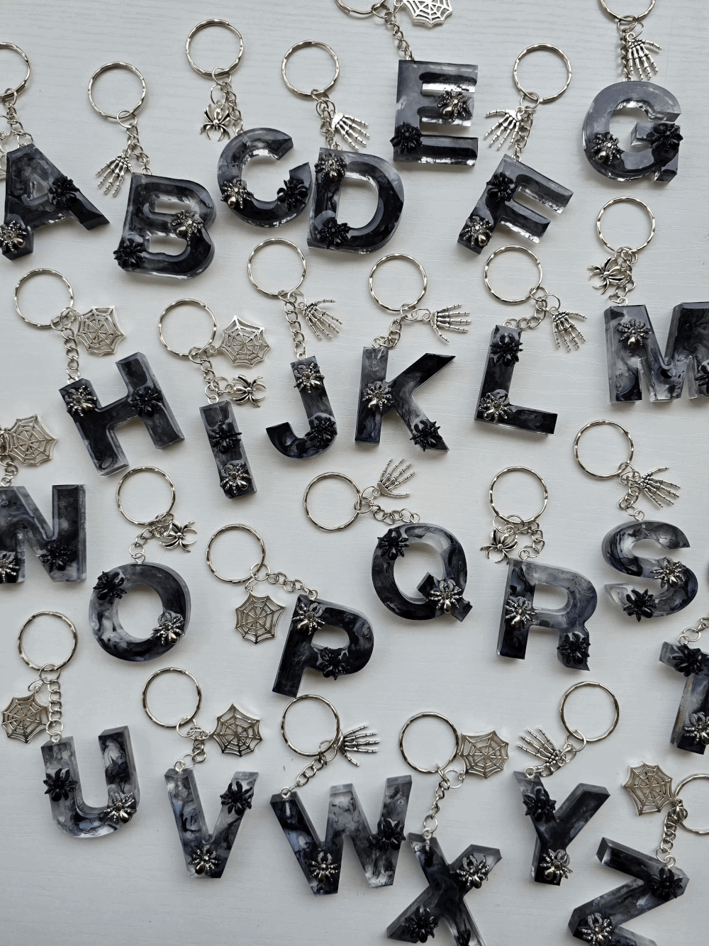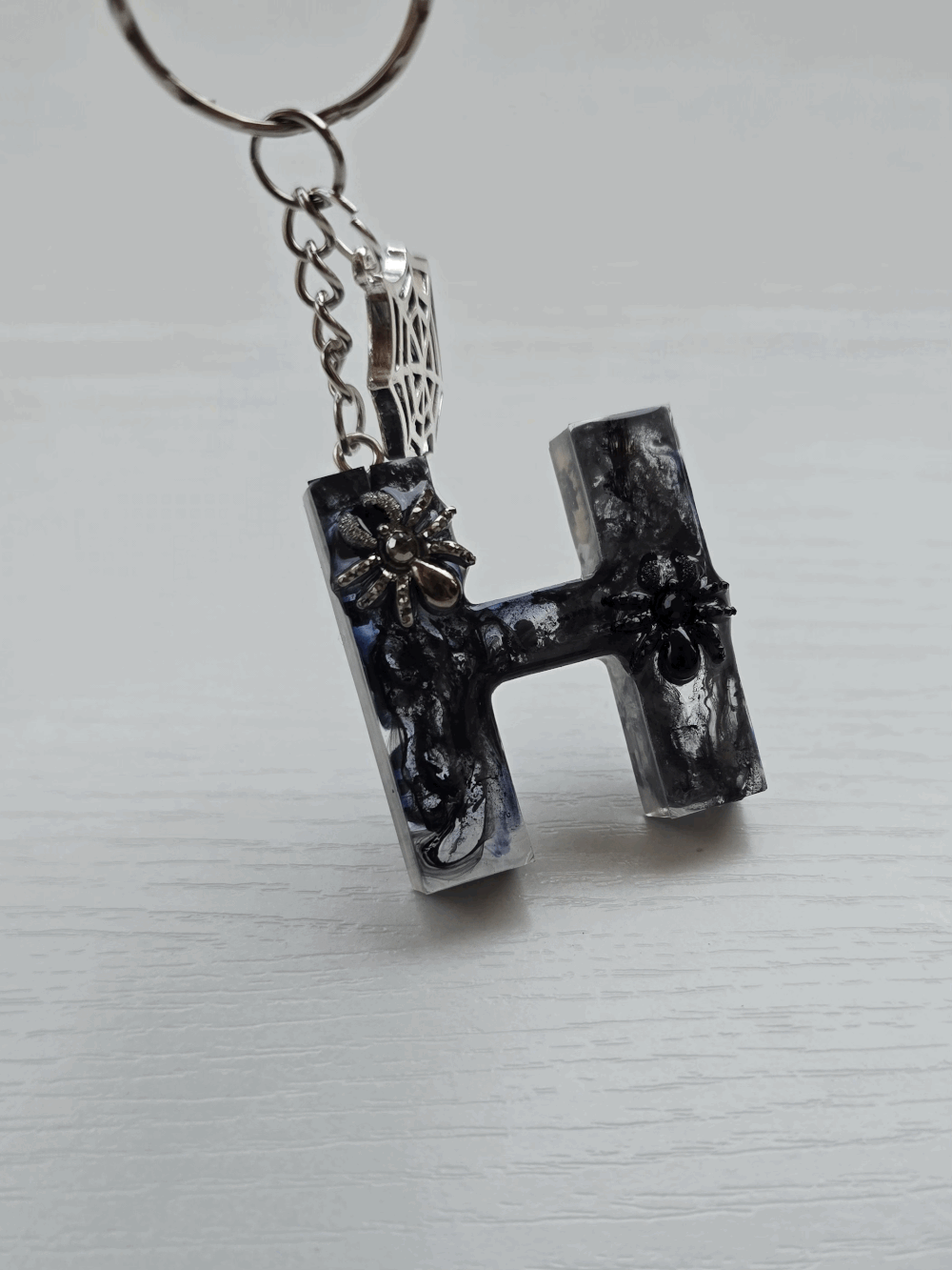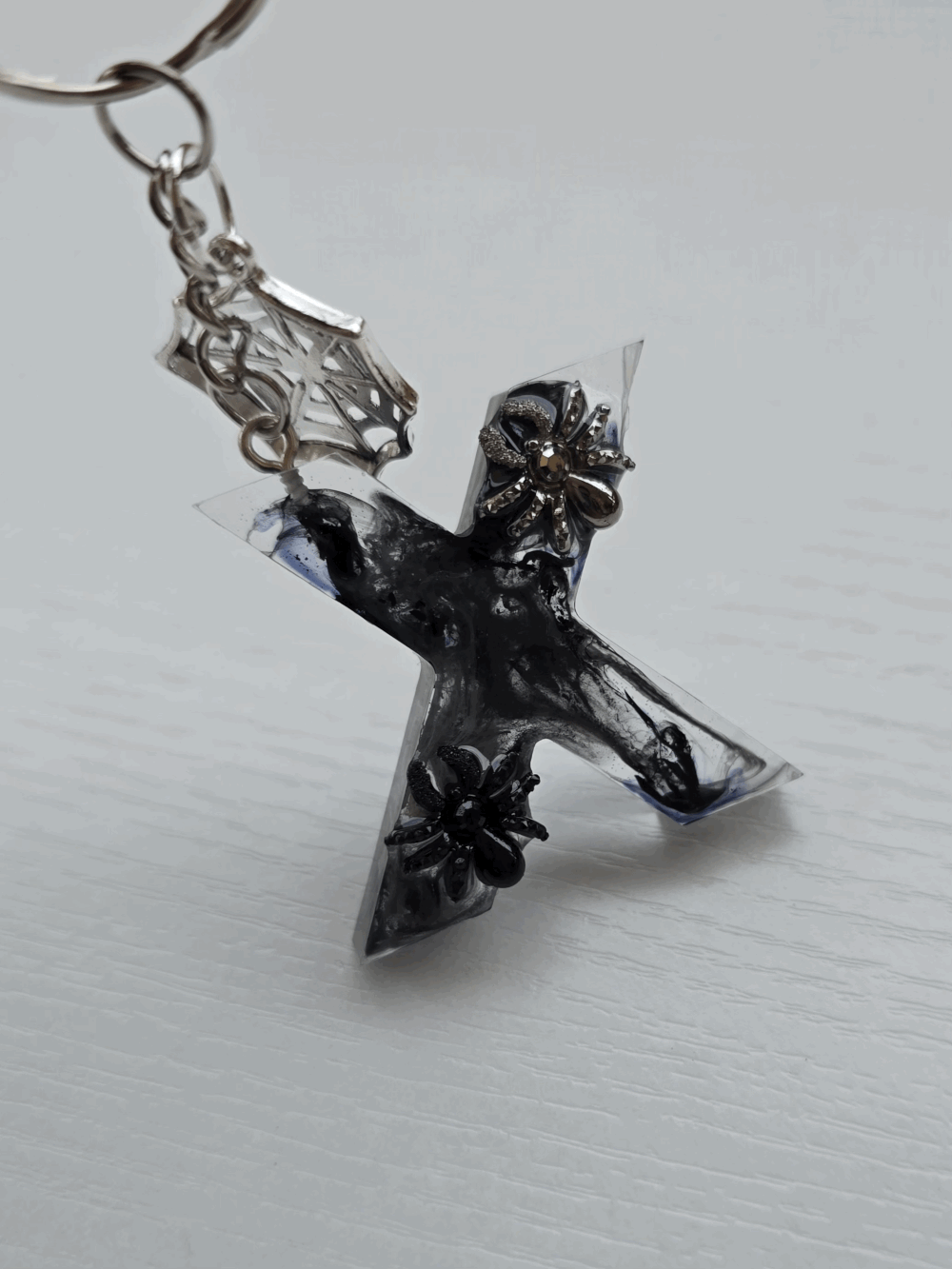 Chaque pièce unique présente un élégant effet fumé à l'intérieur, créant un mystérieux nuage qui semble emprisonné dans la résine. Pour un look encore plus captivant, de petites décorations en forme d'araignée sont délicatement posées sur la surface, ajoutant une touche sinistre et effrayante. Les porte-clés sont également ornés de breloques assorties, ajoutant une finition charmante et thématique.