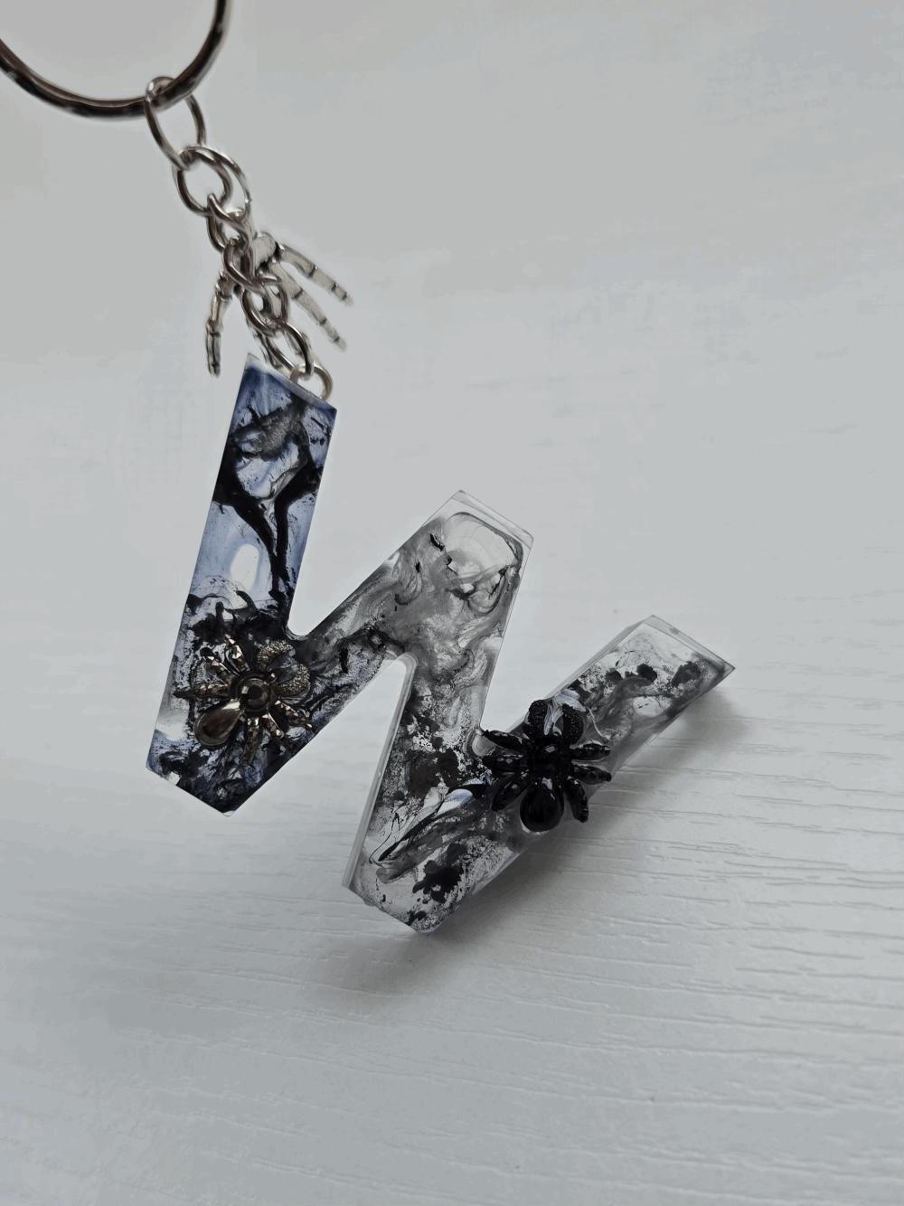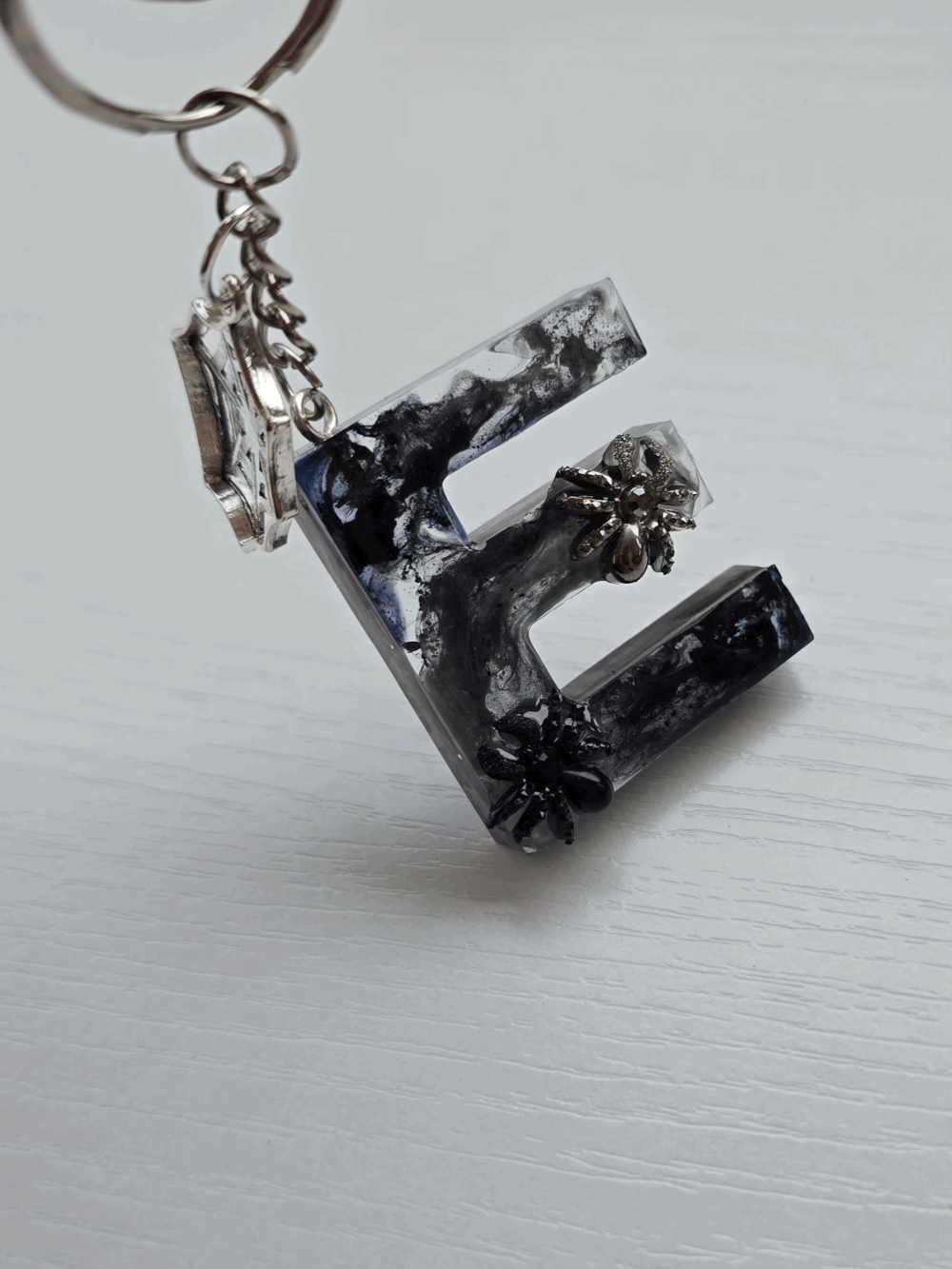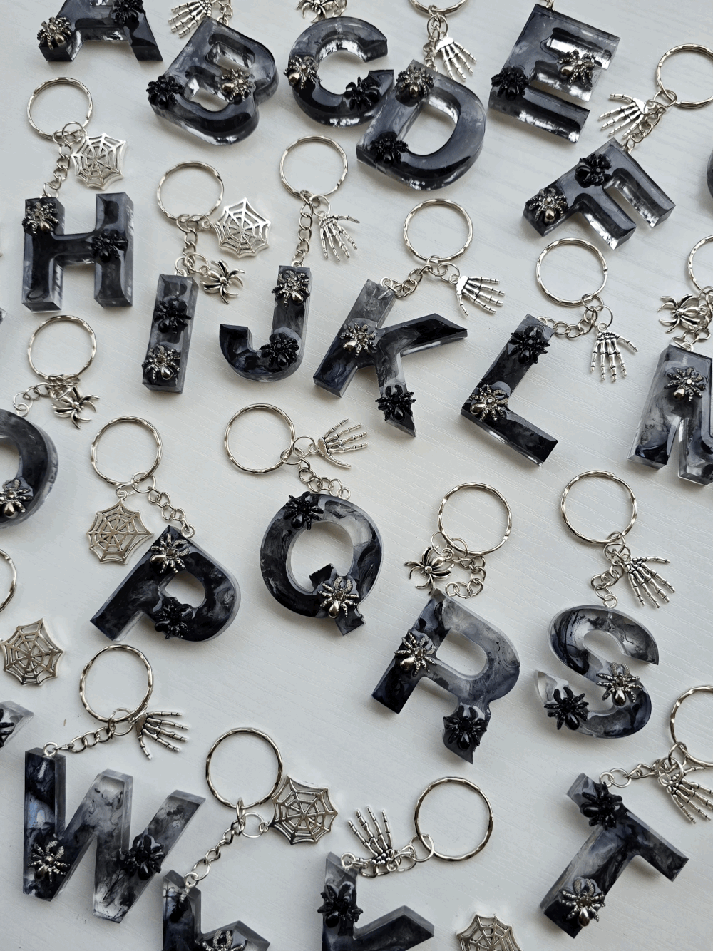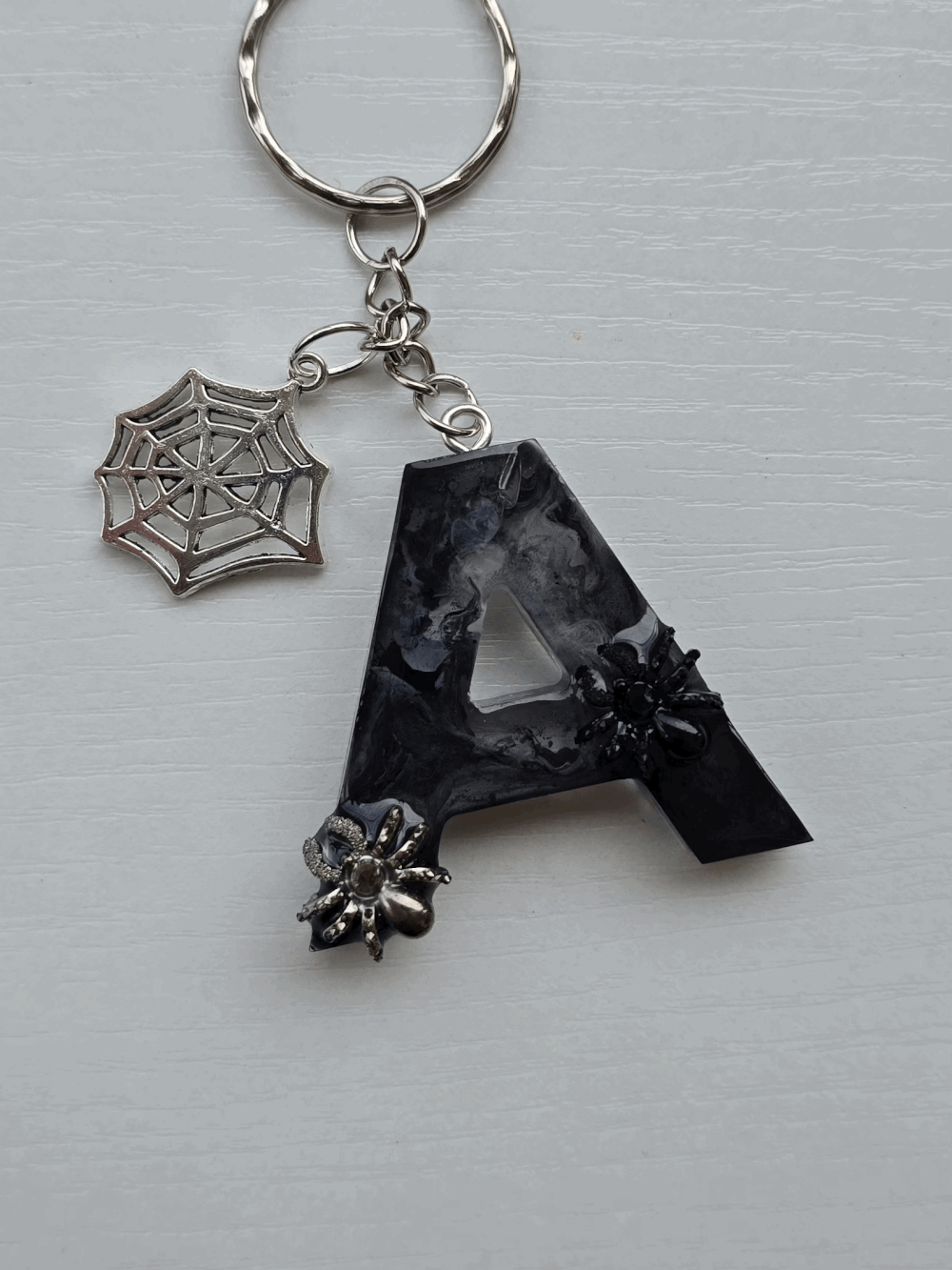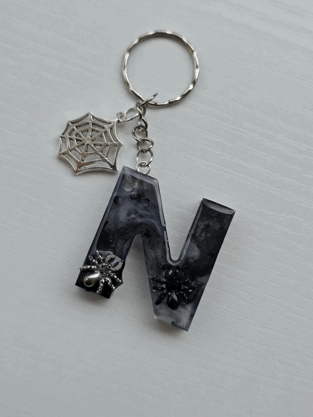 Chaque pièce unique présente un élégant effet fumé à l'intérieur, créant un mystérieux nuage qui semble emprisonné dans la résine. Pour un look encore plus captivant, de petites décorations en forme d'araignée sont délicatement posées sur la surface, ajoutant une touche sinistre et effrayante. Les porte-clés sont également ornés de breloques assorties, ajoutant une finition charmante et thématique.