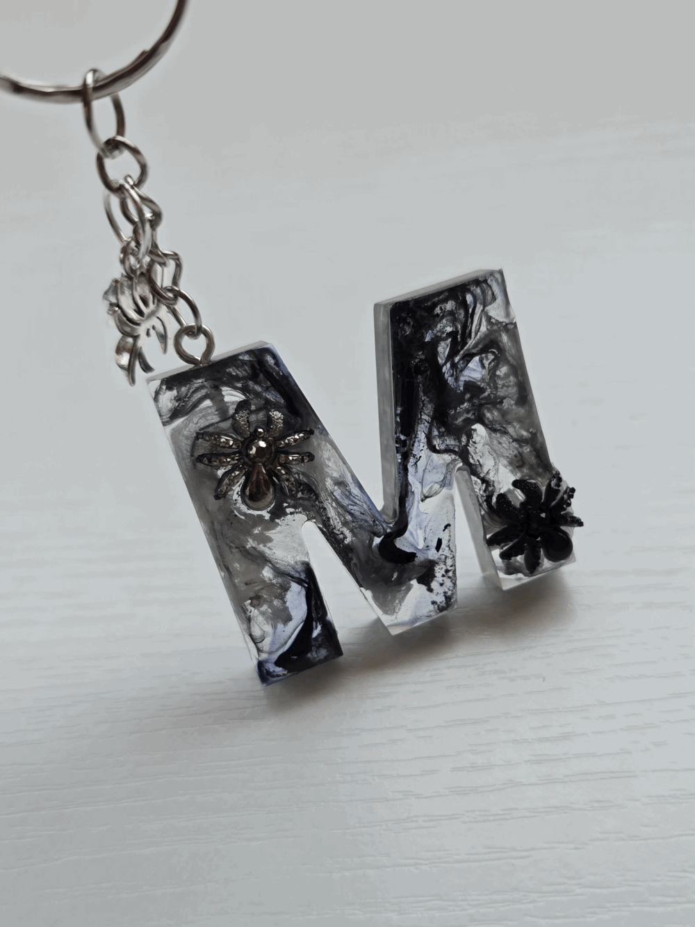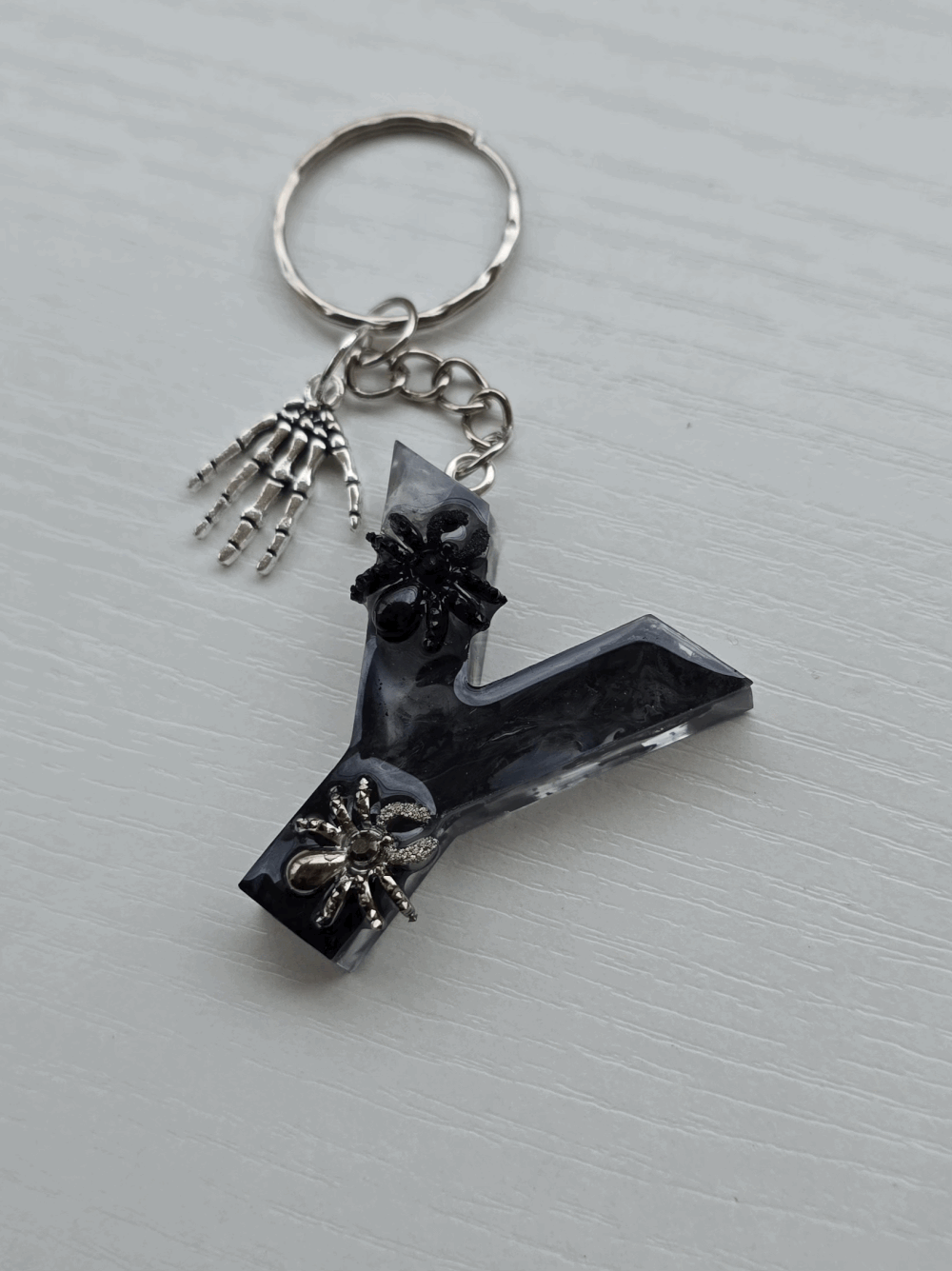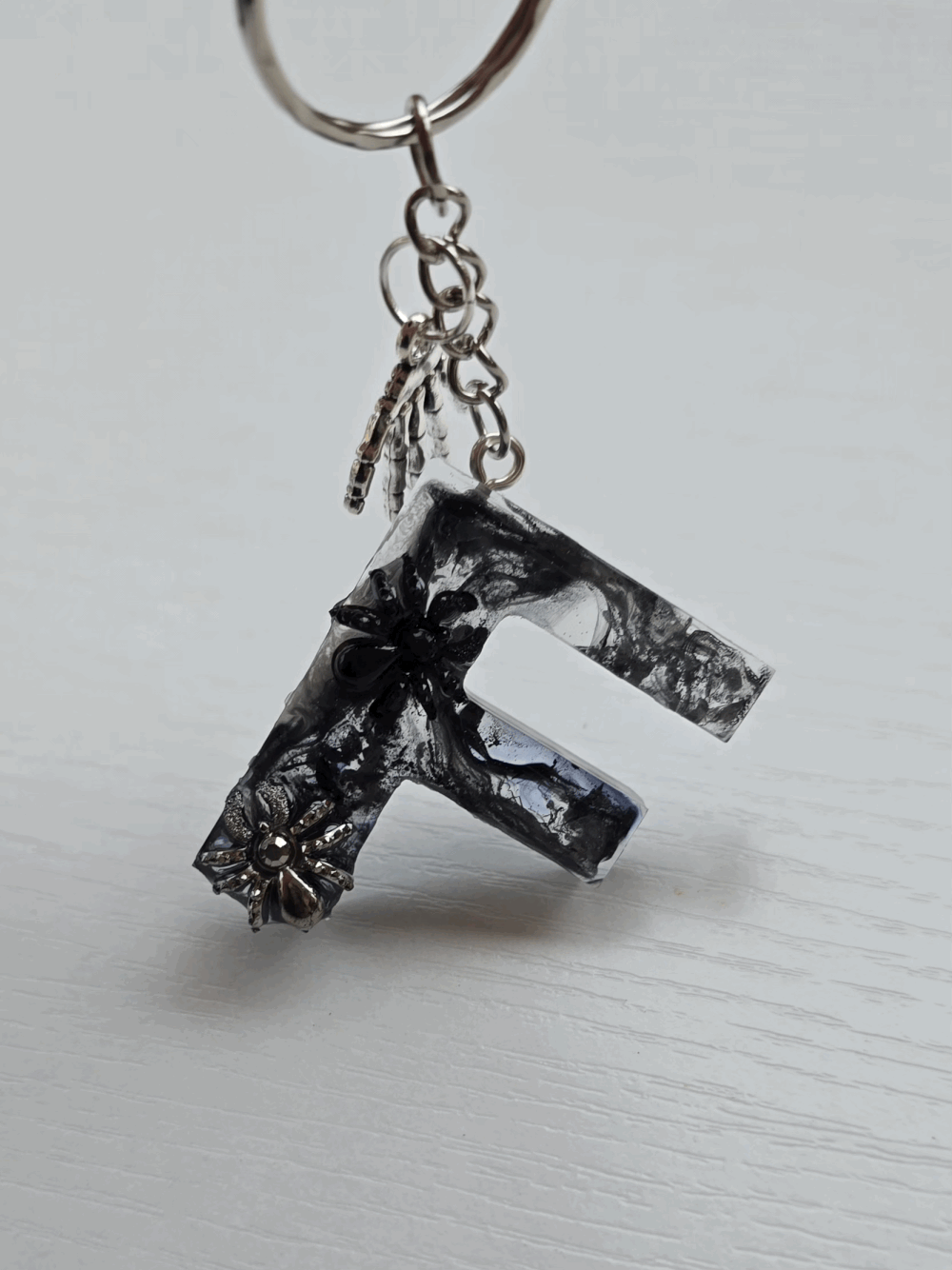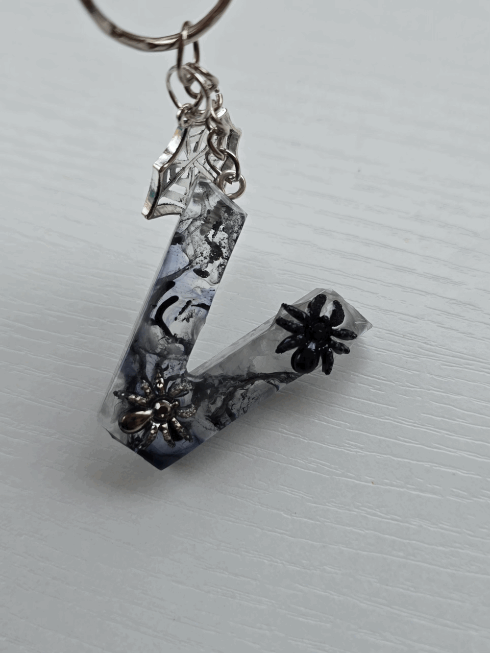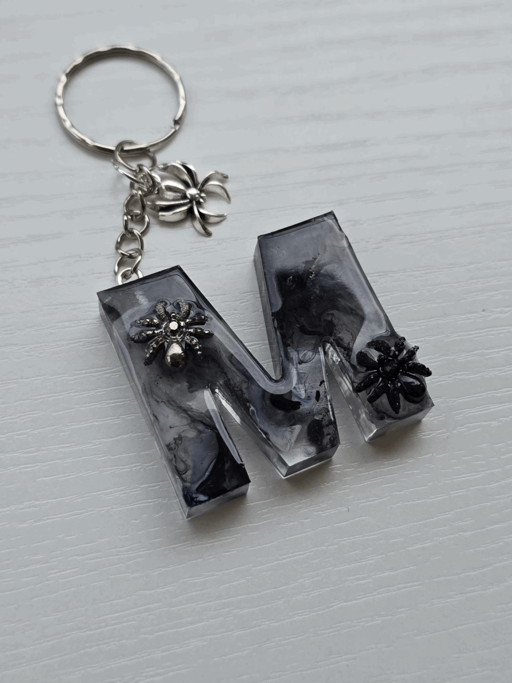 Chaque pièce unique présente un élégant effet fumé à l'intérieur, créant un mystérieux nuage qui semble emprisonné dans la résine. Pour un look encore plus captivant, de petites décorations en forme d'araignée sont délicatement posées sur la surface, ajoutant une touche sinistre et effrayante. Les porte-clés sont également ornés de breloques assorties, ajoutant une finition charmante et thématique.