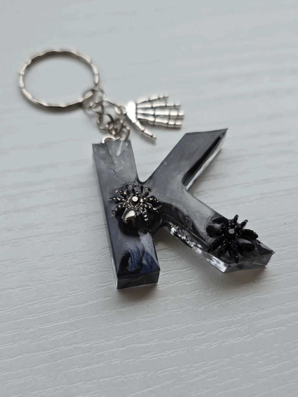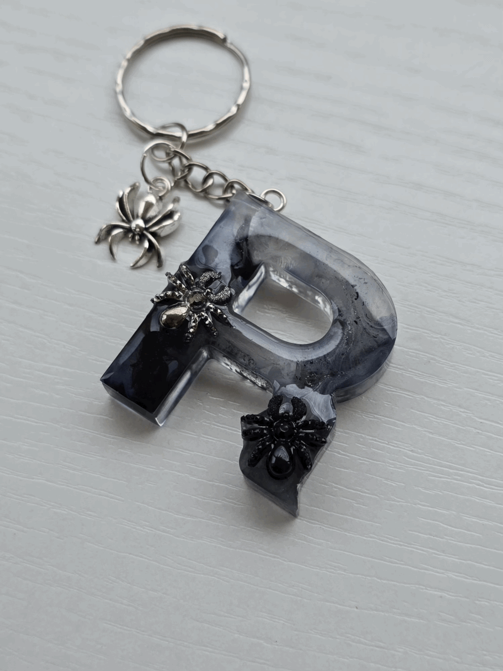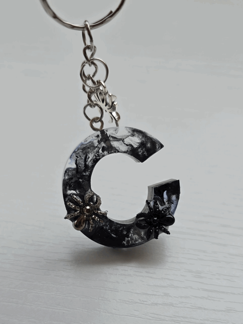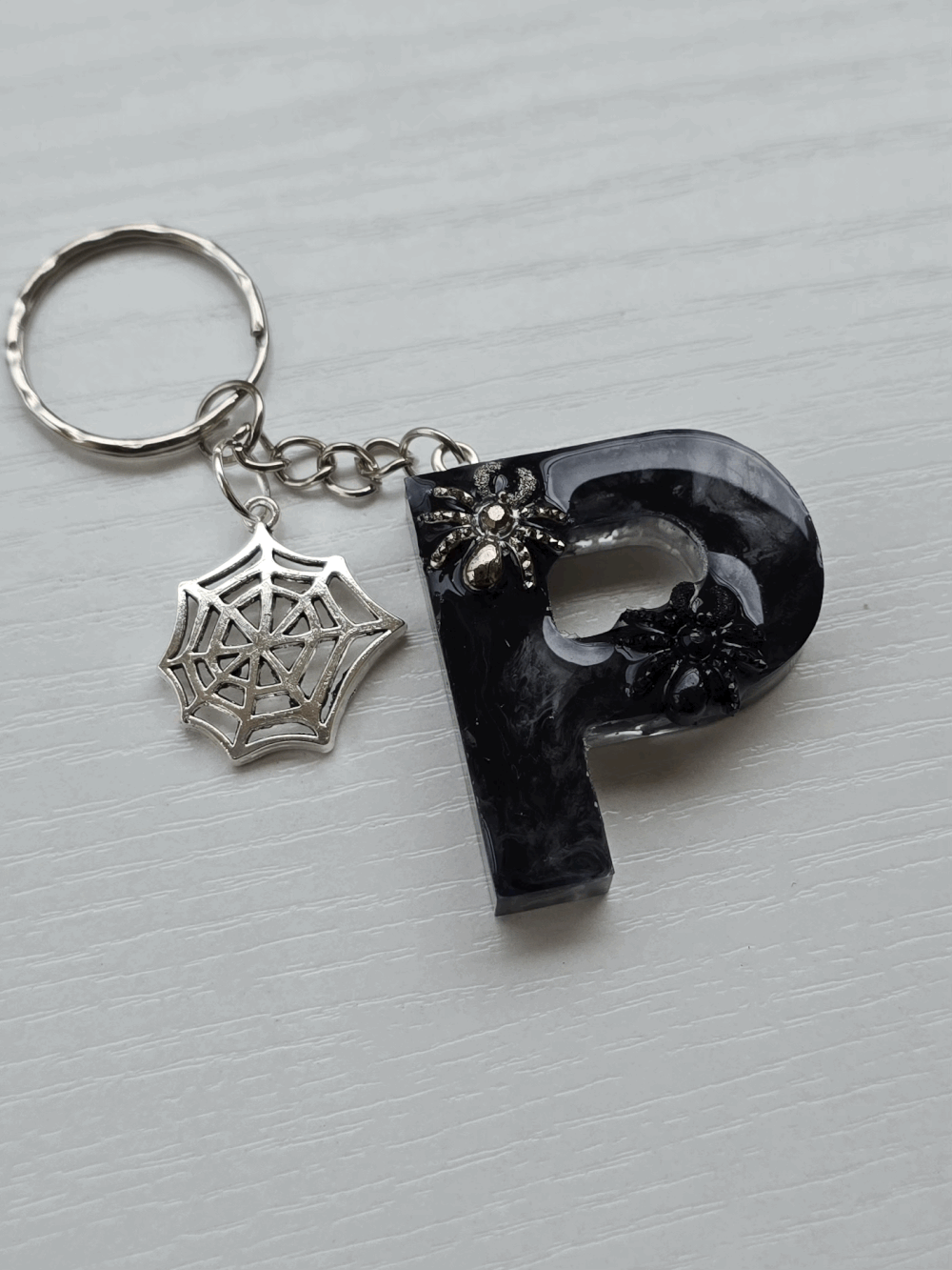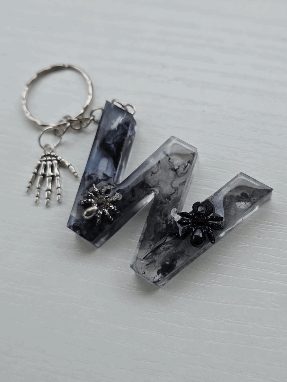 Chaque pièce unique présente un élégant effet fumé à l'intérieur, créant un mystérieux nuage qui semble emprisonné dans la résine. Pour un look encore plus captivant, de petites décorations en forme d'araignée sont délicatement posées sur la surface, ajoutant une touche sinistre et effrayante. Les porte-clés sont également ornés de breloques assorties, ajoutant une finition charmante et thématique.