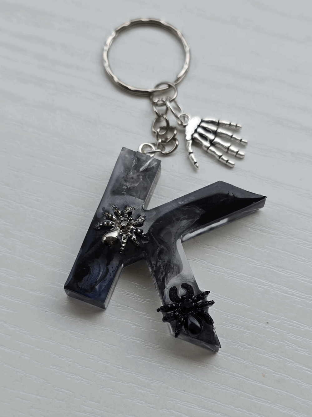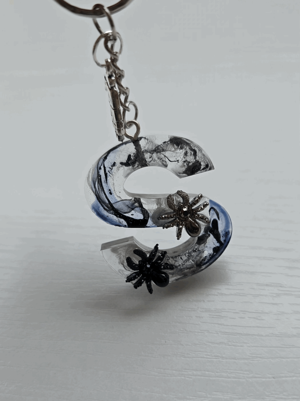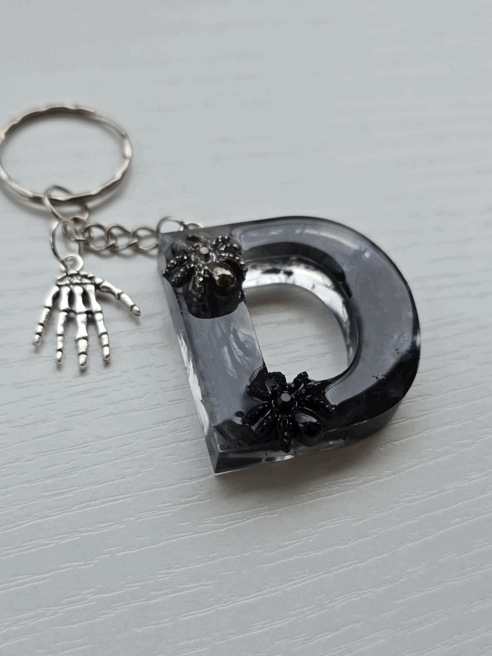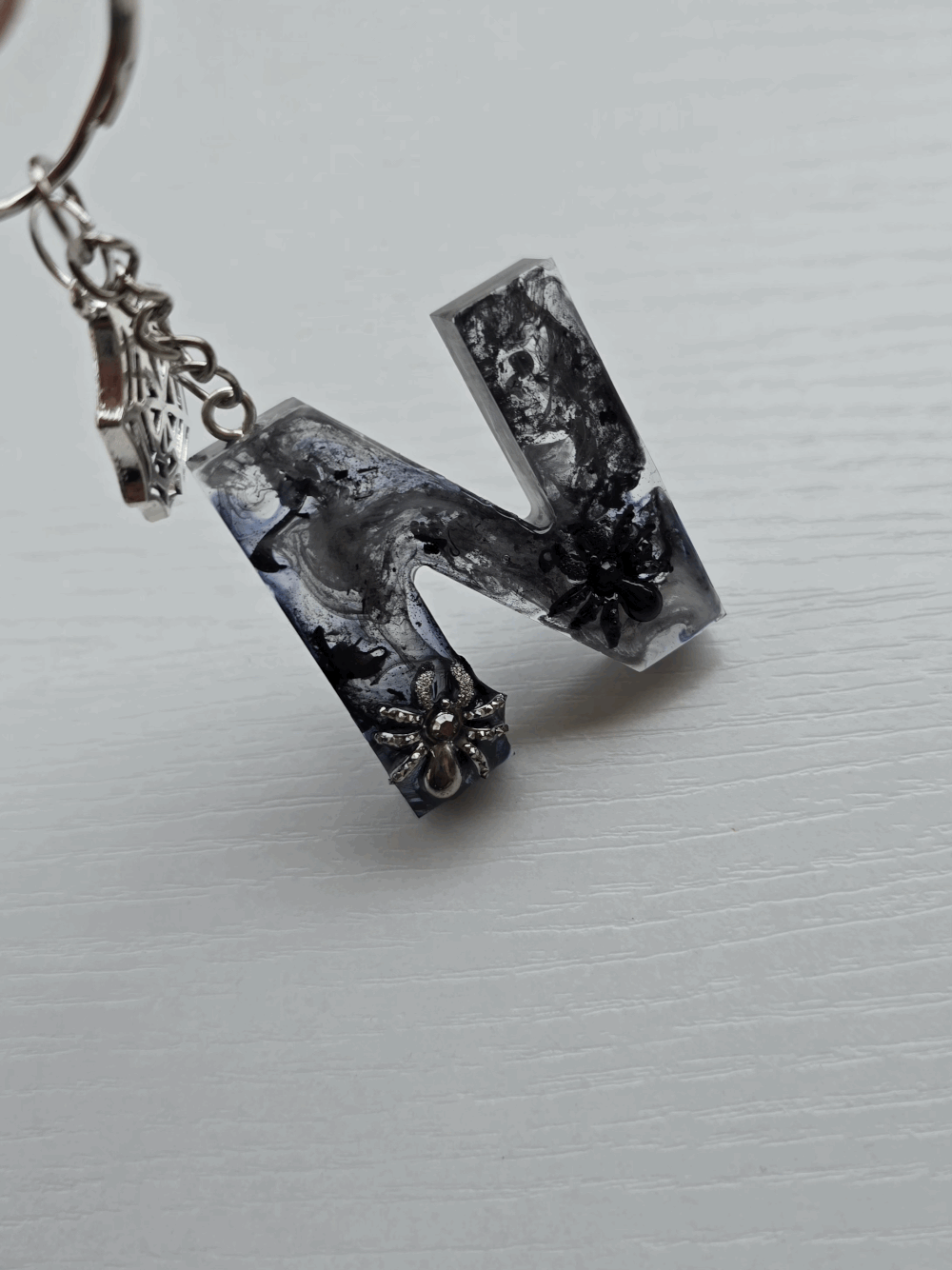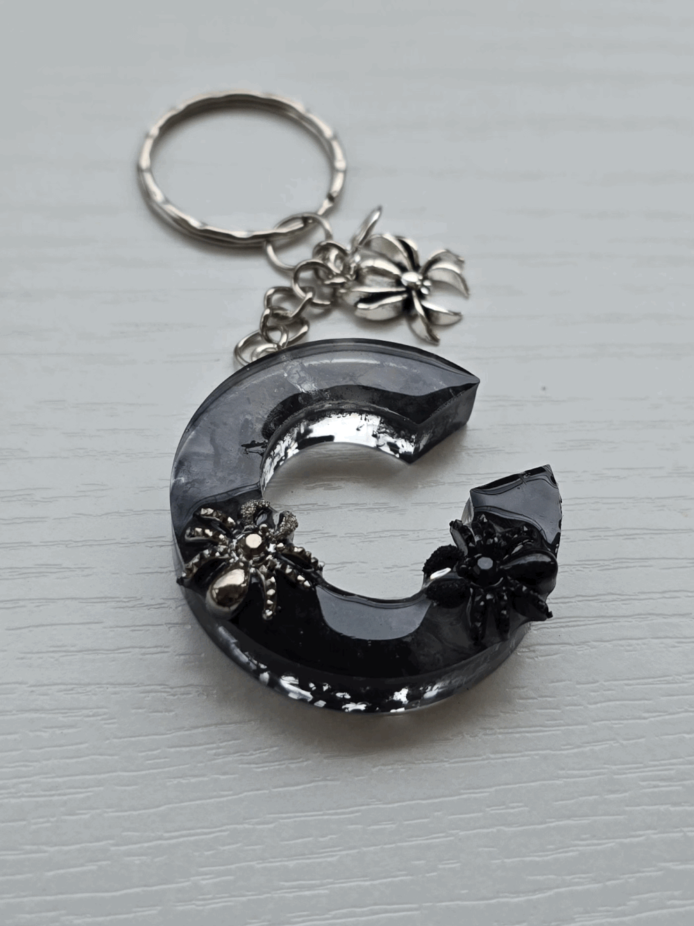 Chaque pièce unique présente un élégant effet fumé à l'intérieur, créant un mystérieux nuage qui semble emprisonné dans la résine. Pour un look encore plus captivant, de petites décorations en forme d'araignée sont délicatement posées sur la surface, ajoutant une touche sinistre et effrayante. Les porte-clés sont également ornés de breloques assorties, ajoutant une finition charmante et thématique.