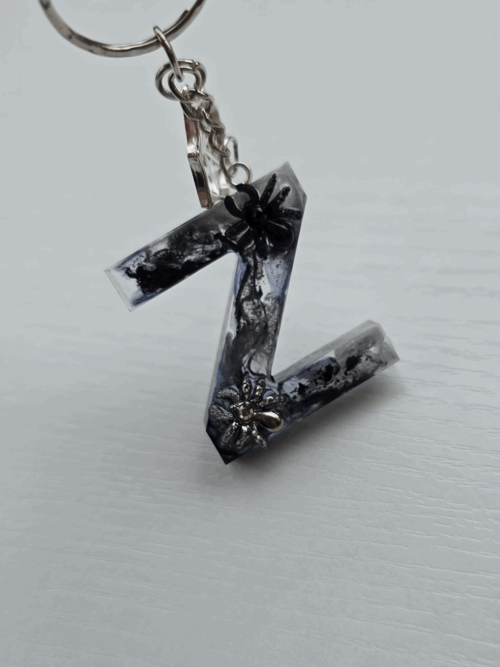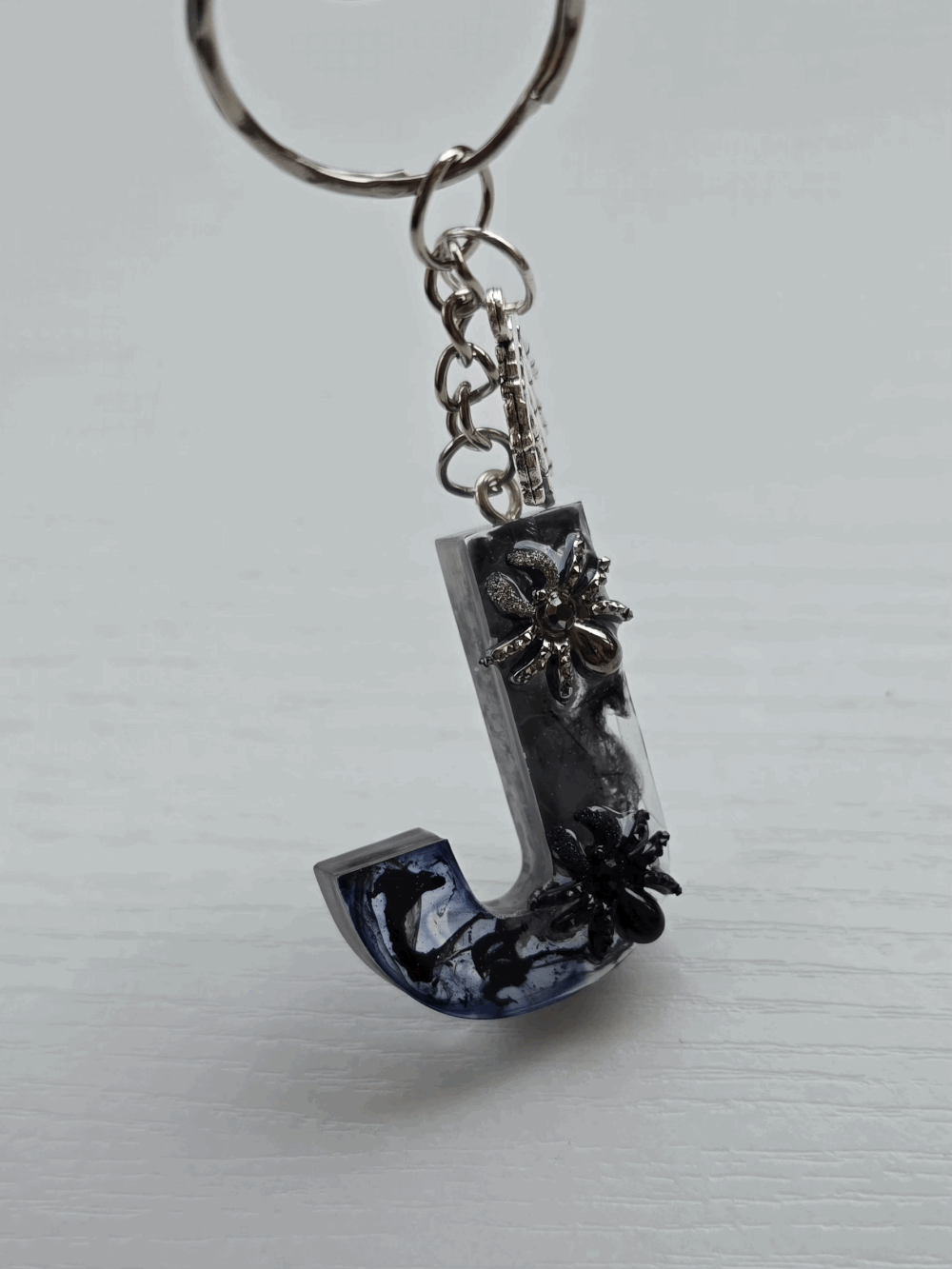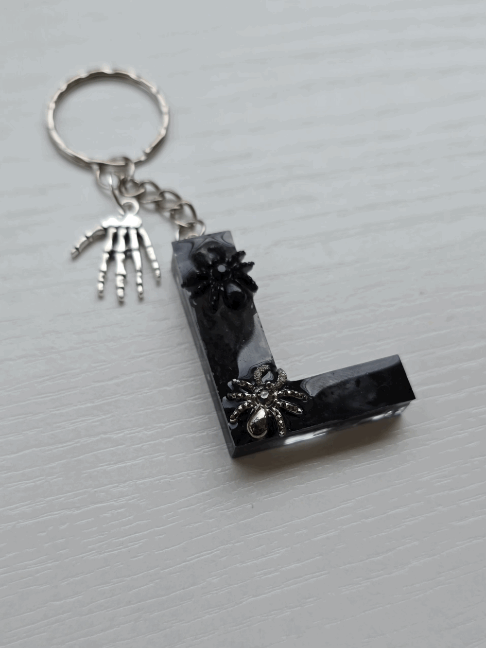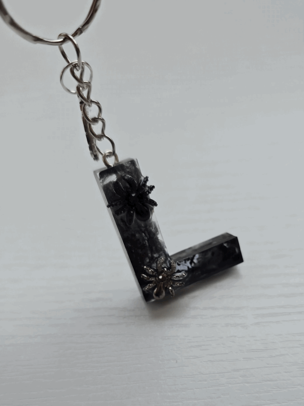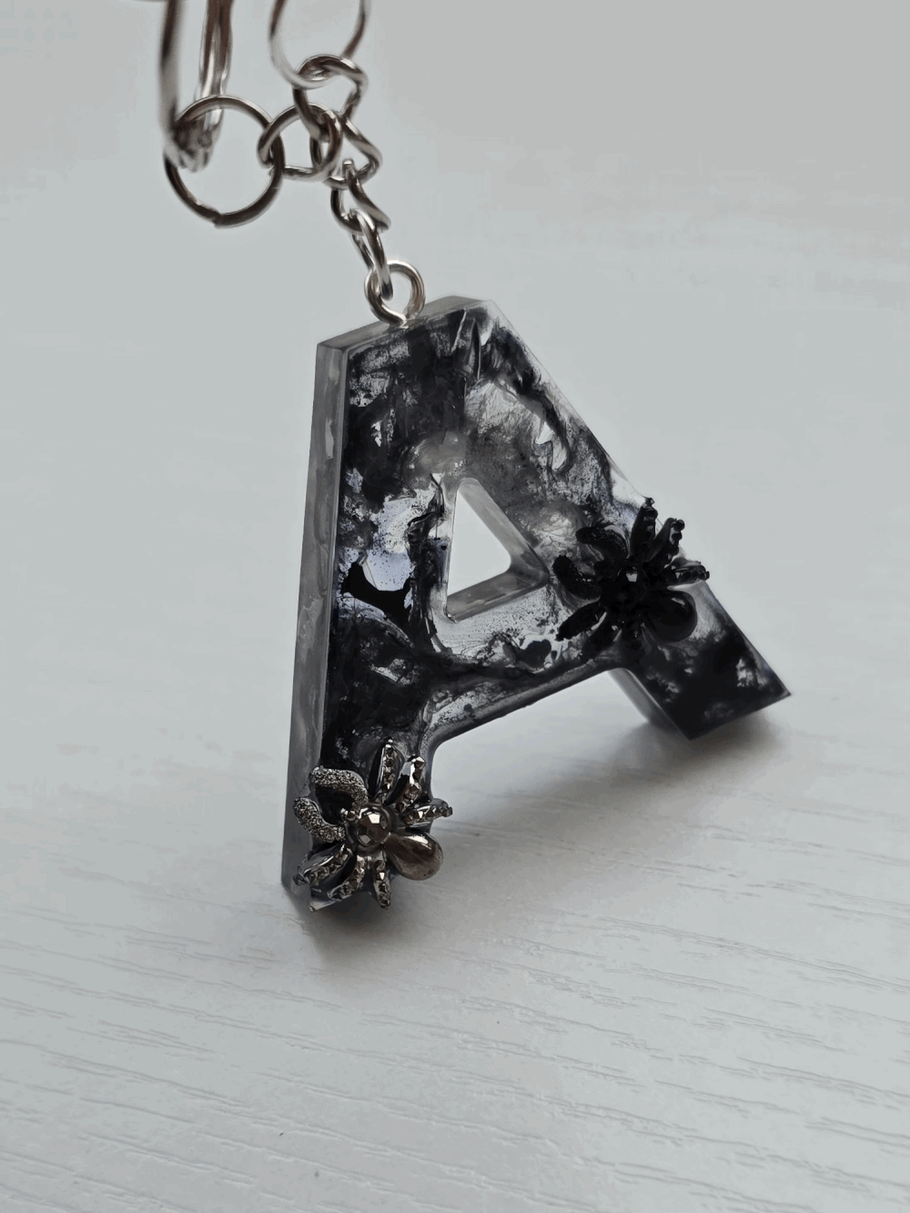 Chaque pièce unique présente un élégant effet fumé à l'intérieur, créant un mystérieux nuage qui semble emprisonné dans la résine. Pour un look encore plus captivant, de petites décorations en forme d'araignée sont délicatement posées sur la surface, ajoutant une touche sinistre et effrayante. Les porte-clés sont également ornés de breloques assorties, ajoutant une finition charmante et thématique.