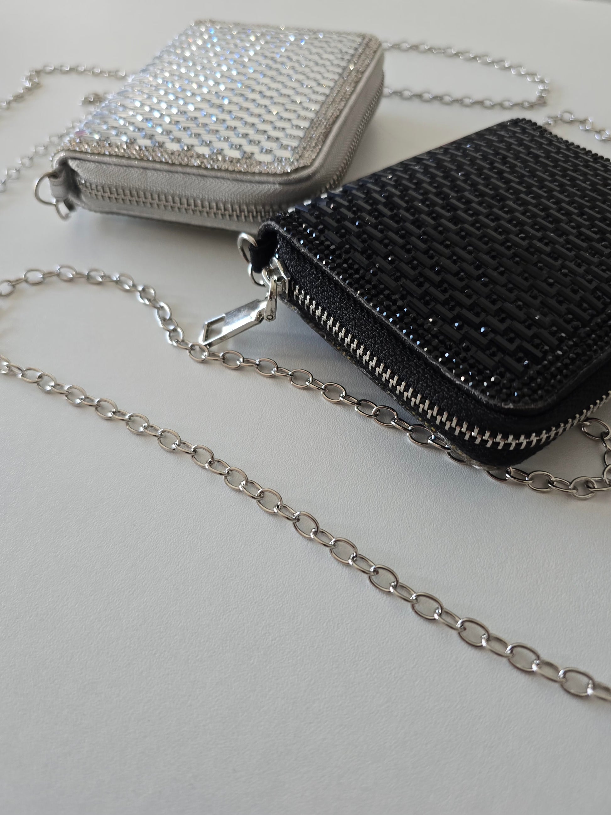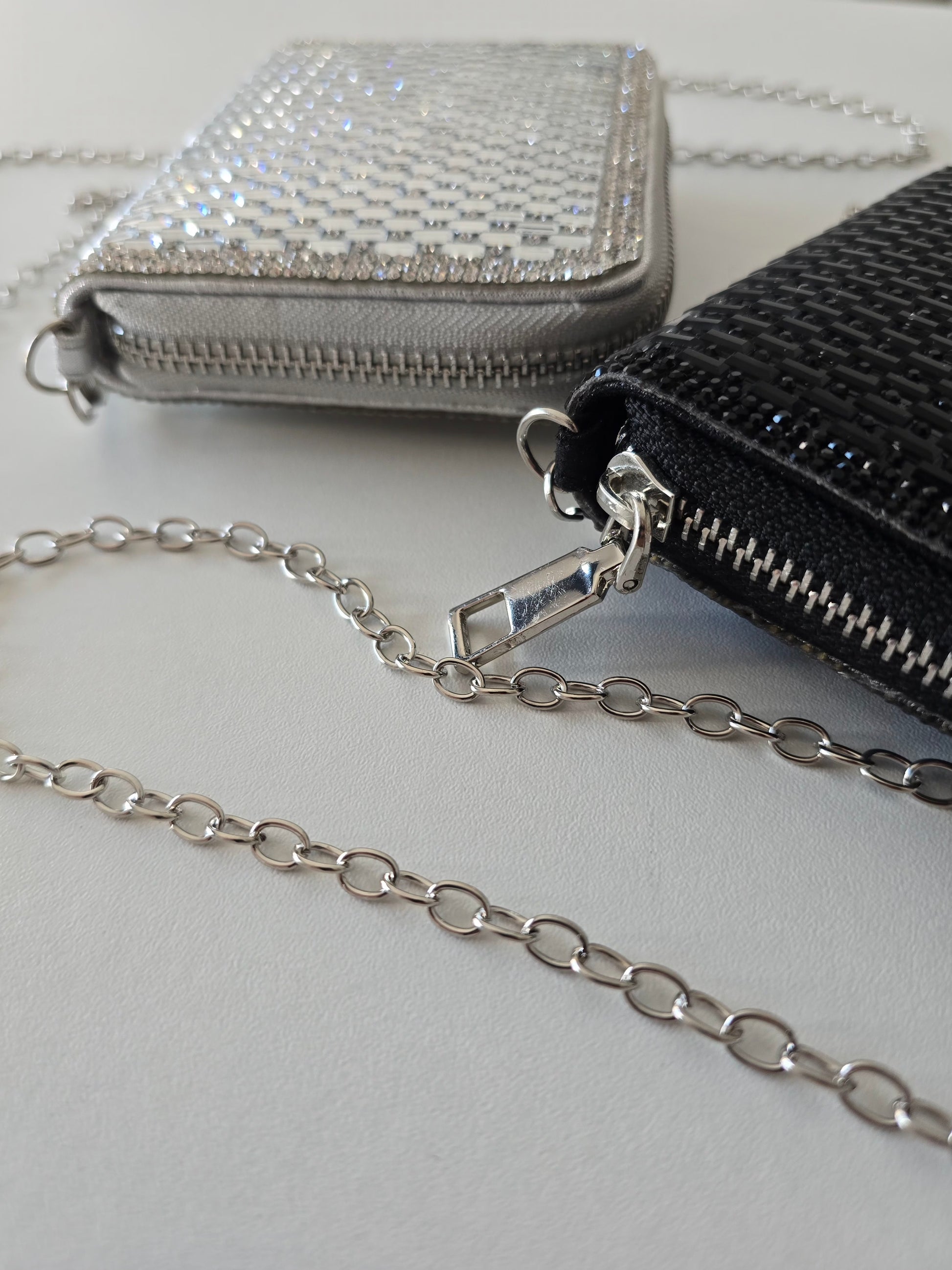 - Chaîne argentée amovible : fine et élégante, longueur 117 cm, pour le porter à l'épaule ou en bandoulière. Retirez-la en un geste si vous préférez l'utiliser en mini pochette.