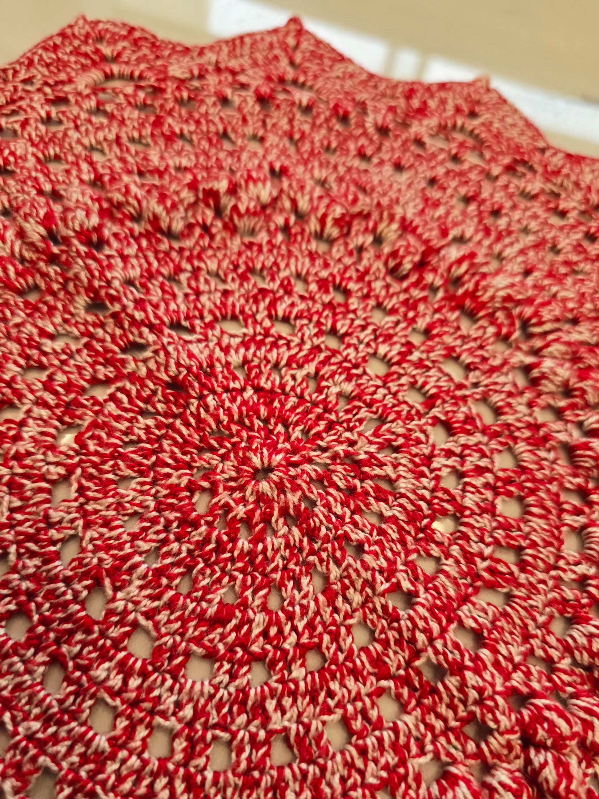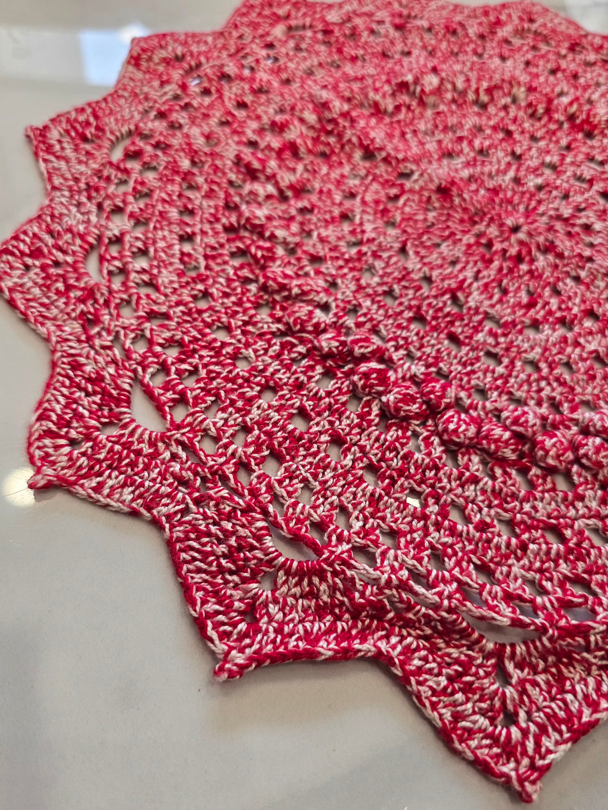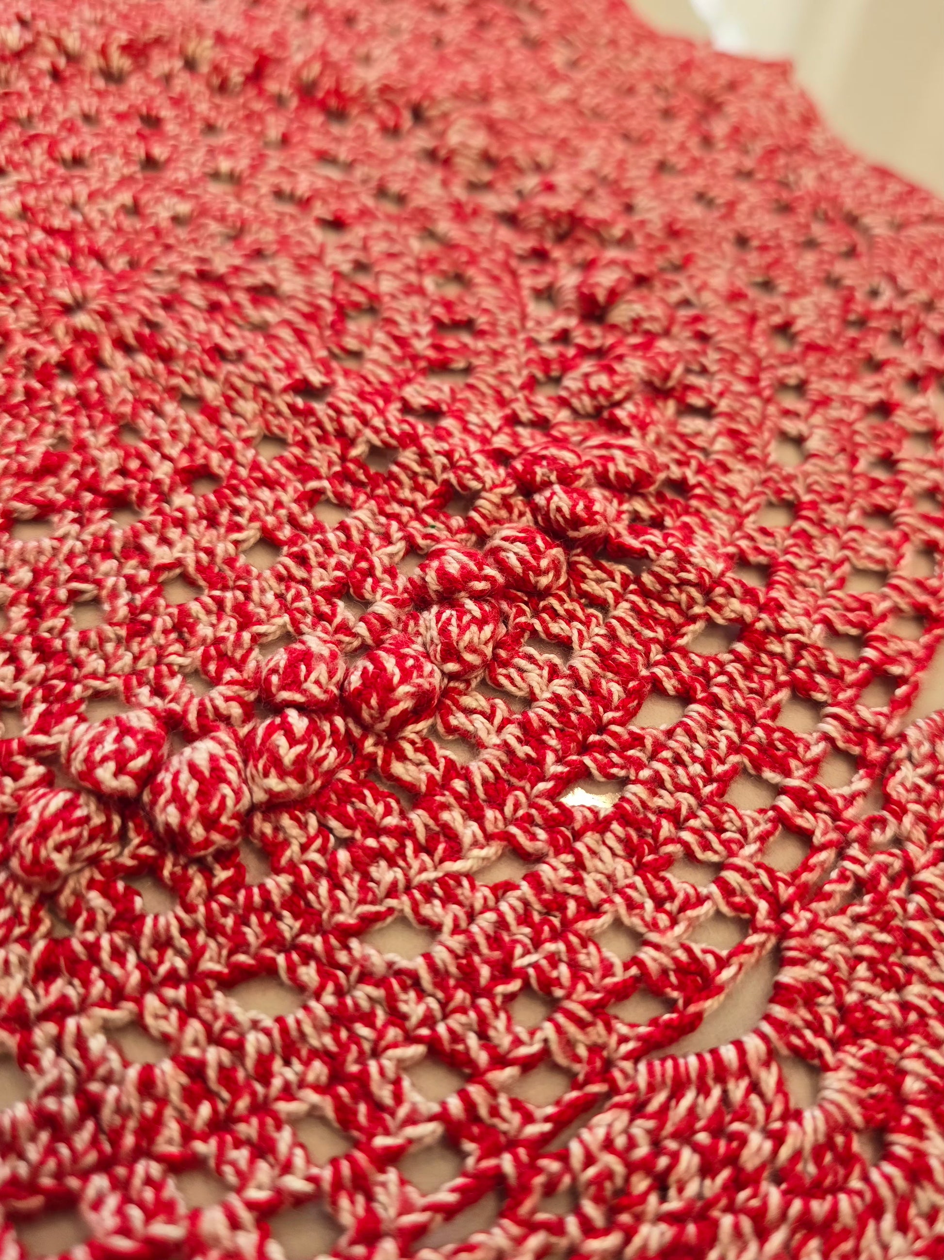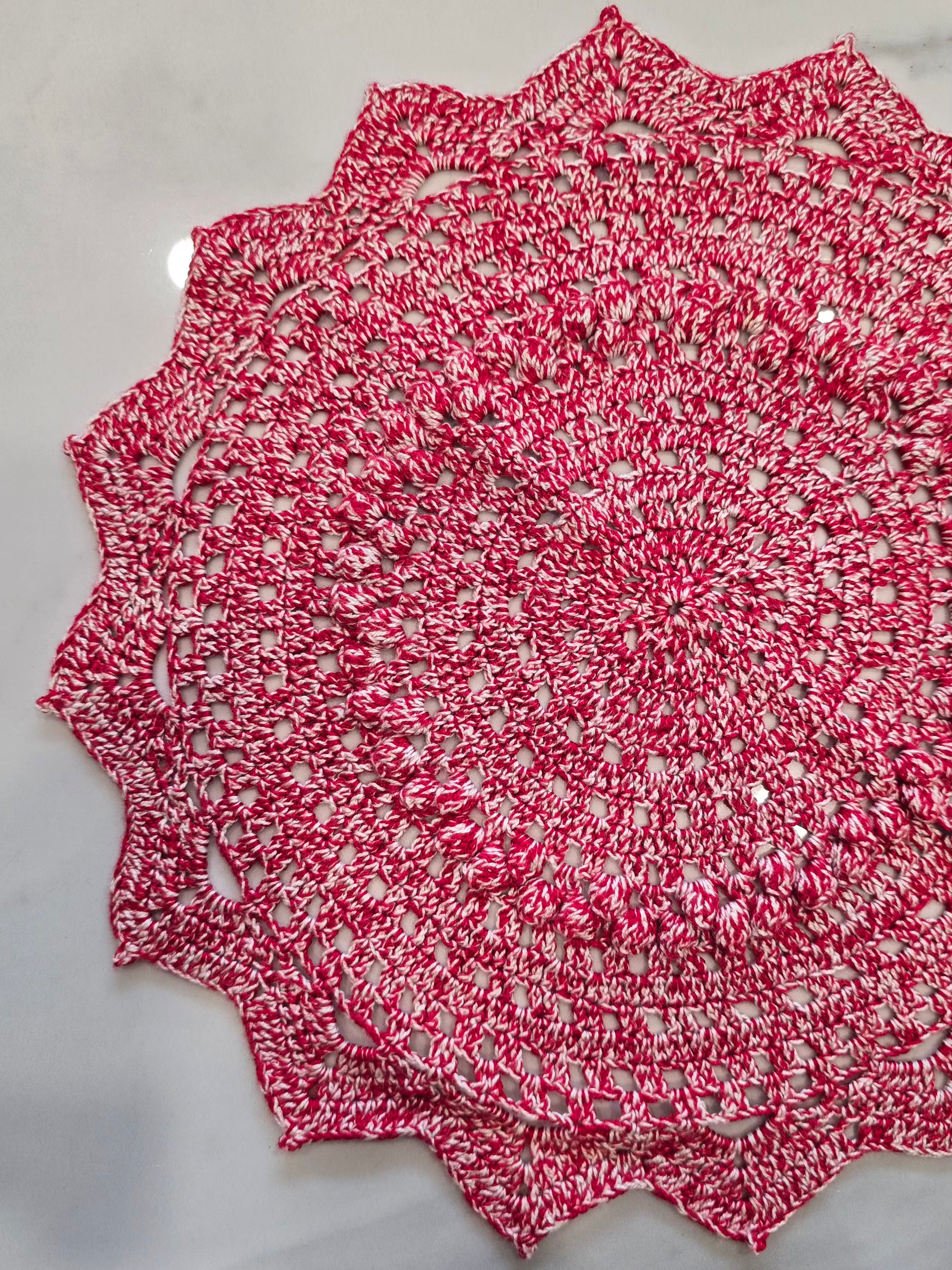 Ce napperon au crochet en forme de rosace, réalisé à la main, se distingue par son joli fil bicolore rouge et blanc. Son motif délicat et ajouré apporte une touche artisanale et raffinée à votre décoration.